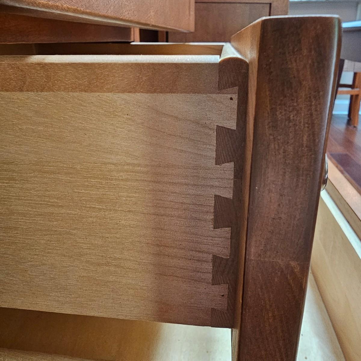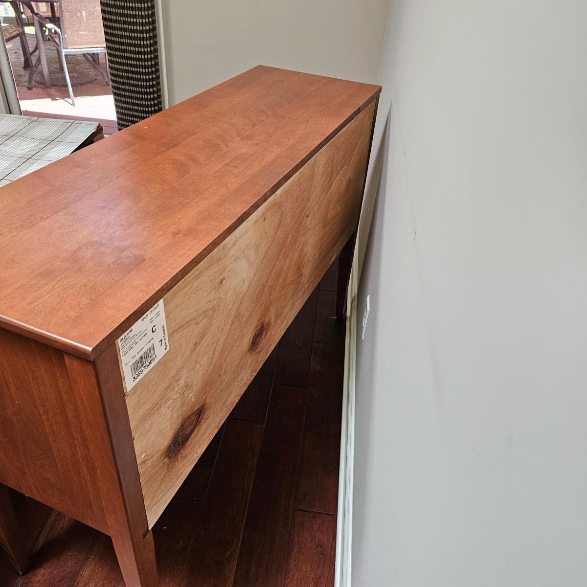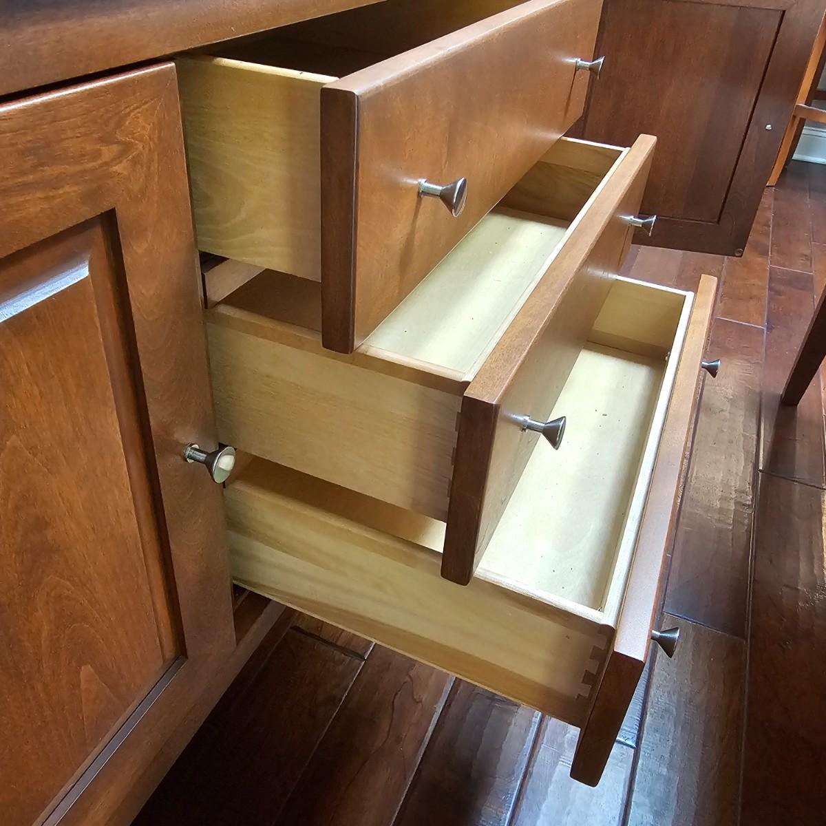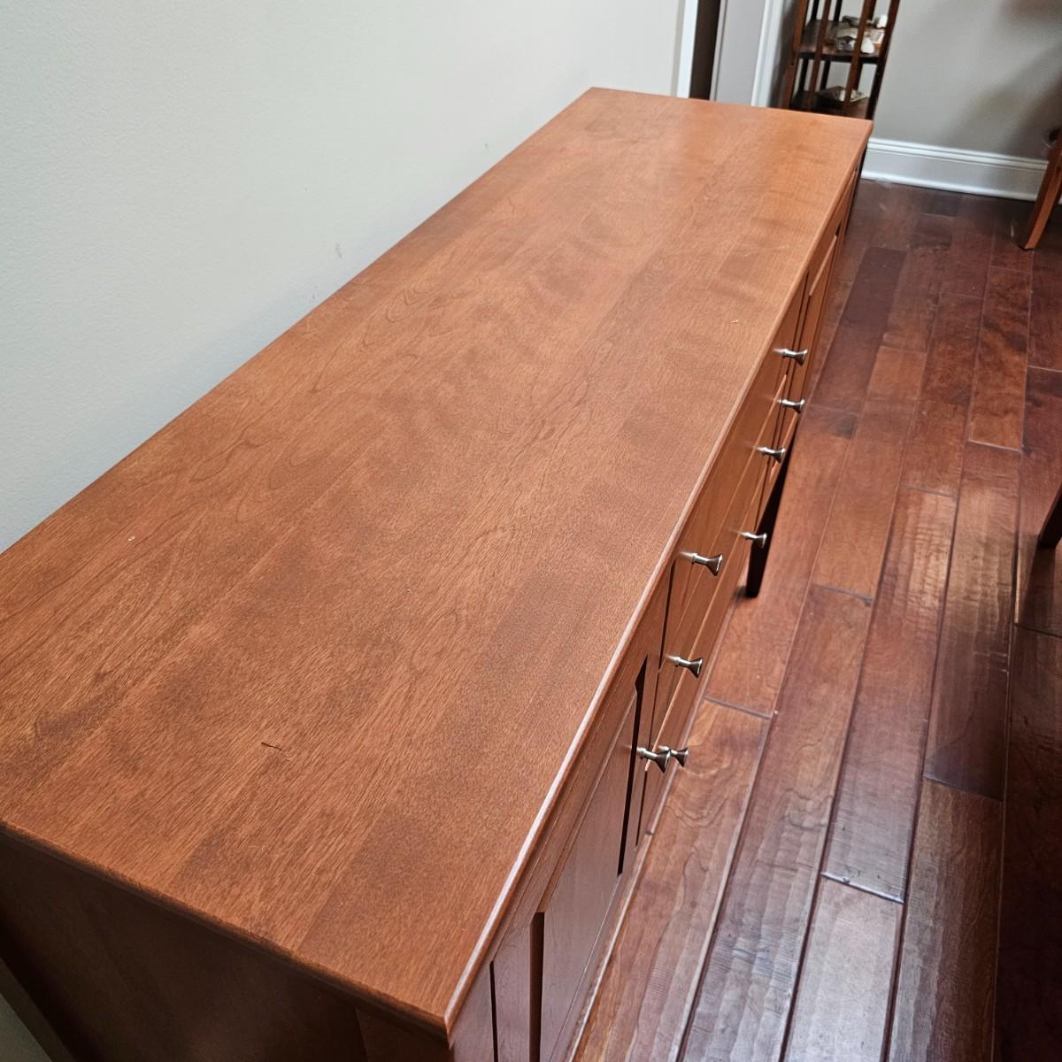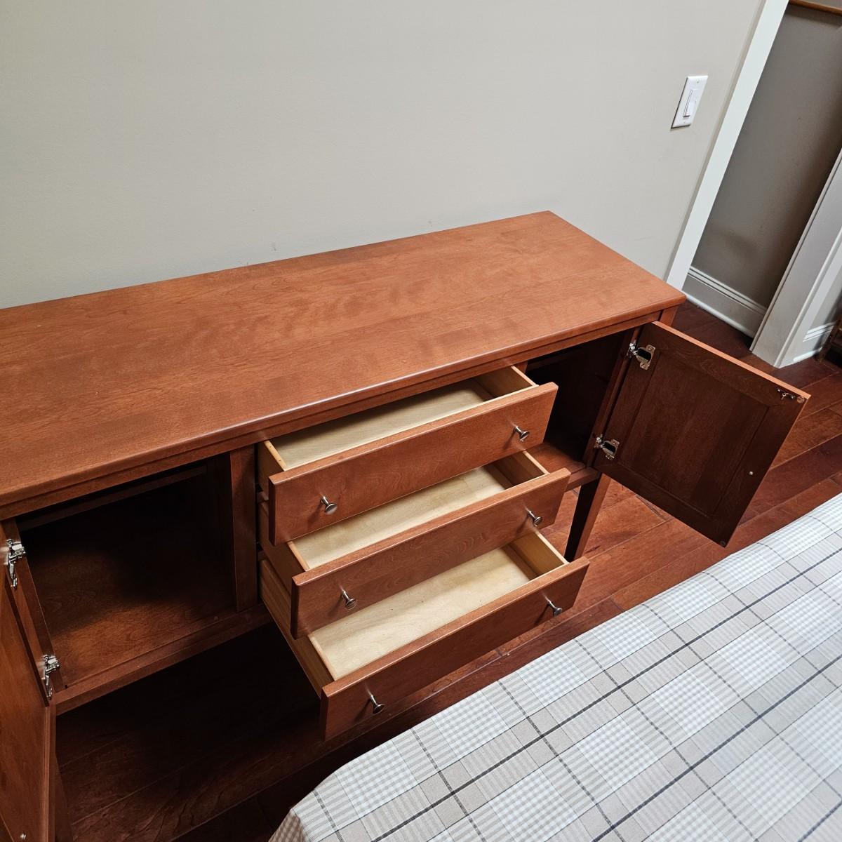 Solid wood sideboard or buffet for the dining room by Canadel of Canada. Decorative side door compartments with shelf inside, three center drawers with dovetail joints. Piece measures 54"x 17" x 36.5"H. See photos for details. Local pickup only. Winning bidder must bring assistance to help move and load this item due to its weight and/or size. Item will need to be moved down three steps.