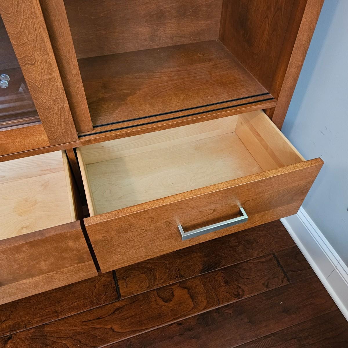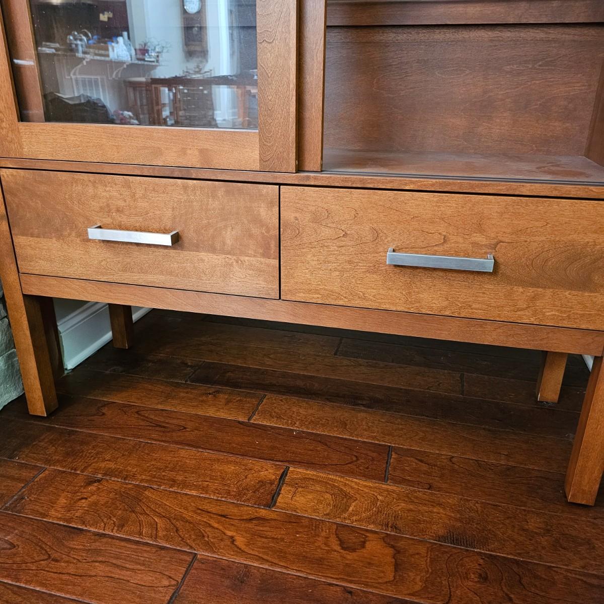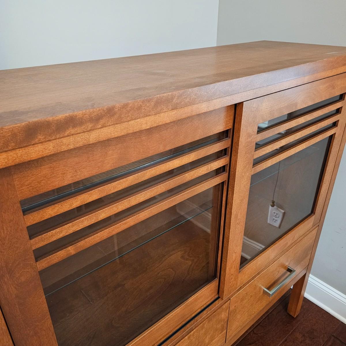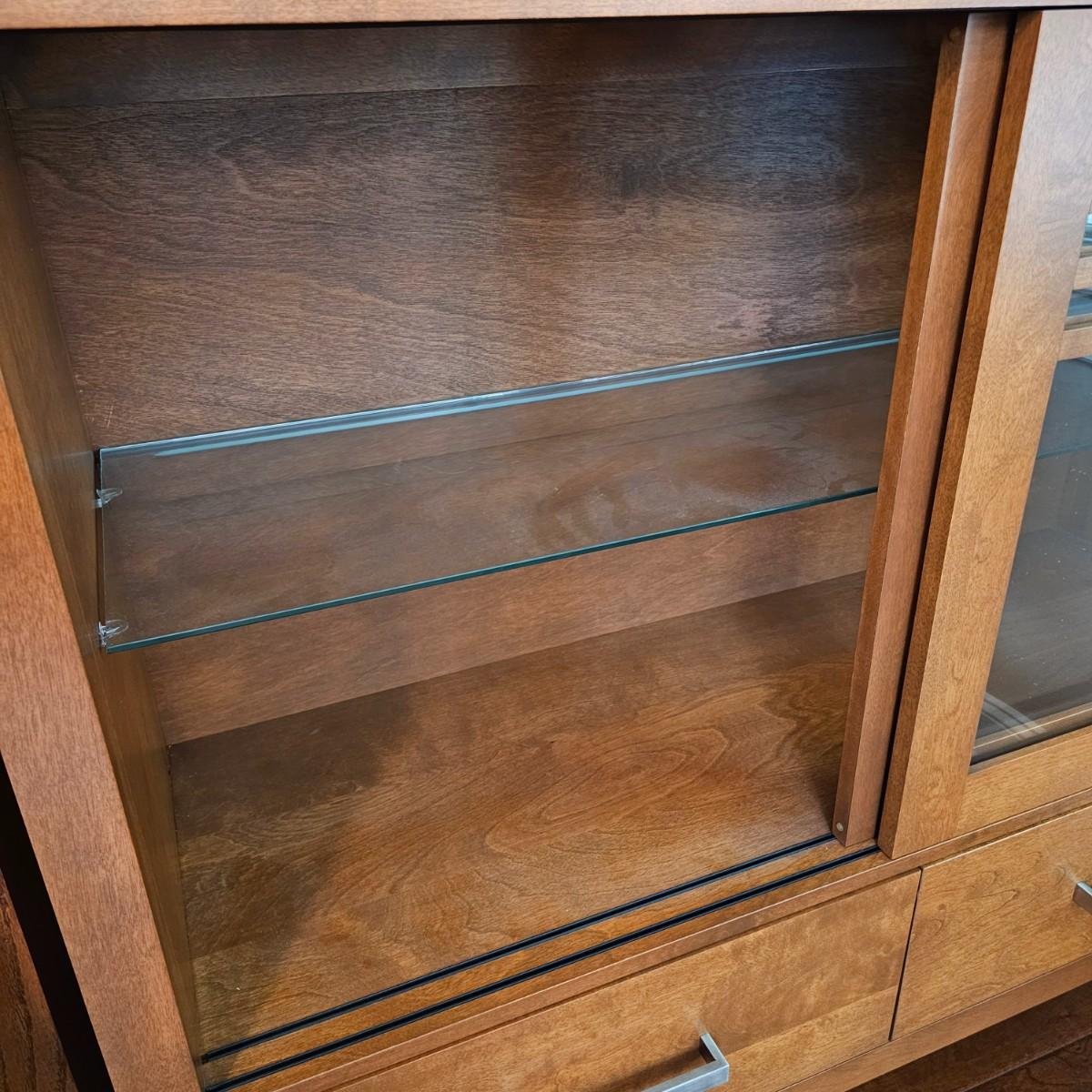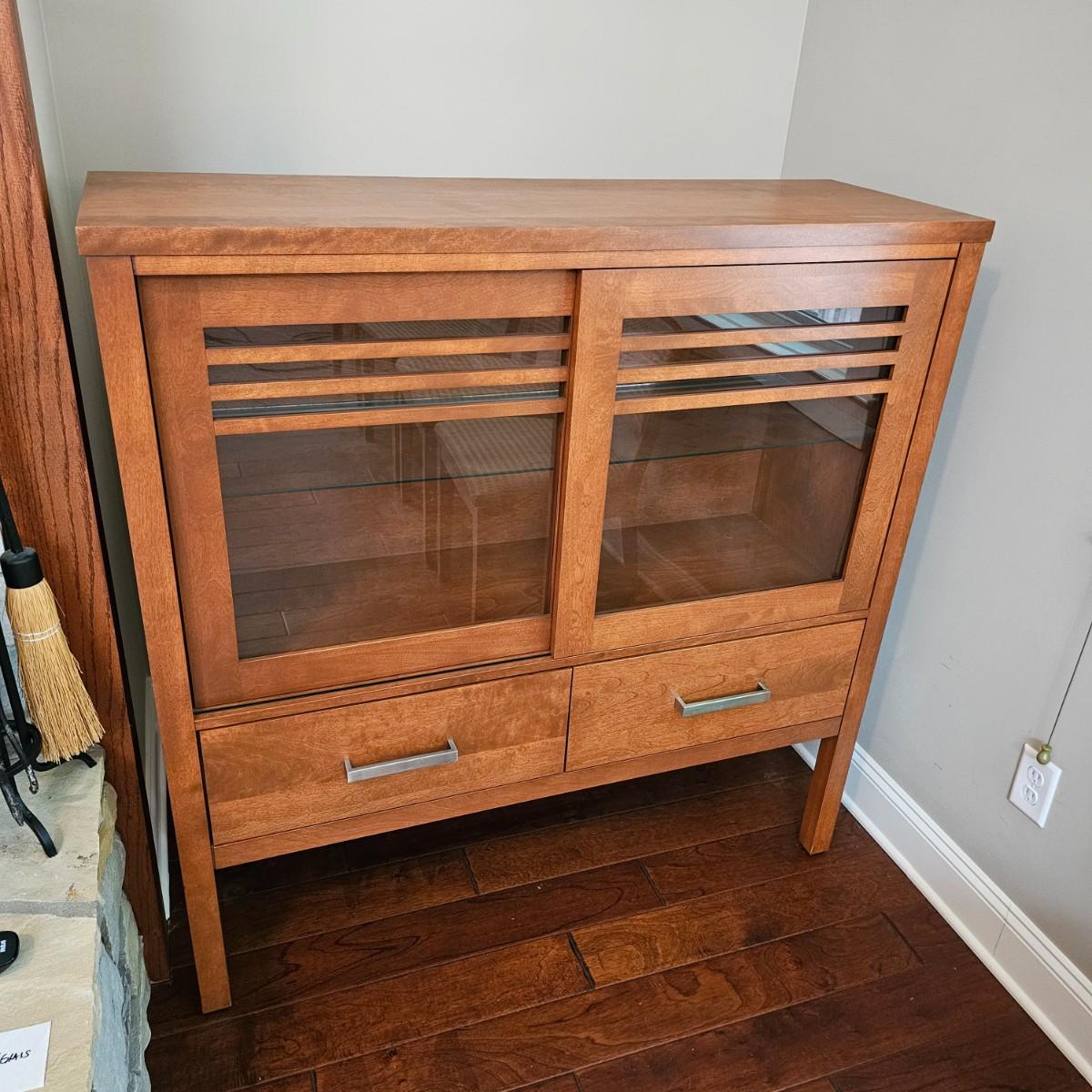 Sliding glass doors, a glass shelf and two storage drawers on this solid wood piece. Glass shelf in top has plate rack groove in back. Drawers have dovetail joints and adjustable leveling legs, wrench included. See photos for details. Piece measures 48” x 16” x 49”H. Local pickup only. Winning bidder must bring assistance to help move and load this item due to its weight and/or size.