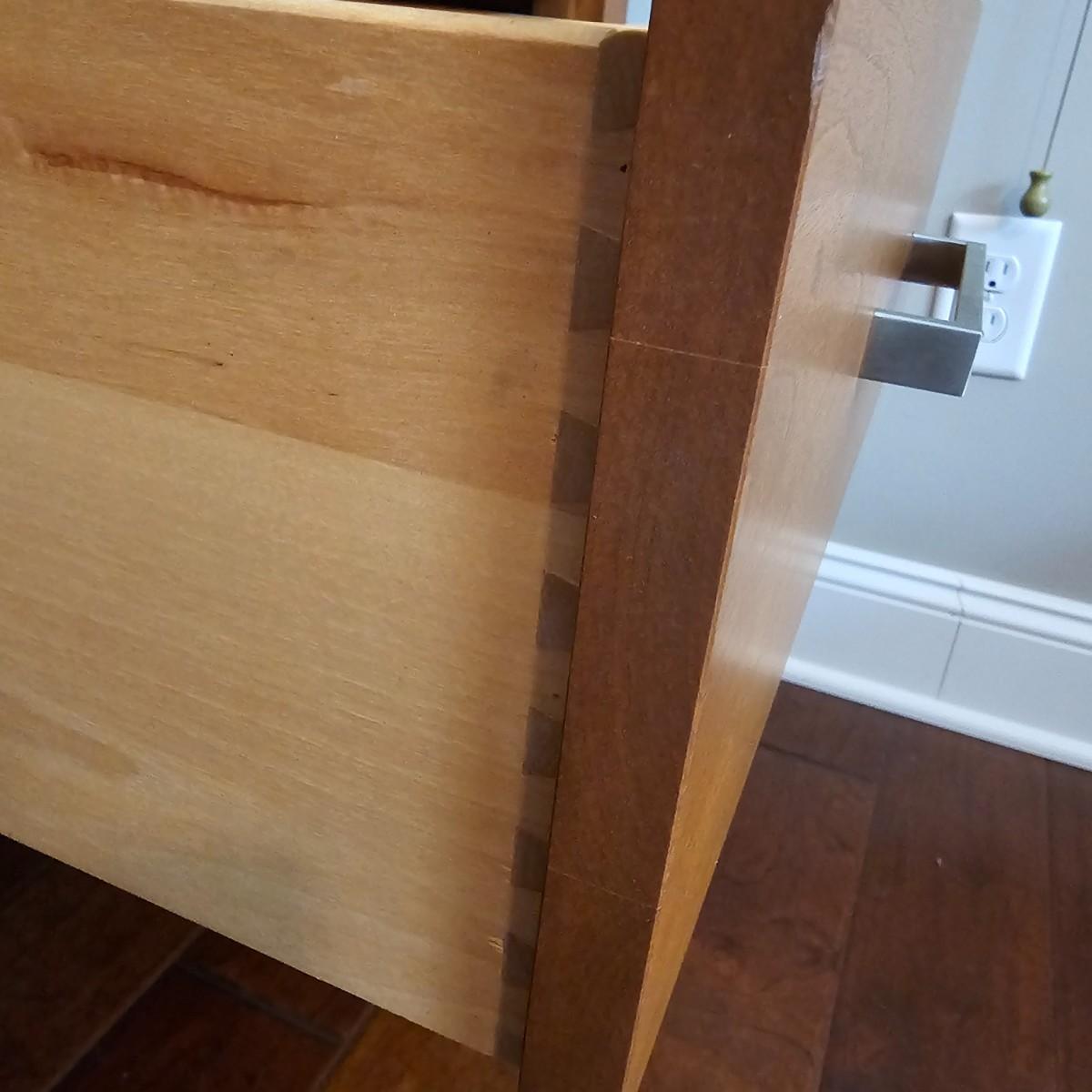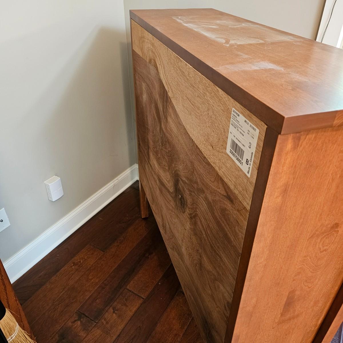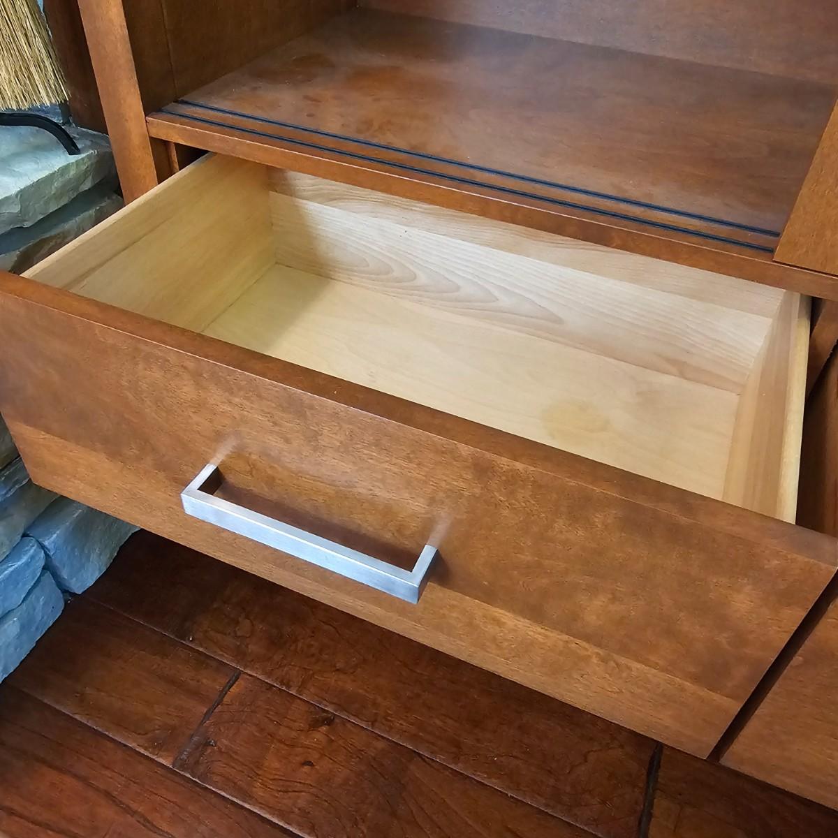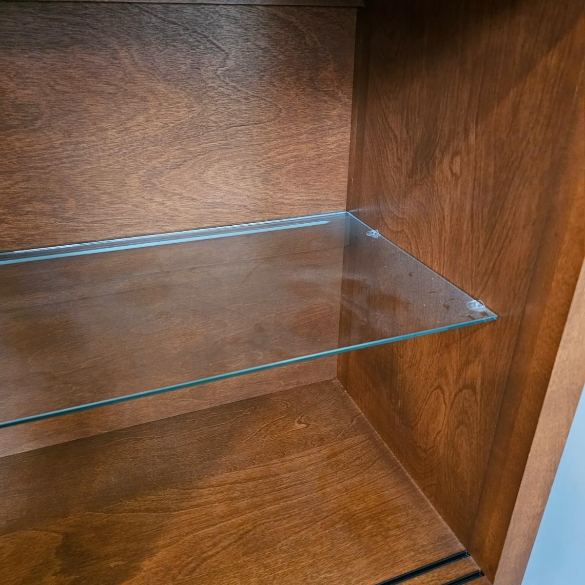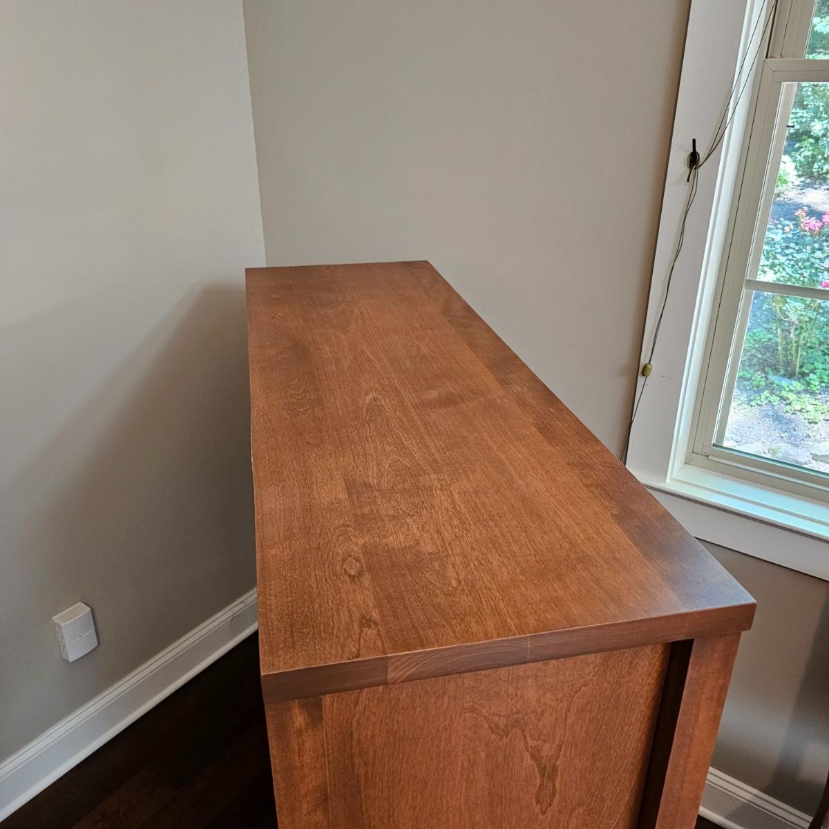 Sliding glass doors, a glass shelf and two storage drawers on this solid wood piece. Glass shelf in top has plate rack groove in back. Drawers have dovetail joints and adjustable leveling legs, wrench included. See photos for details. Piece measures 48” x 16” x 49”H. Local pickup only. Winning bidder must bring assistance to help move and load this item due to its weight and/or size.