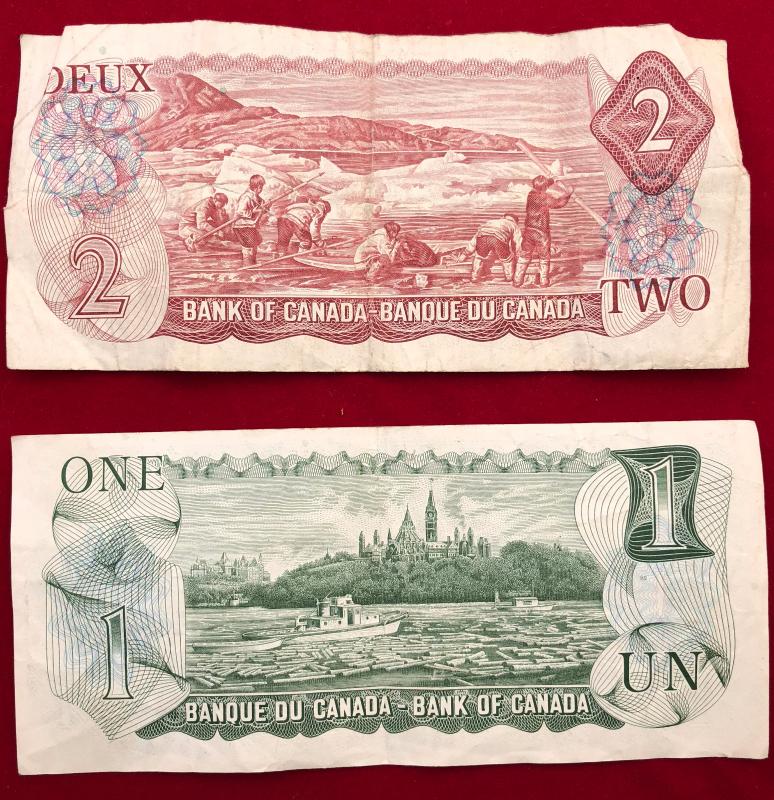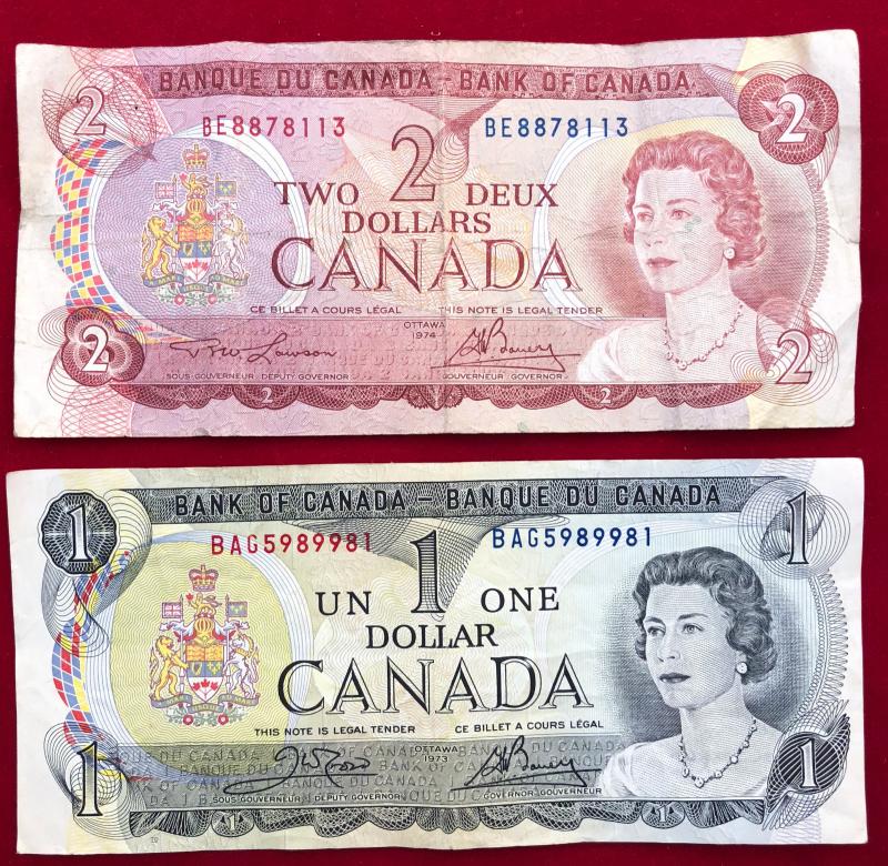 Canadian Currency $1 and $2 Dollar Bills Canada 1973, 1974