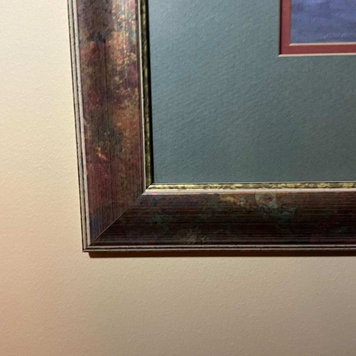 This large pretty frame measures 36” x 27”. It has a metallic, mottled finish in green and pink colors. The print of a canal scene is matted and under glass.