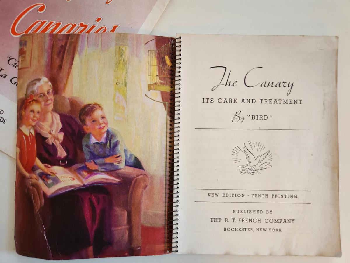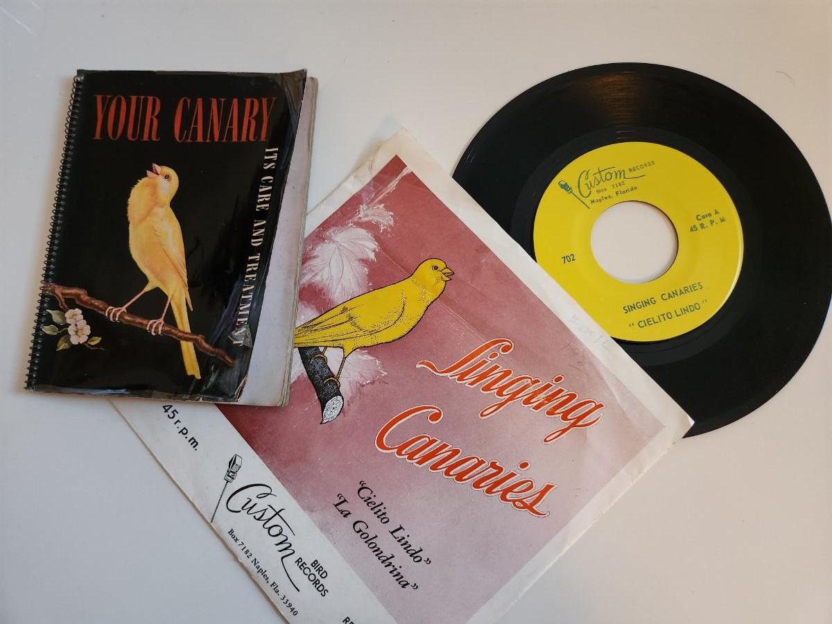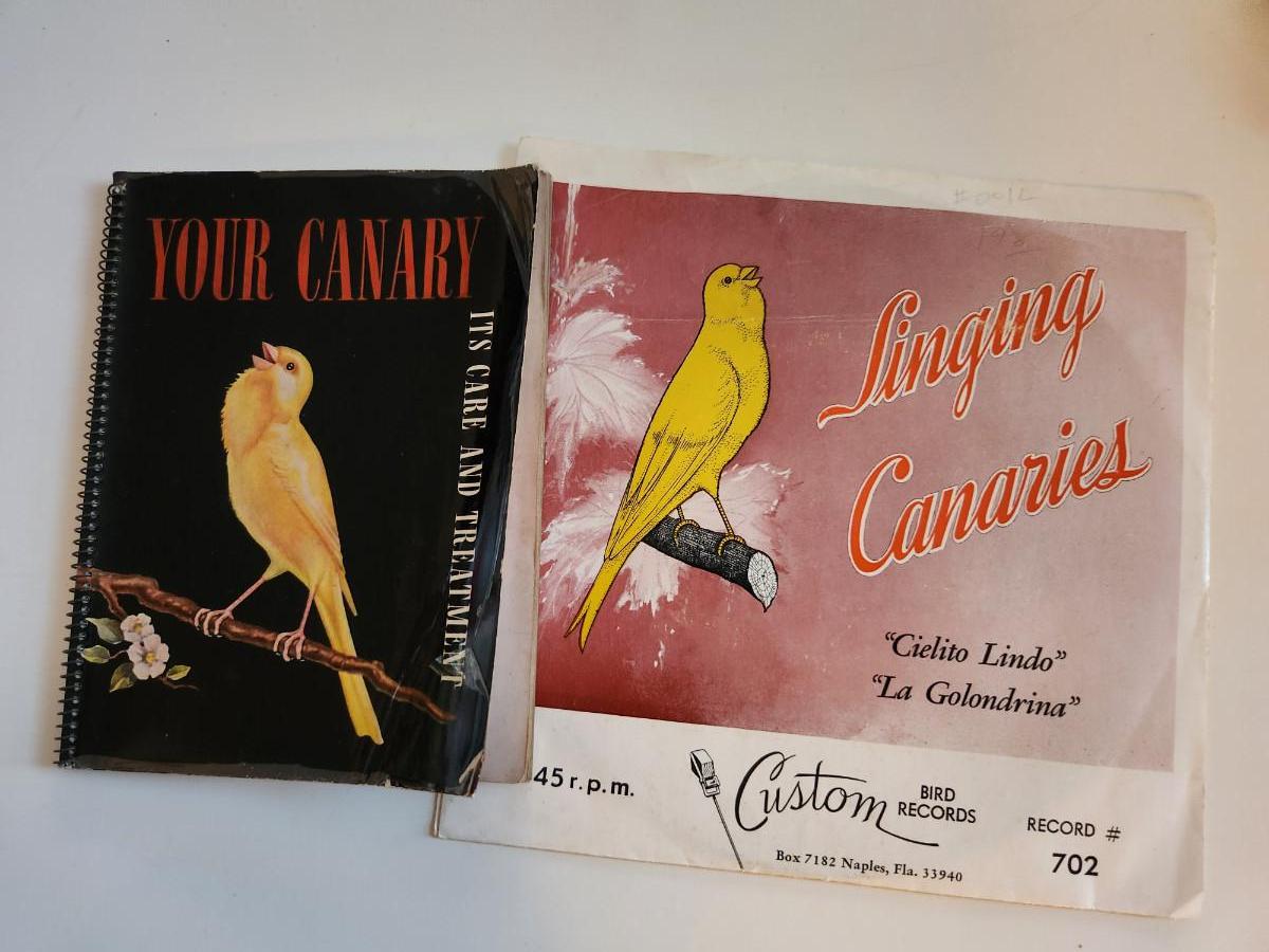 This auction lot is for a Canary Book & Record. This odd little grouping is quite the vintage find. The wirebound book of 72 pages includes raising and care information plus lots of color pictures. The record says it will help to get your bird singing and happy - along with some spiffy organ music.