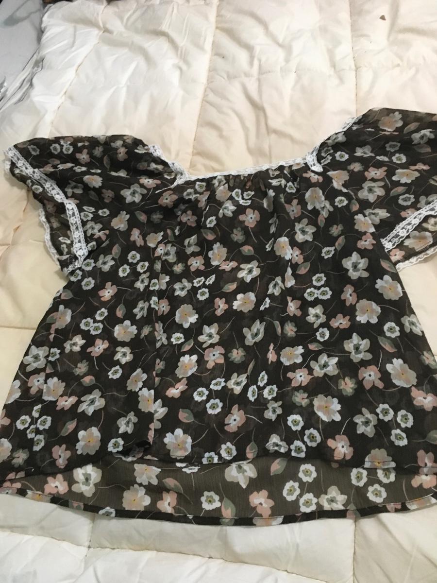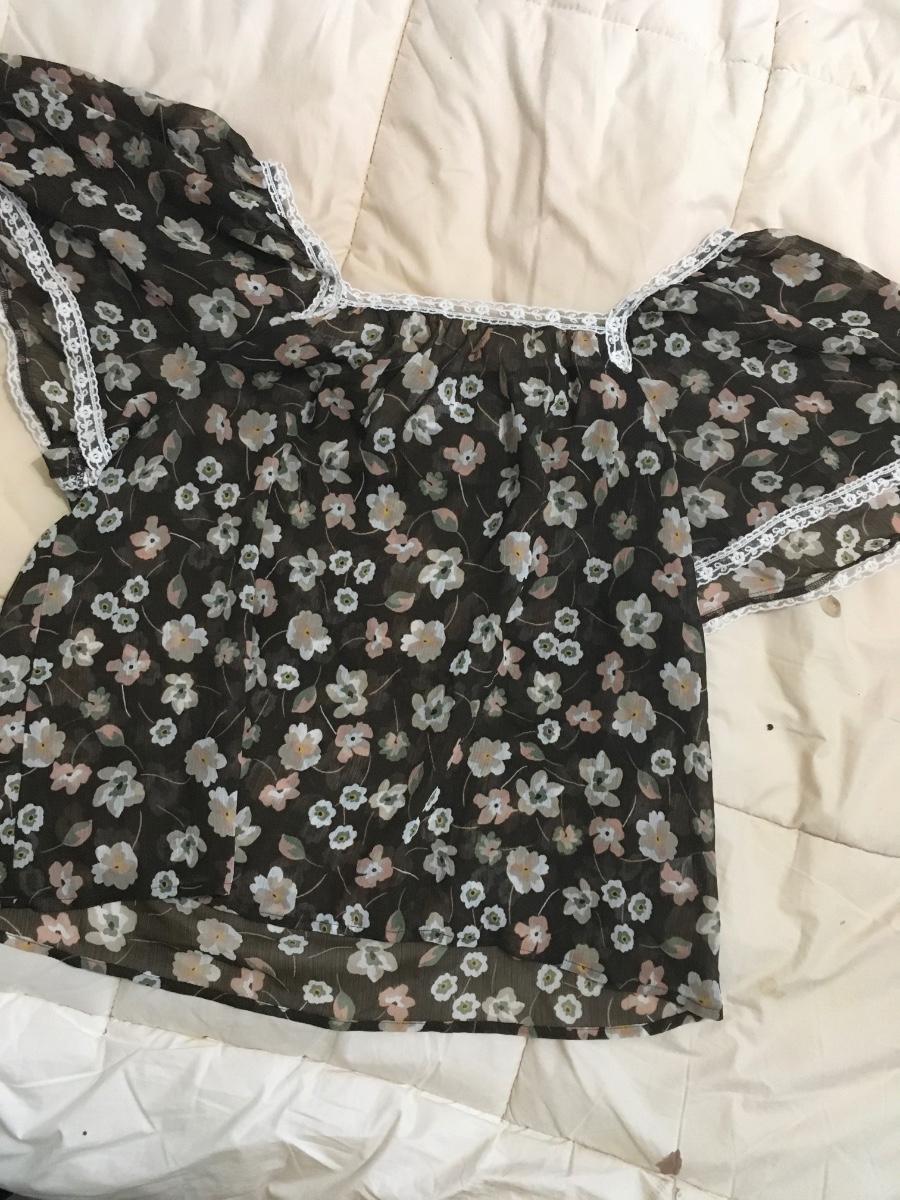 Chic blouse with floral pattern. Features delicate lace trim and ideal for casual or dressy look.