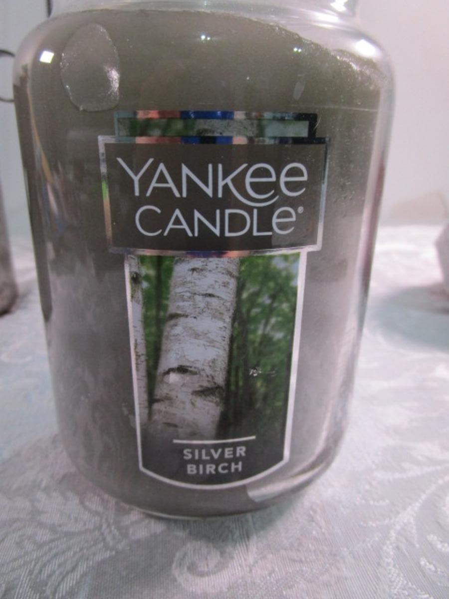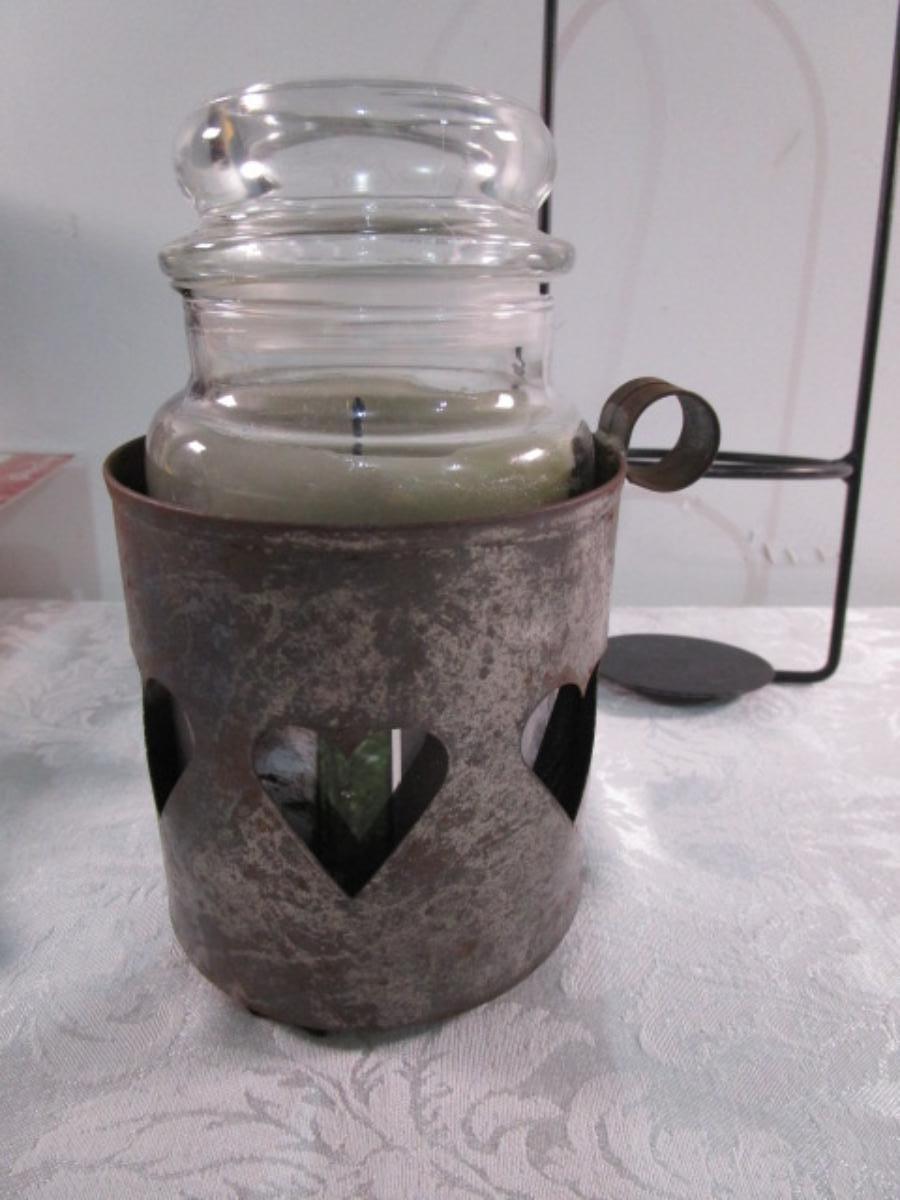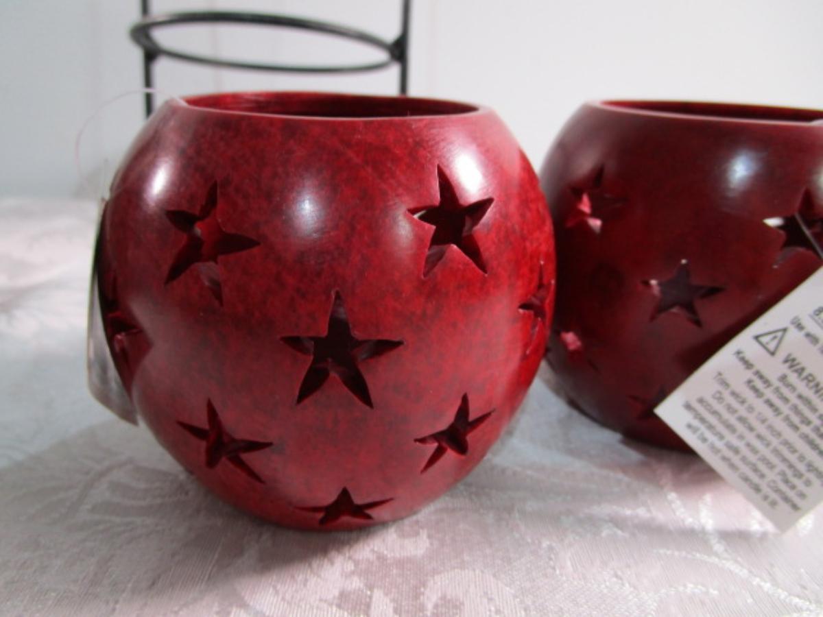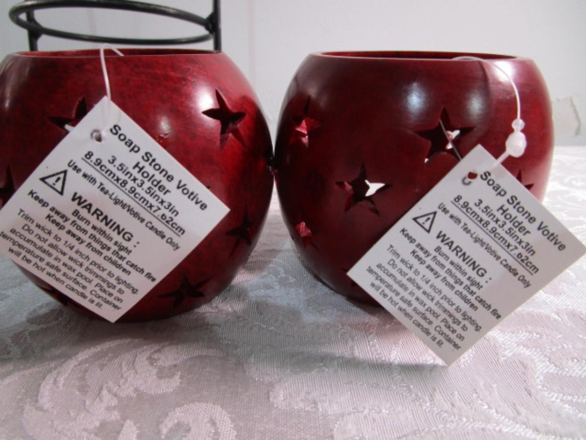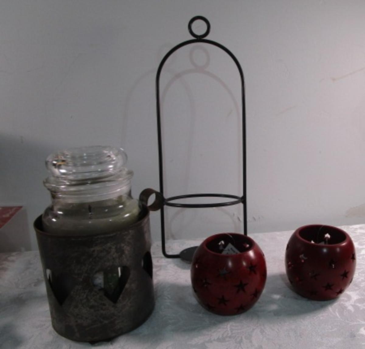 Candle is Silver Birch, red candle holders are new with tags, 1 wire candle holder, 1 distressed metal candle holder