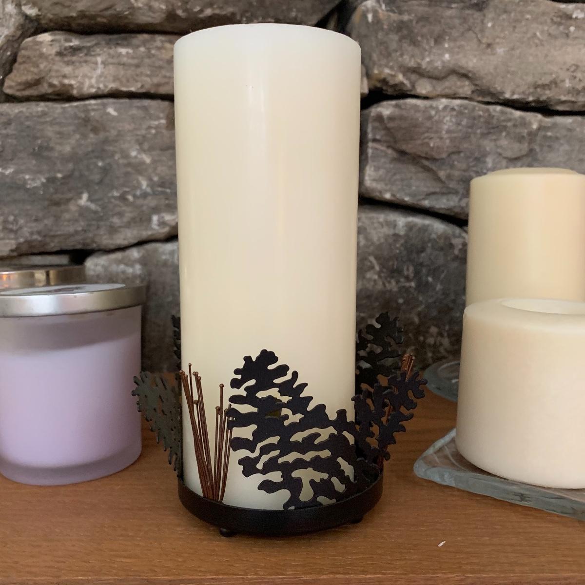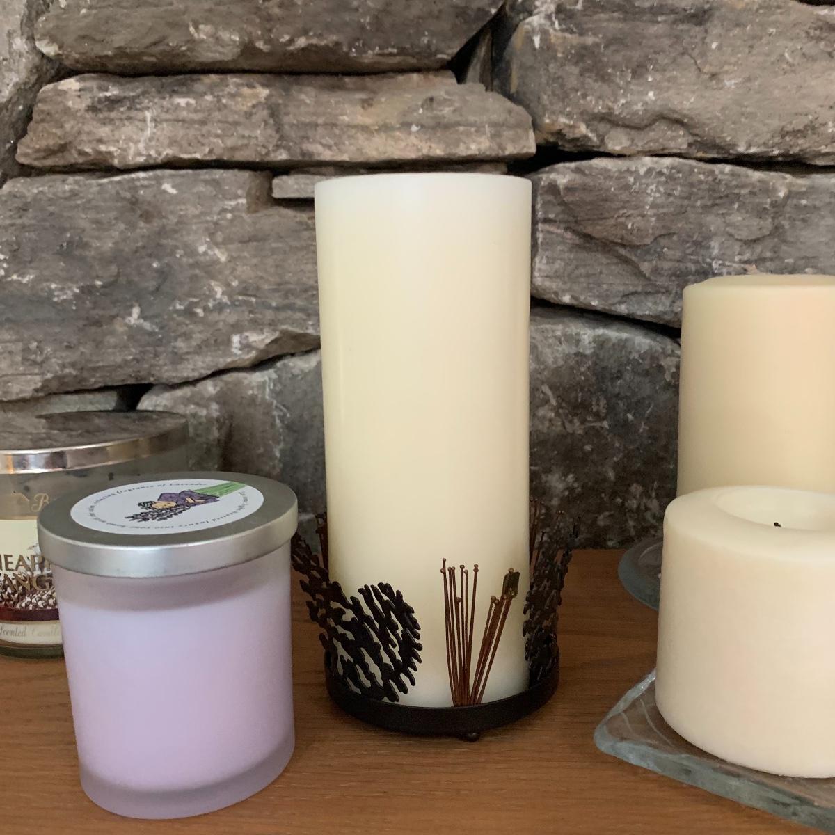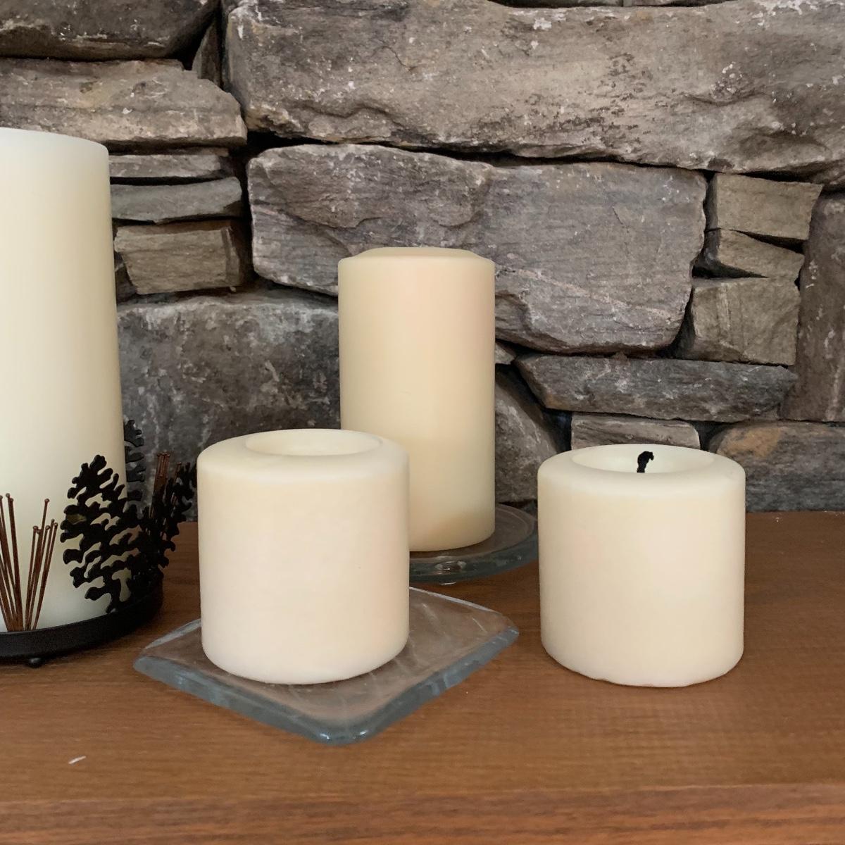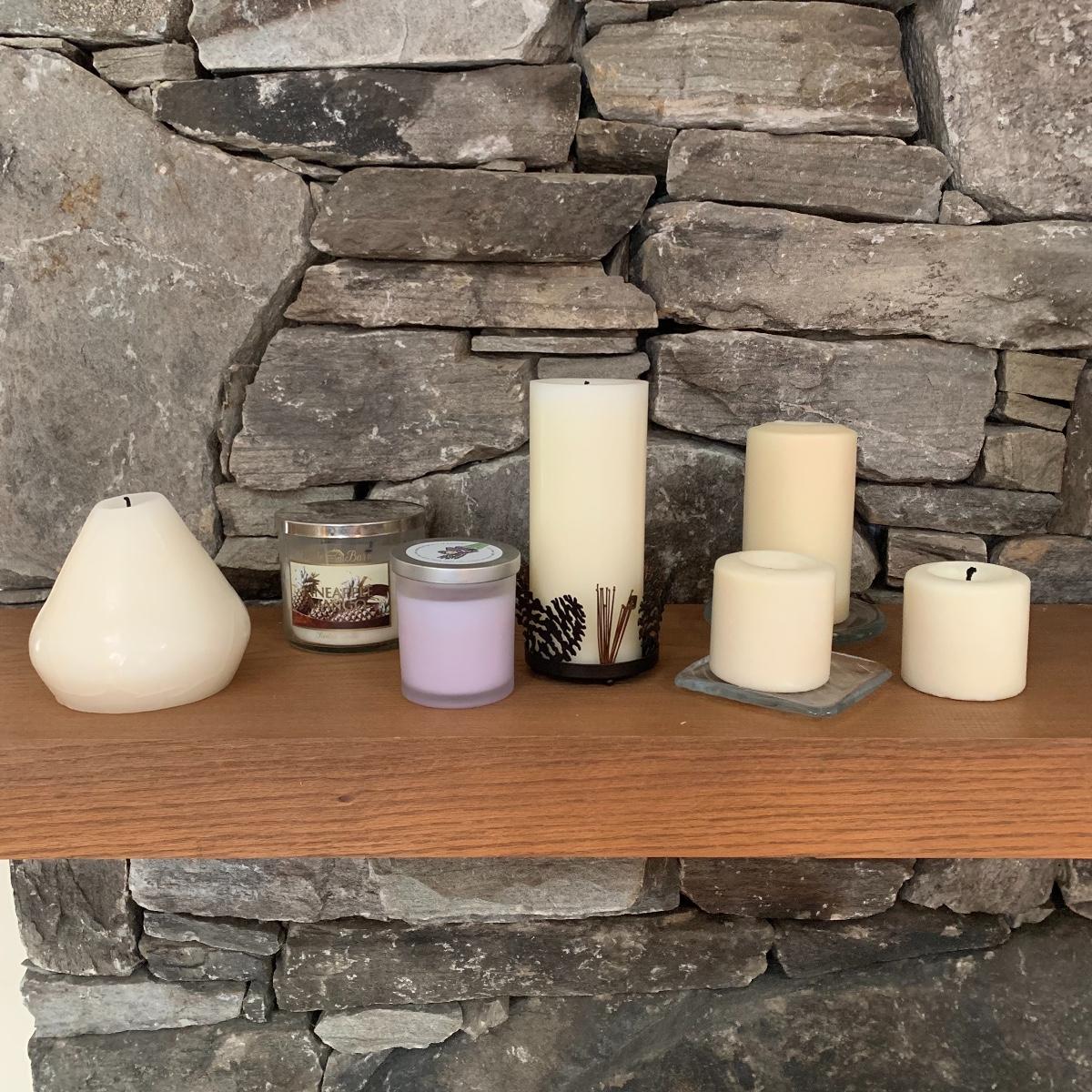 This lot includes seven candles of different sizes (the tallest is 7”). Two small glass trays are also included. Local pickup only.