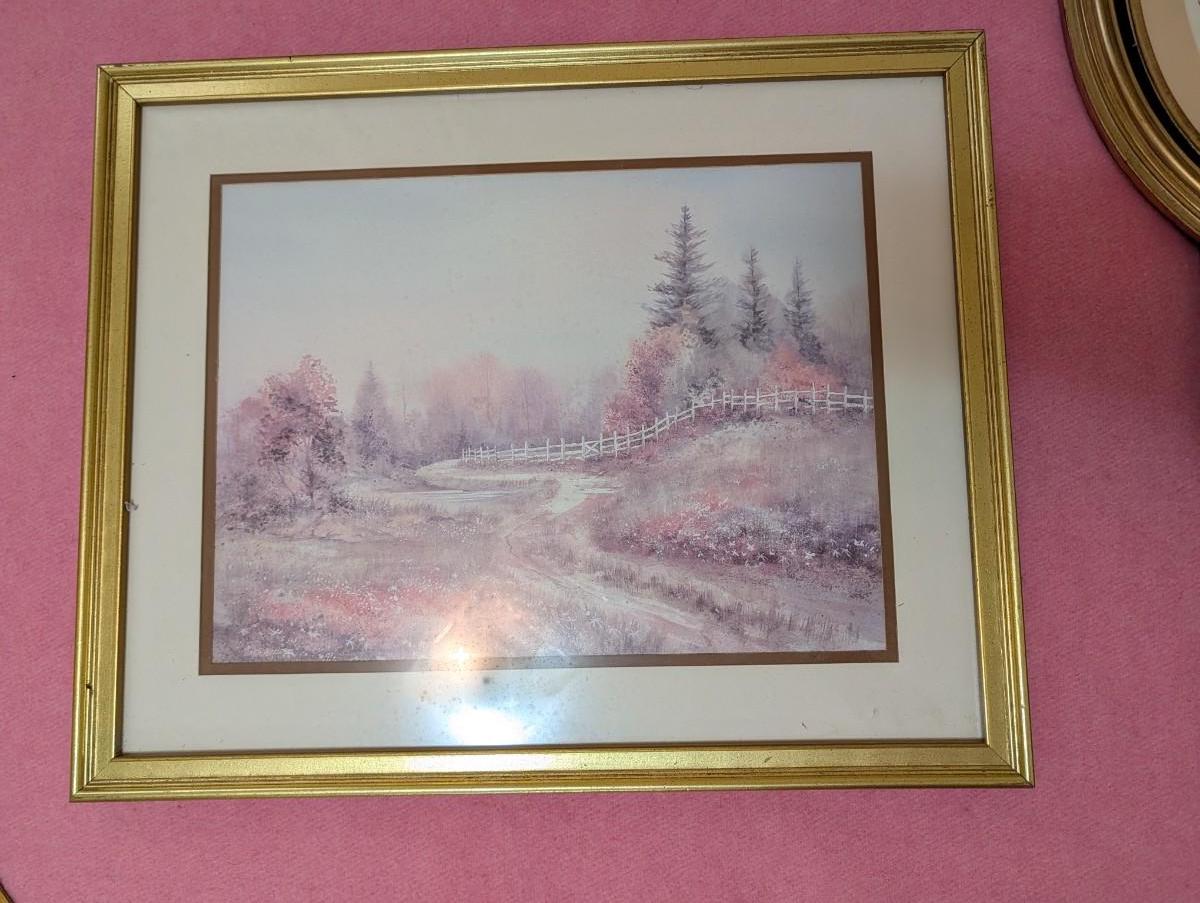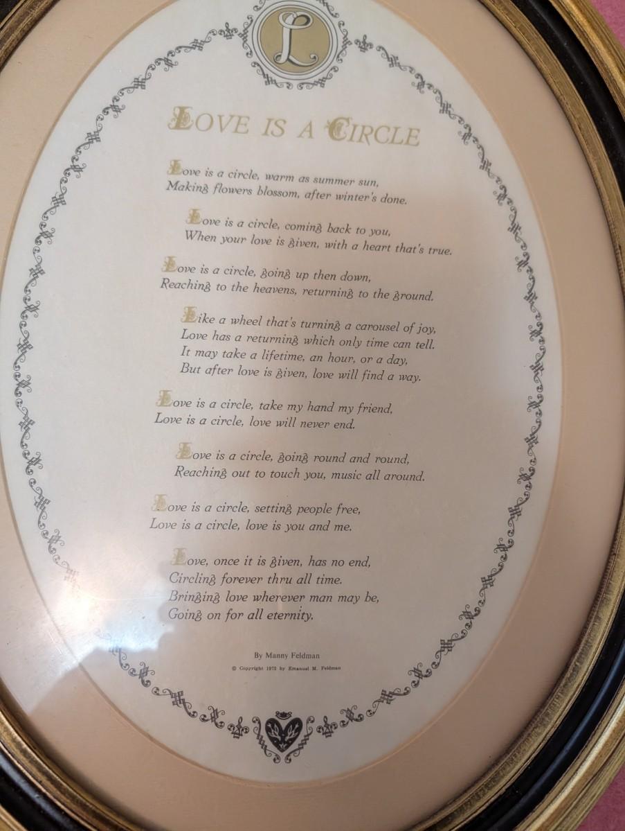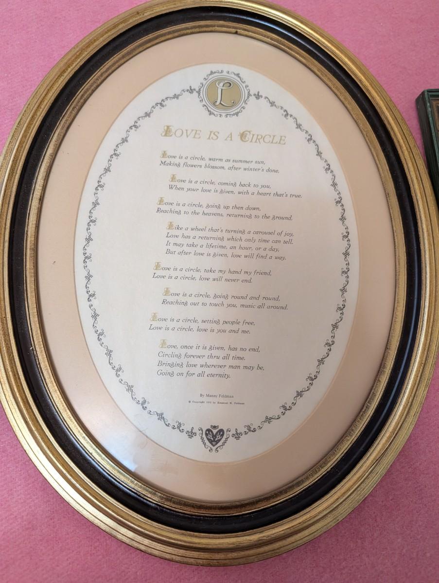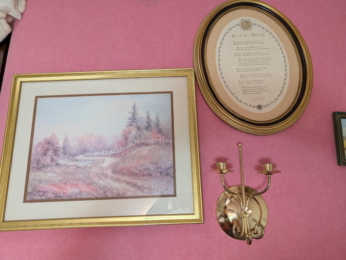 Framed beautiful outdoor scene, framed "Love is a Circle" poem, wall hanging candle holder.
