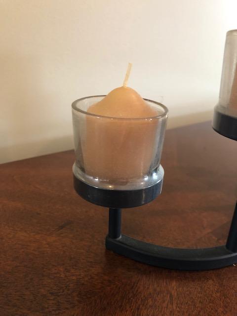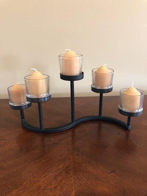 Base is 11” long. Each candle holder is 2” tall and 2” in diameter. Tallest candle is 7” to top. Middle is 5 1/2” and shortest is 4” Candles included.