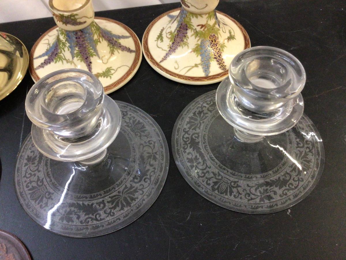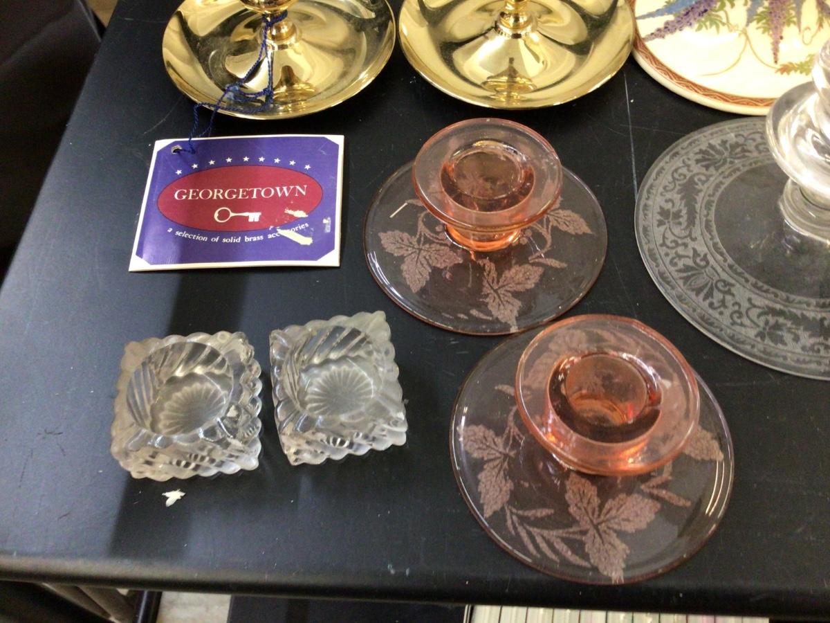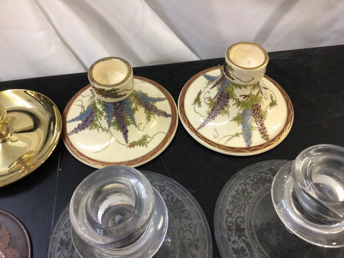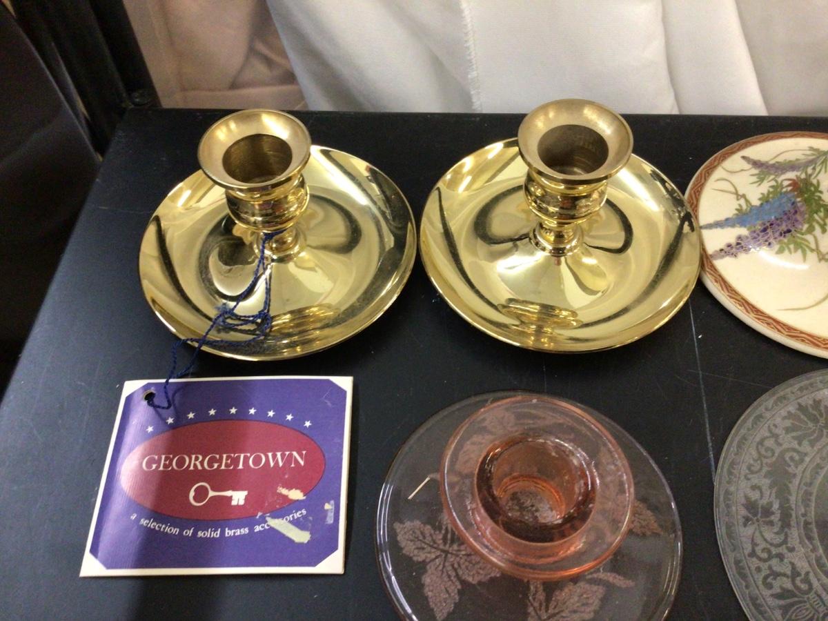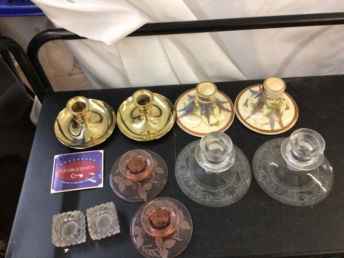 You get 5 sets of two candle holders. There are brass set, pink glass set, pottery with purple flowers, clear etch set, and clear cut glass square set.