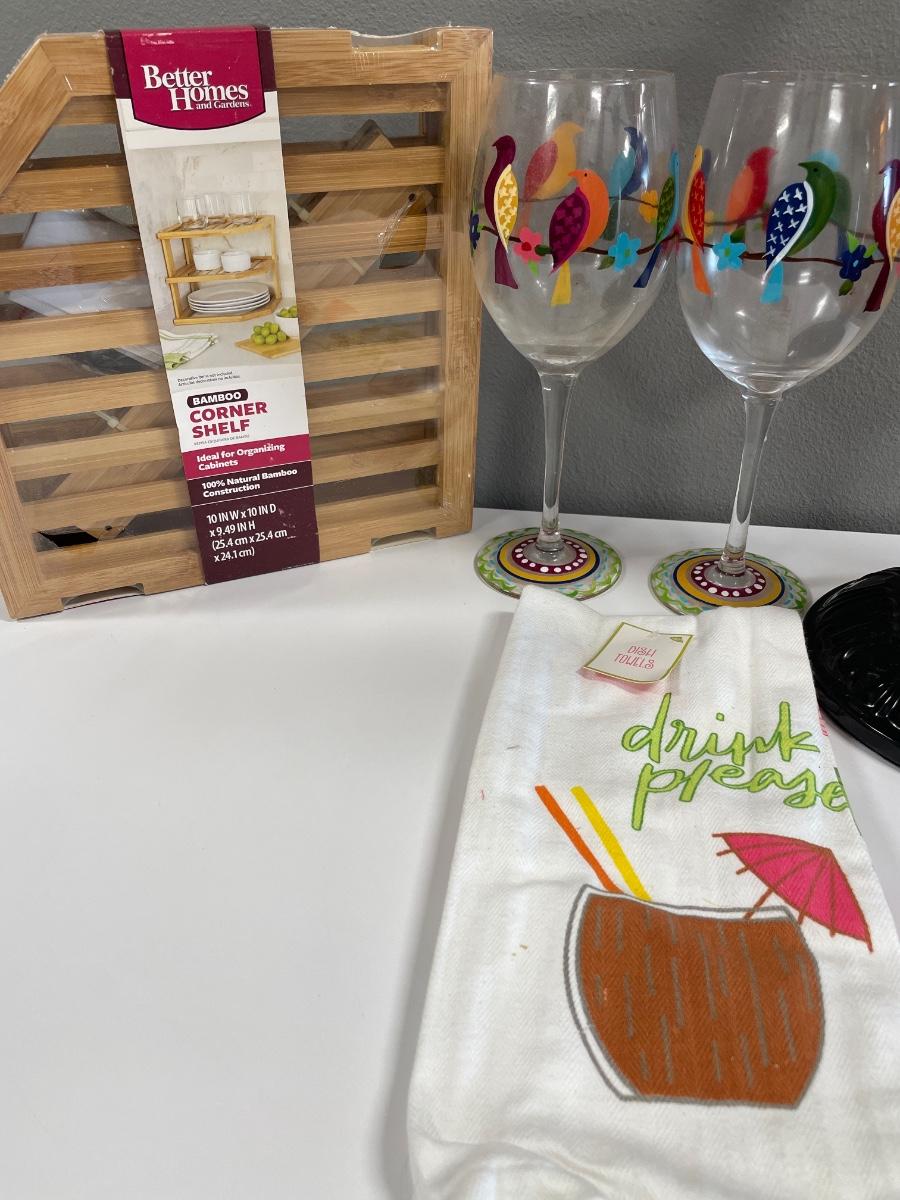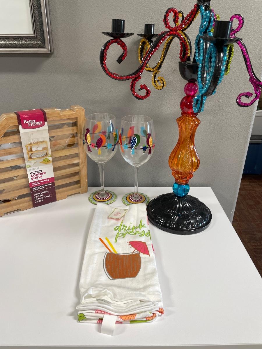 Candle holder, wine glasses, towels & shelf