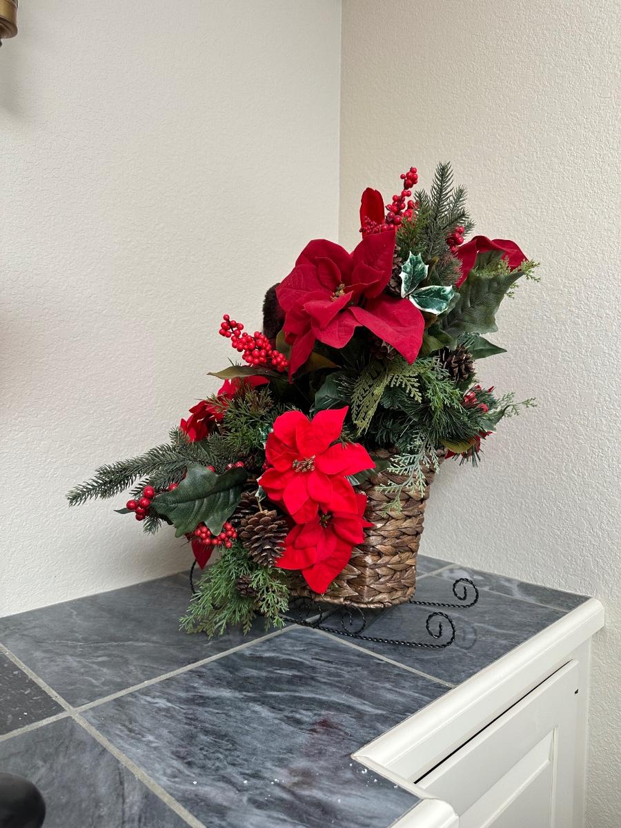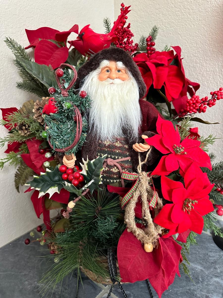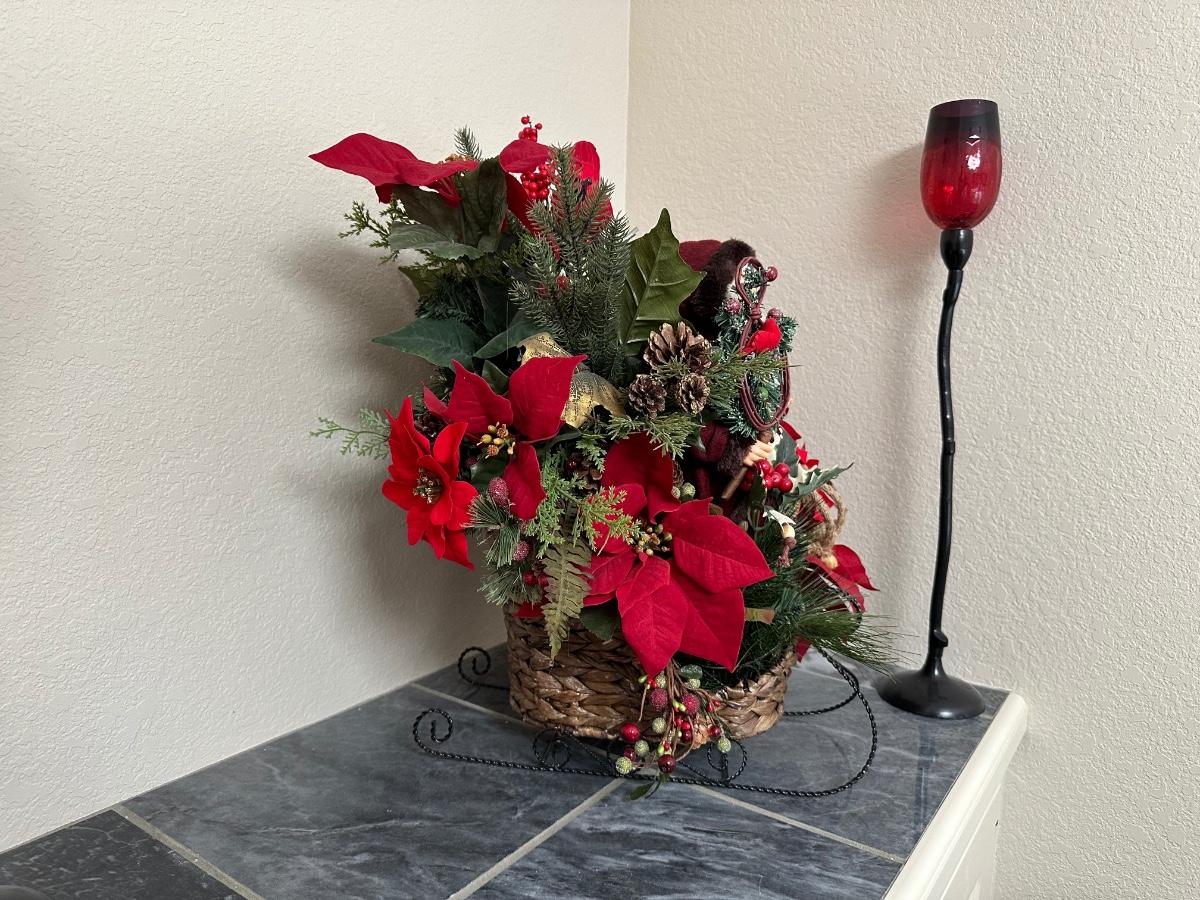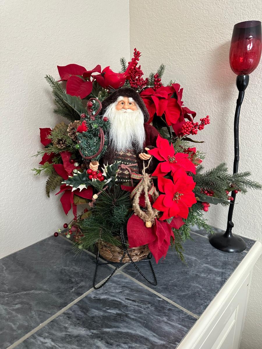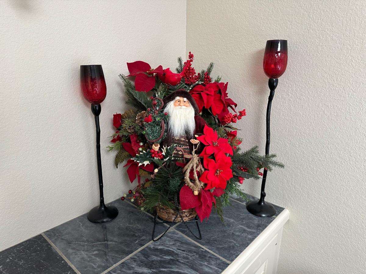 CANDLE HOLDERS AND SANTA IN FLORAL SLEIGH BASKET