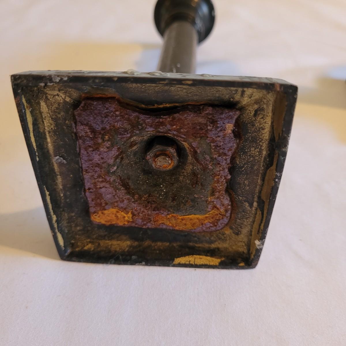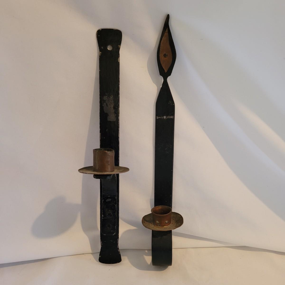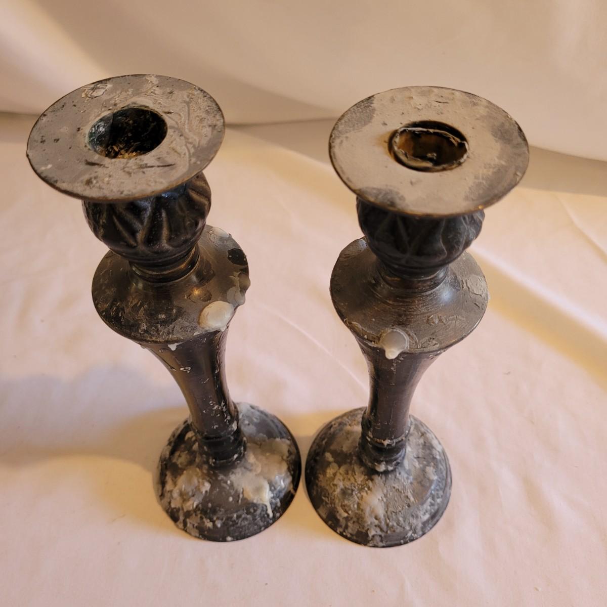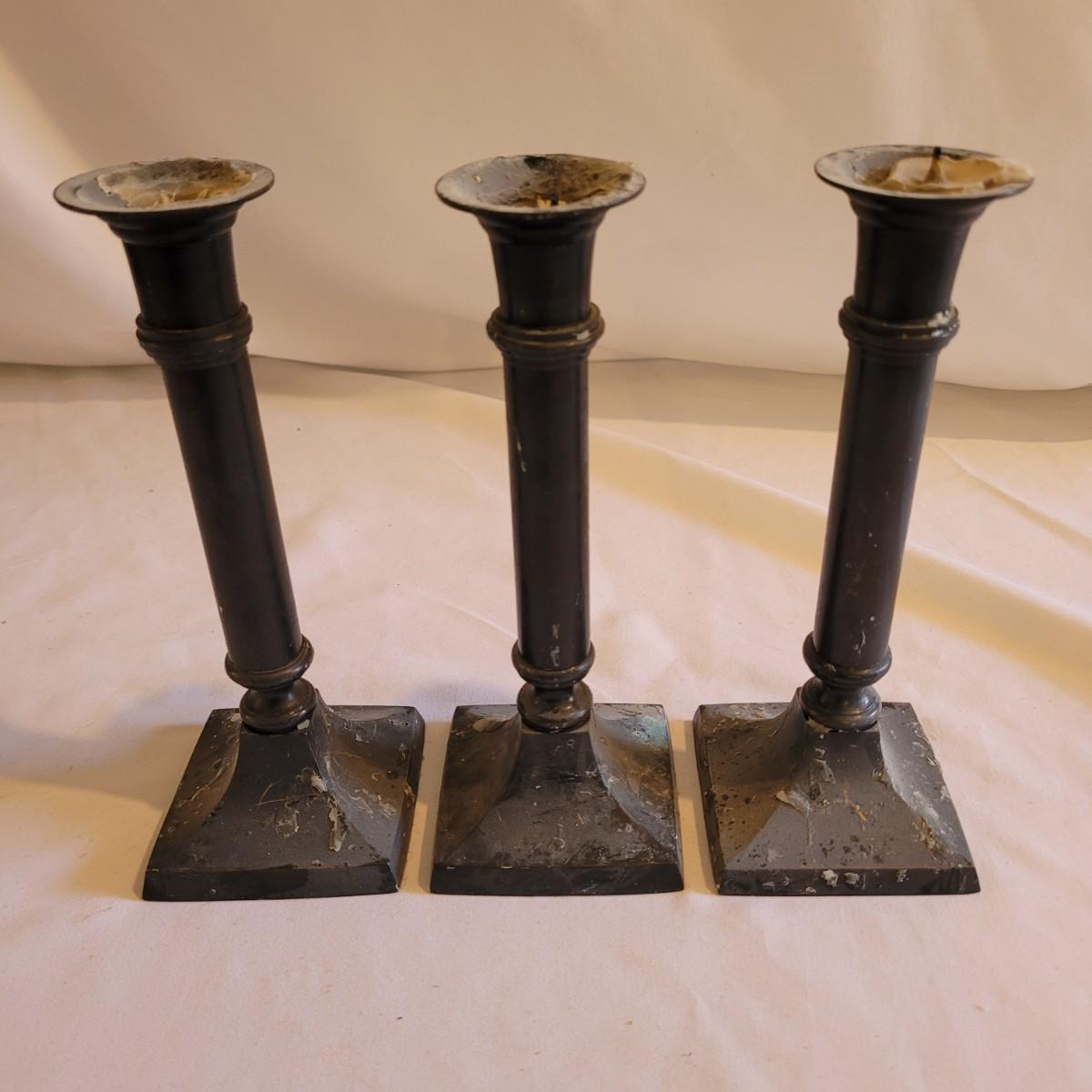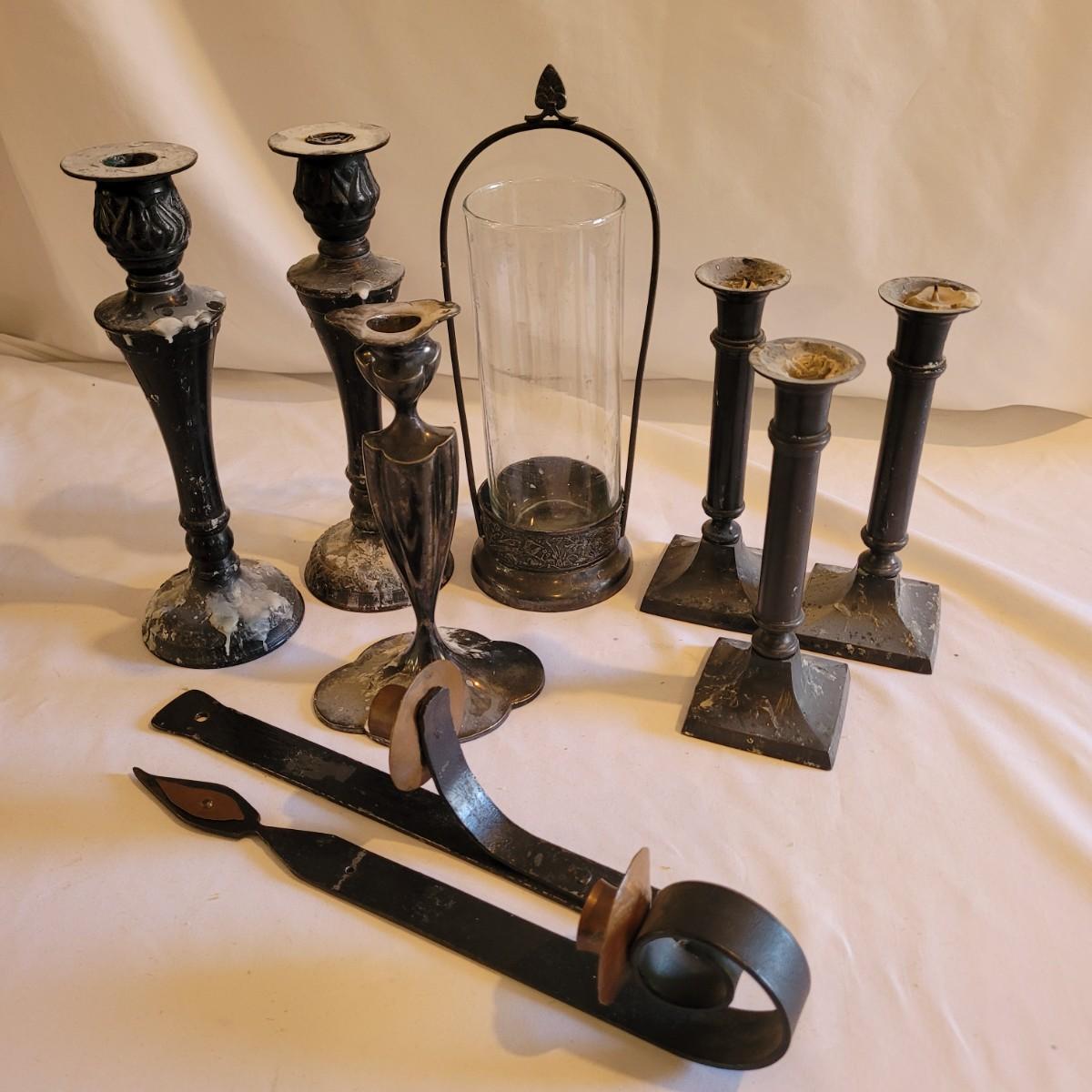 This lot includes nine candle holders. Some are matching and some are individual. There is one set of two and another set of three matching. All holders are made from metal with one featuring a glass wind protector. Two of the holders are wall mounted sconces. Most of the holders have wax residue on them. The tallest holders measure 4" x 4" x 10"H.