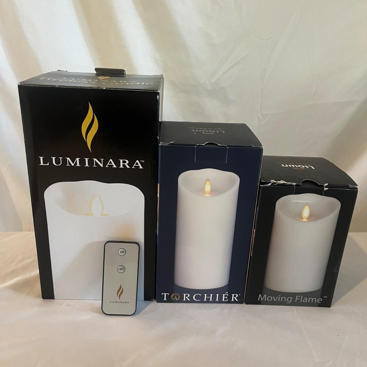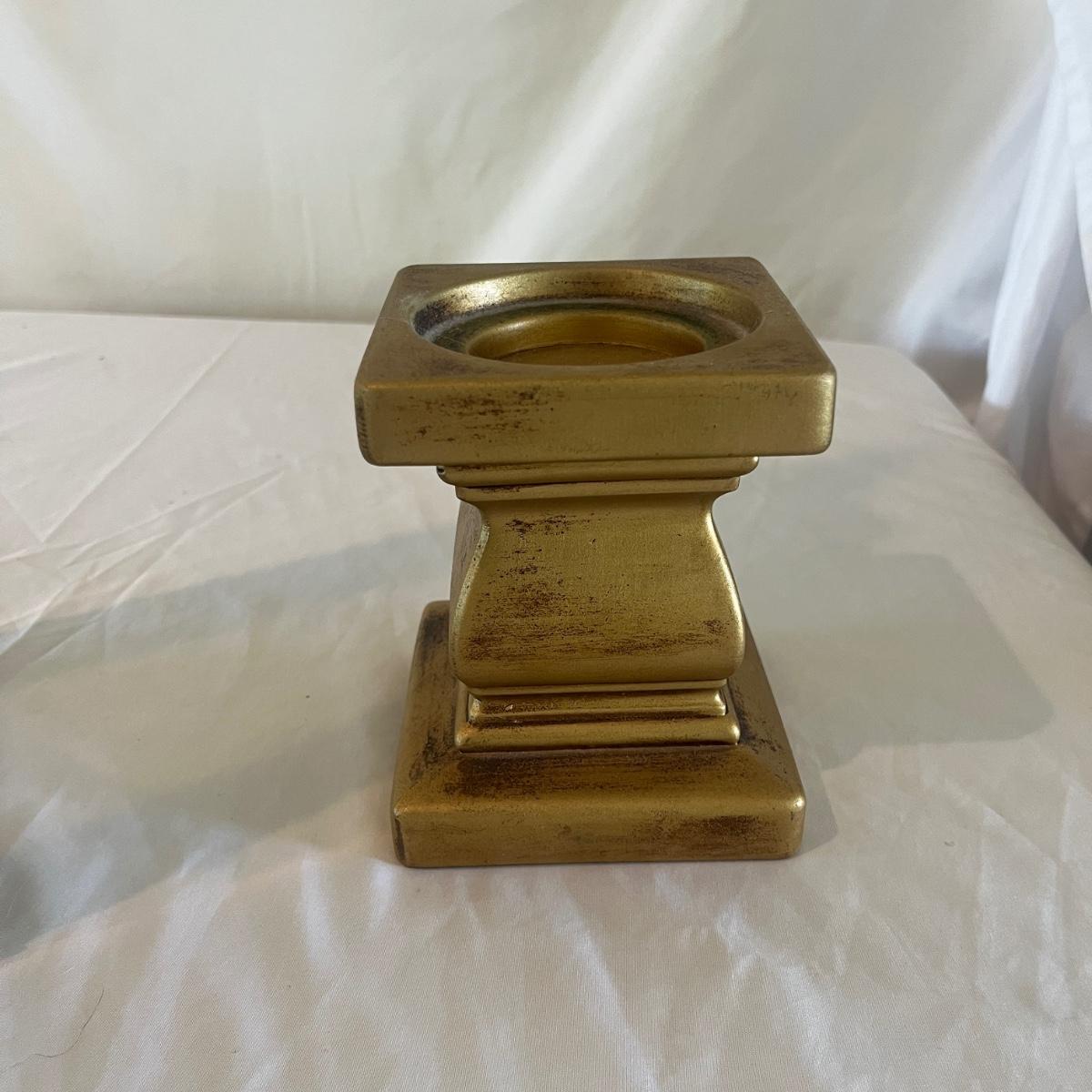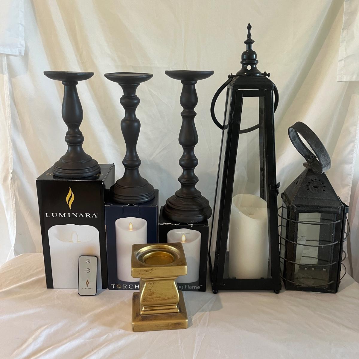 Lot includes four battery powered candles, two metal and glass candleholders and three resin candle stands and one ceramic gold candle stand Tallest piece measures 6” x 6” x 22”H. The battery powered candles could not be tested (C batteries required) but the terminals look clean and functional.