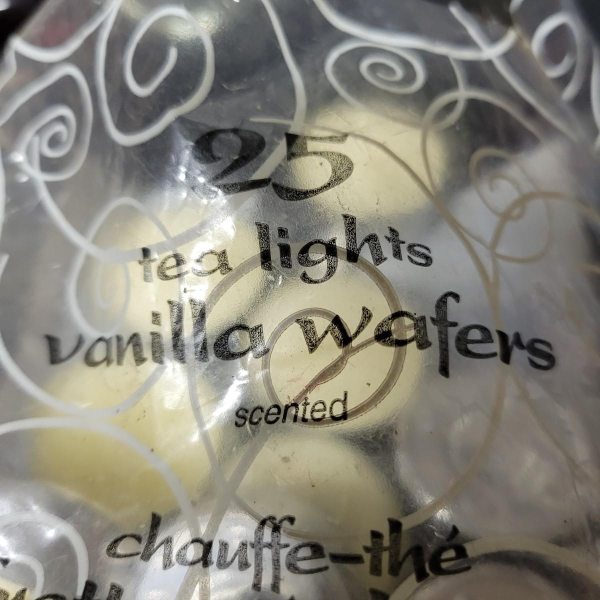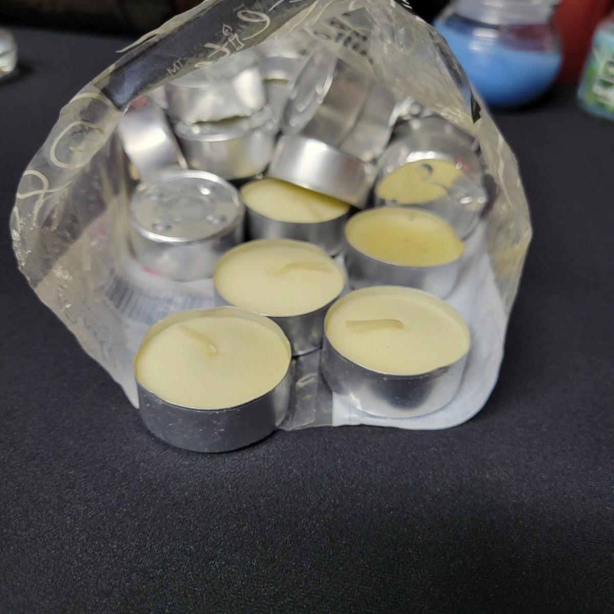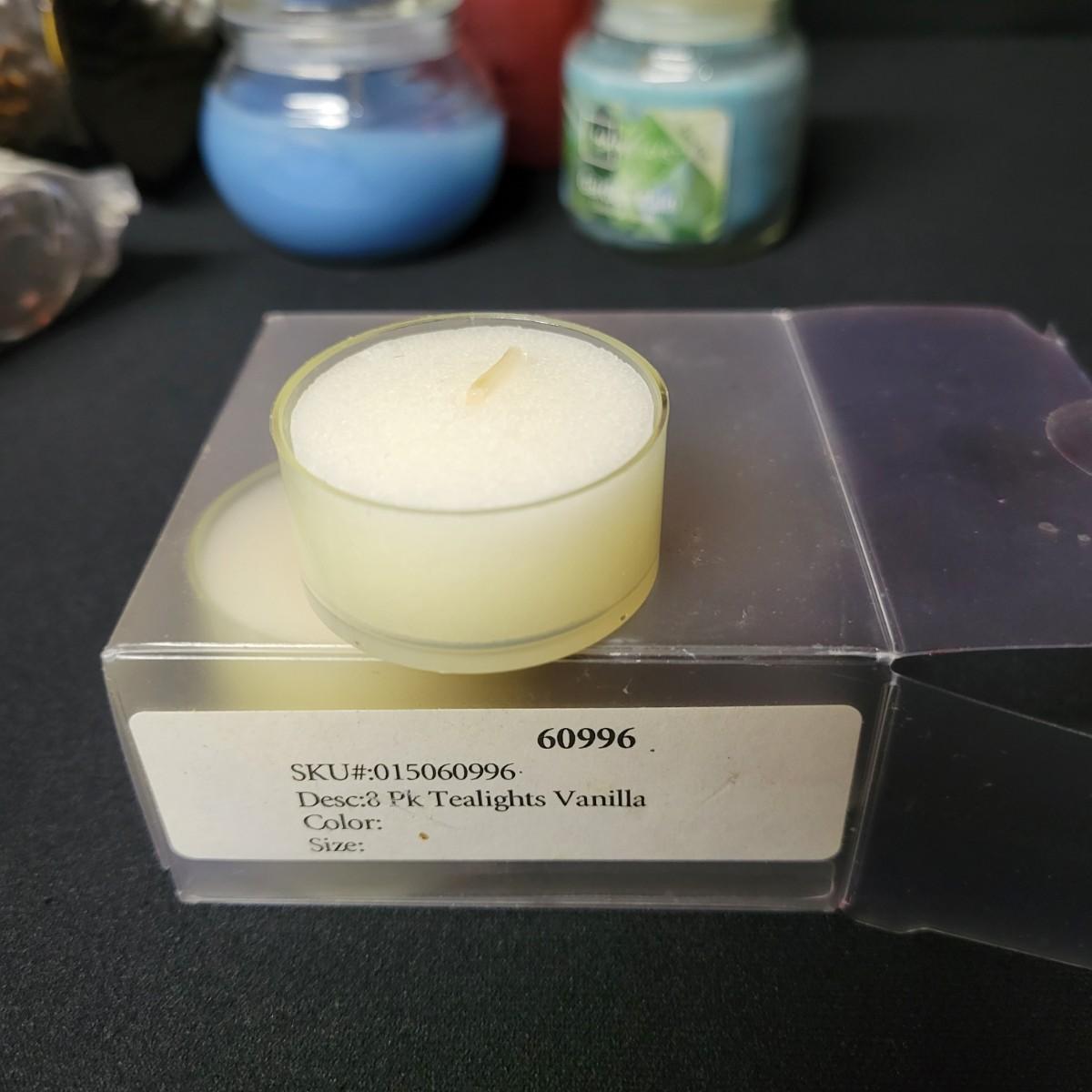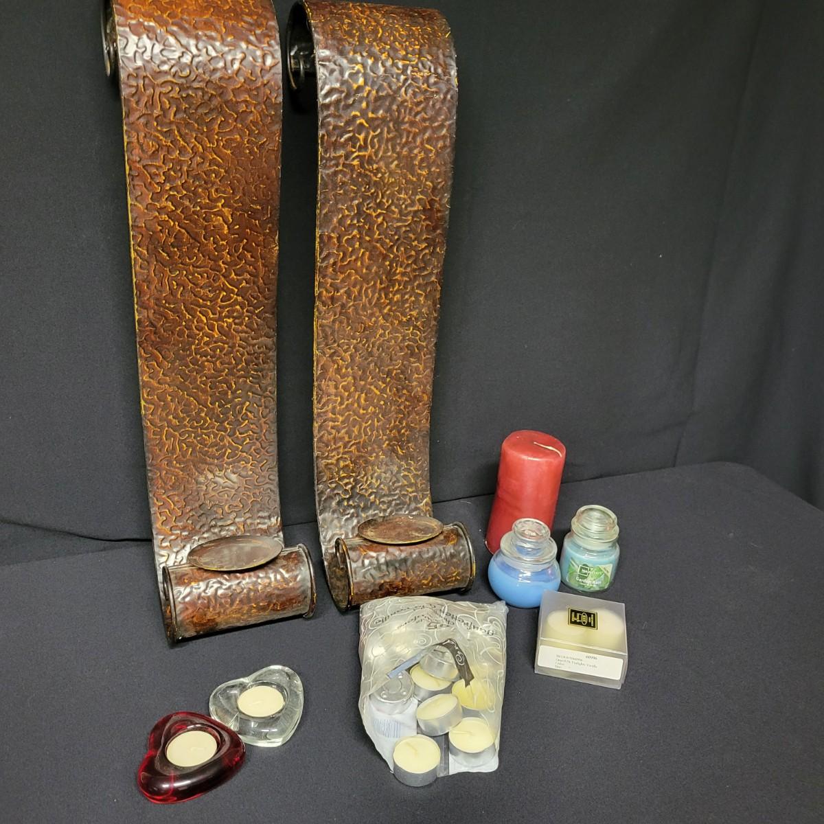 An assortment of vanilla scented tea candles, scented candles in jars and wall mounted candle holders. Two tealight candle holders shaped like hearts, approximately 25 or 30 vanilla scented tea candles, two scented candles in jars and two large wall mounted candle holders. Wall mounted holders measure approximately 5.5" x 23.5" x 5"
