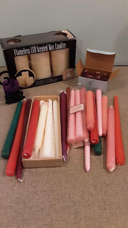 2 pairs of candle sticks and box of assorted candles