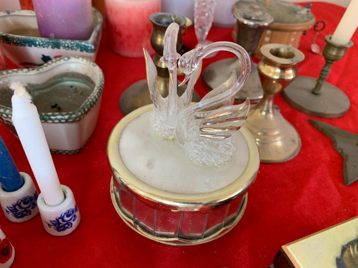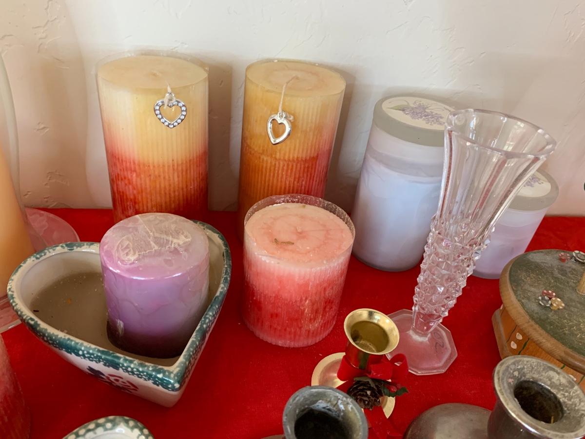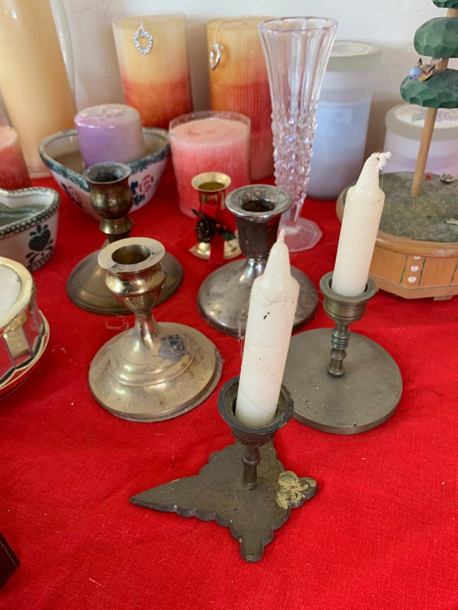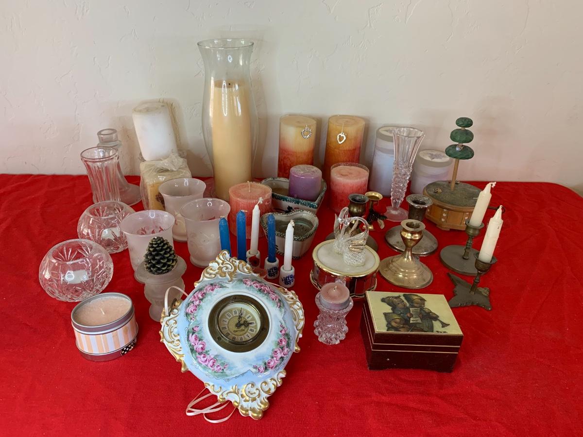 Assortment of decor candles and candle holders (brass, glass and pottery) Includes 3 music boxes as well (one being Thoren Movement Swiss GiGi, appears to be overwound) *untested* and a Mercedes German decorative clock *untested*