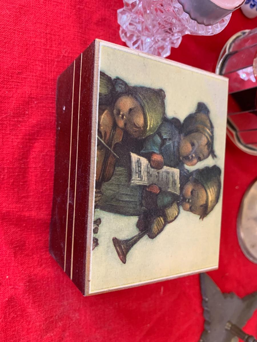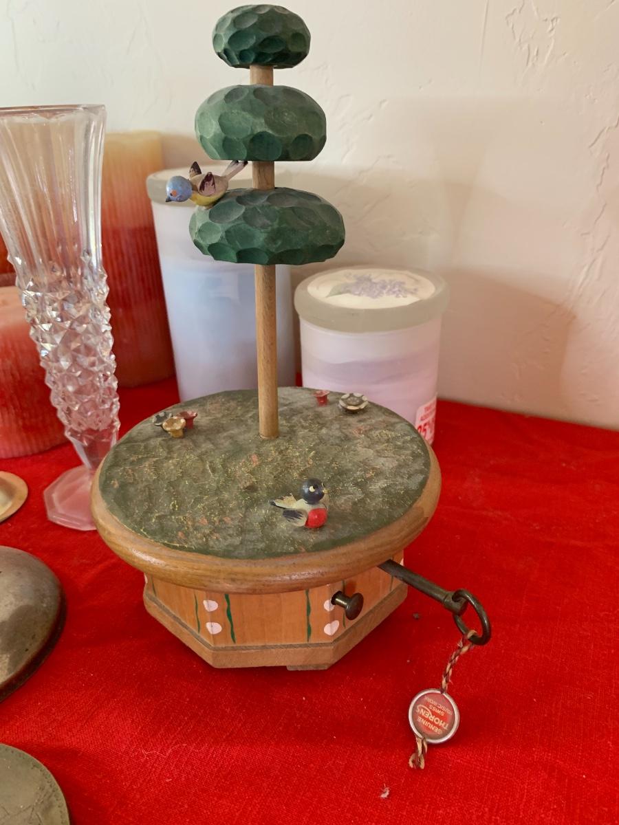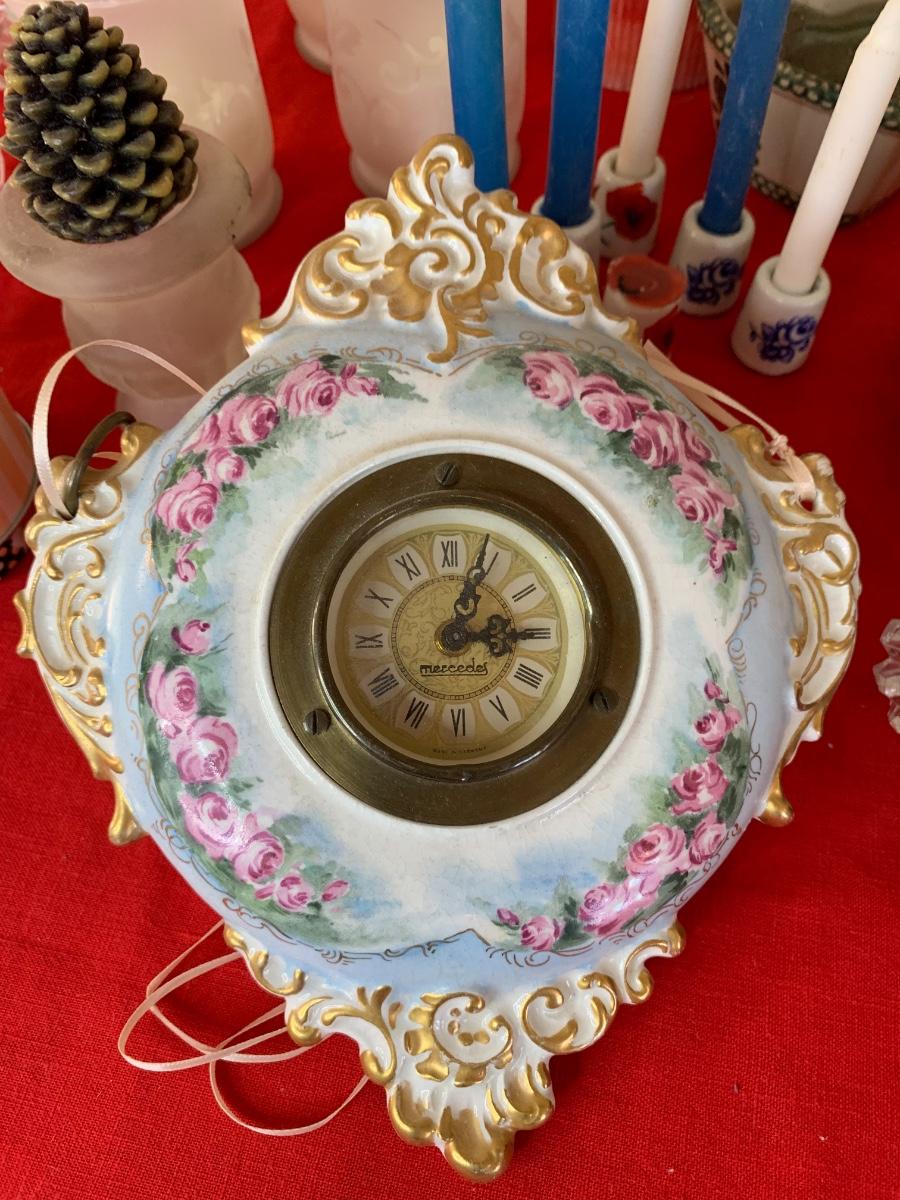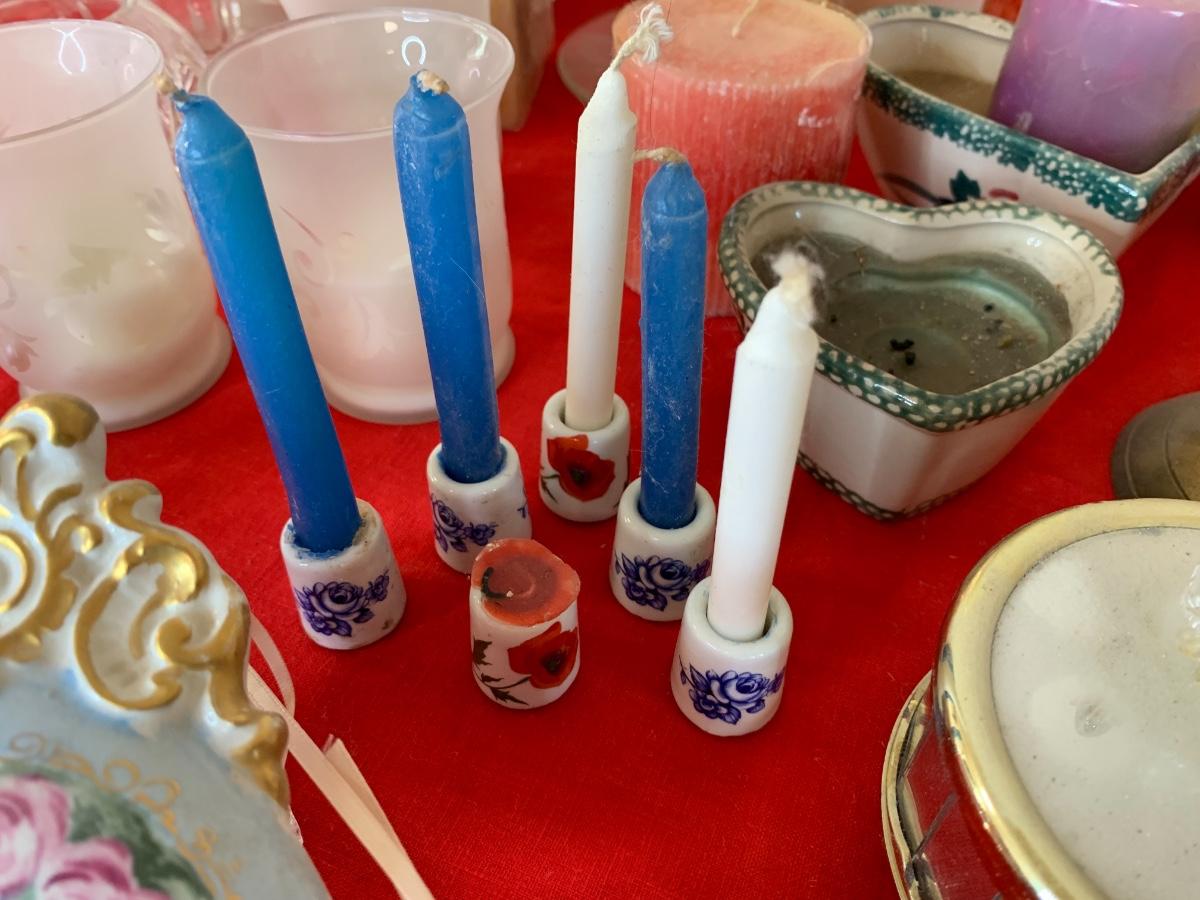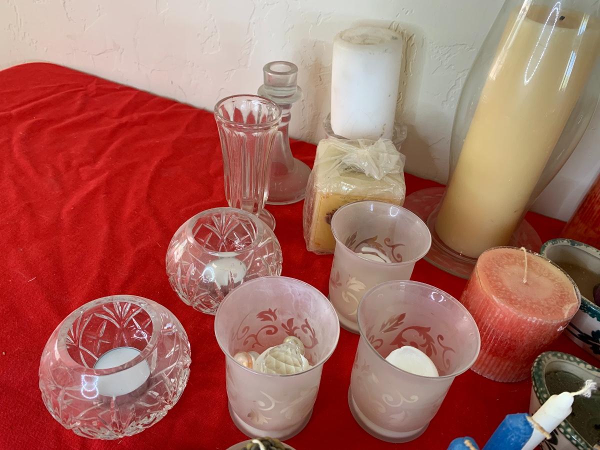 Assortment of decor candles and candle holders (brass, glass and pottery) Includes 3 music boxes as well (one being Thoren Movement Swiss GiGi, appears to be overwound) *untested* and a Mercedes German decorative clock *untested*