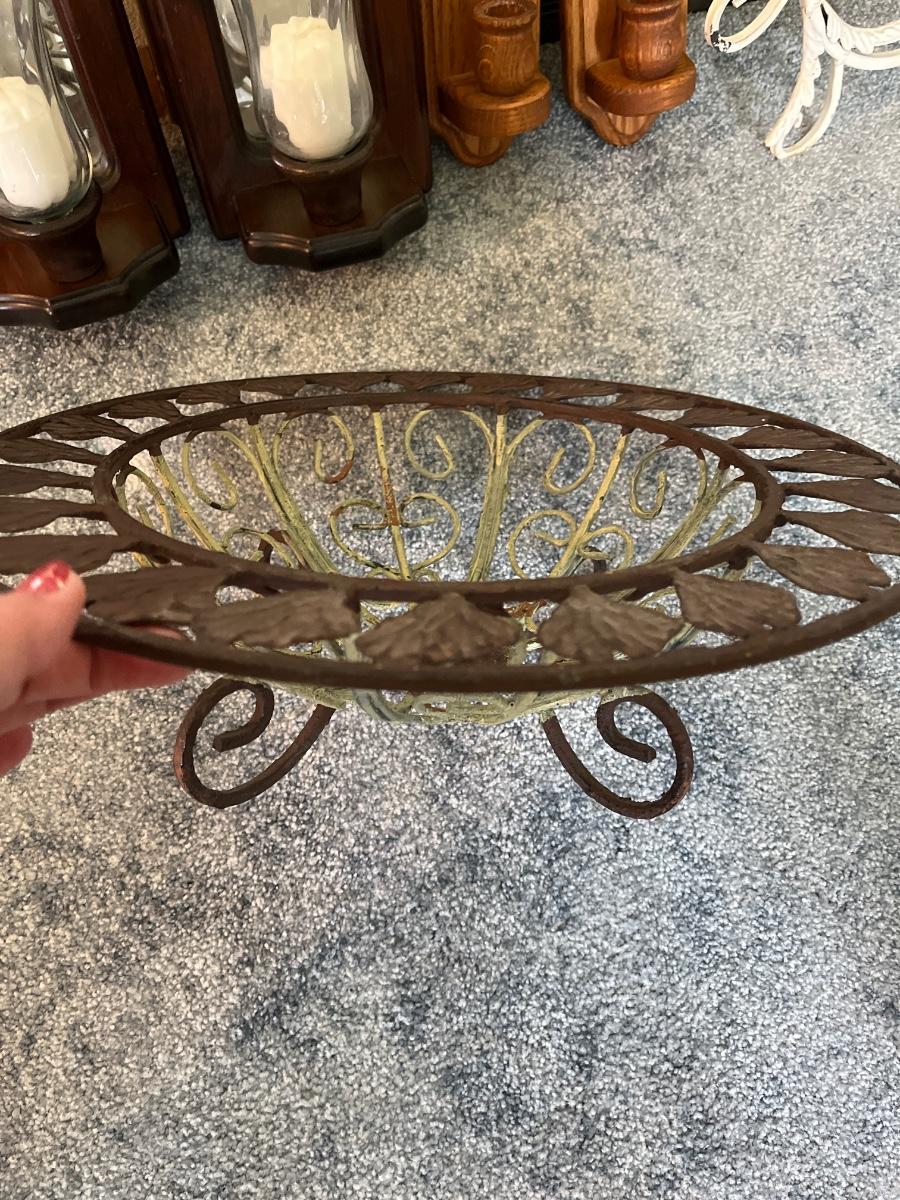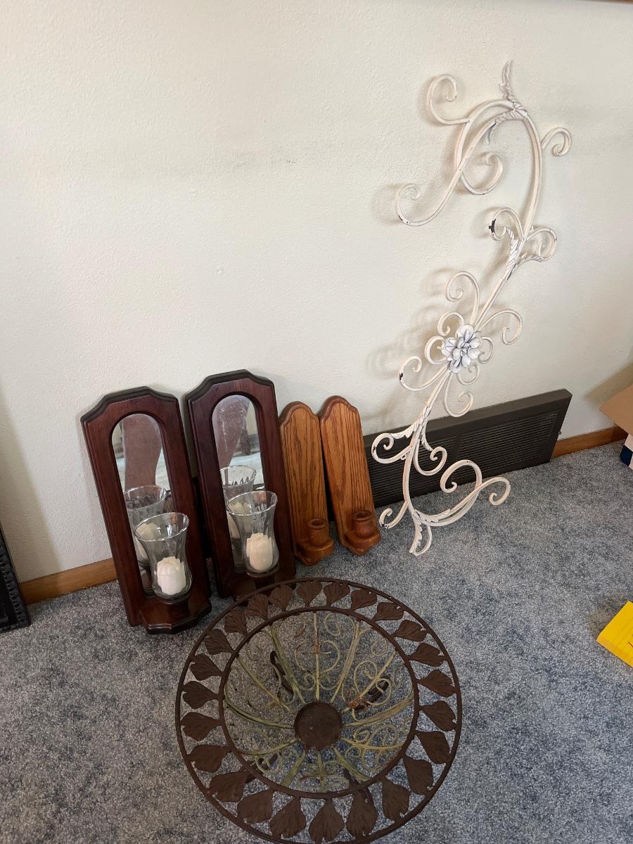 Candle sconces, metal bowl and wall art