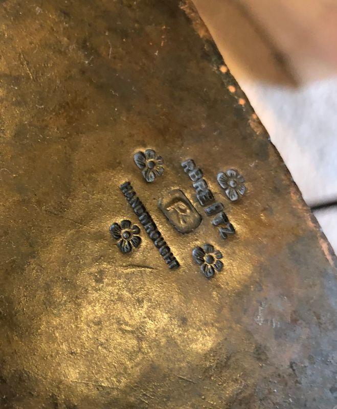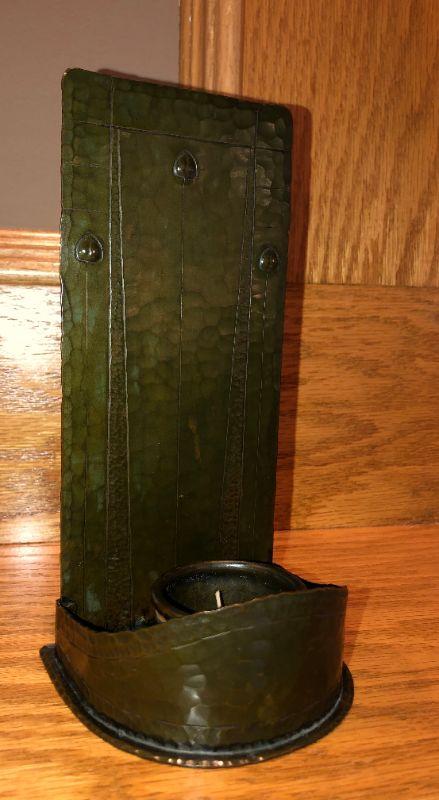 Beautifully hammered and amazing dark green patinated R.B. Reitz candle holder. Excellent original condition. 7.25” tall x 3.25” wide x 2.75” deep.