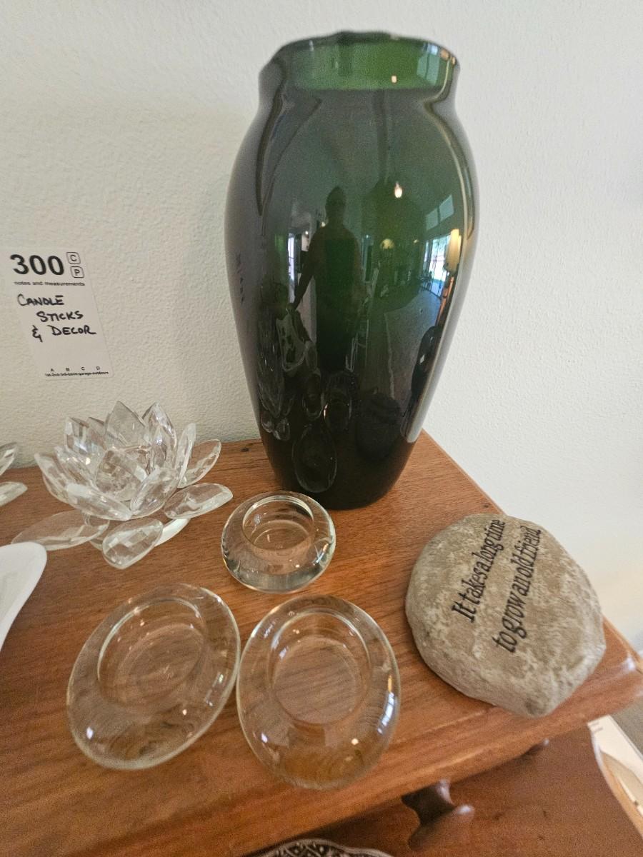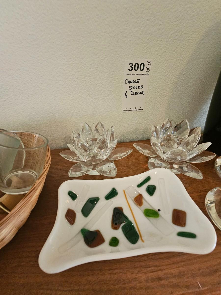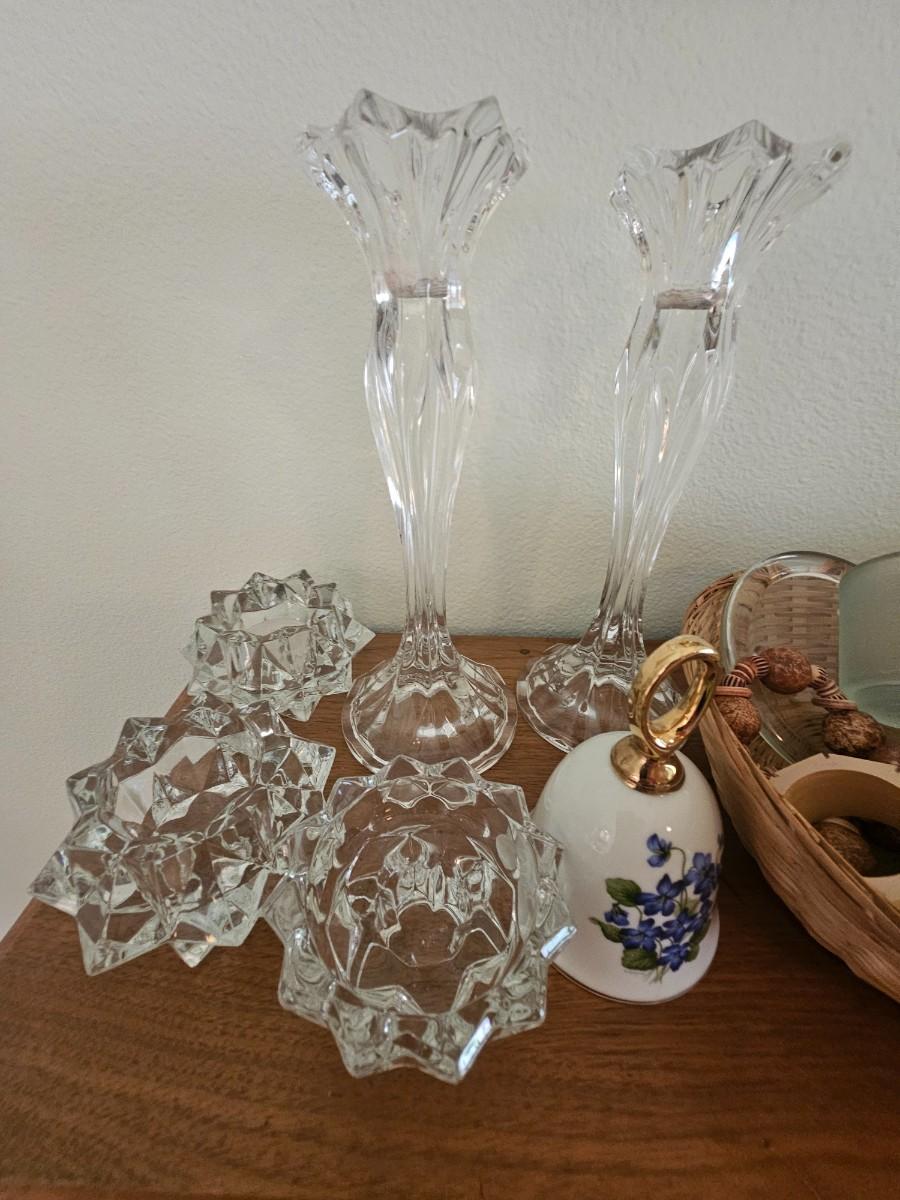 Crystal candlesticks, glass candlesticks, assorted napkin rings, assorted glass pieces and wisdom rock.