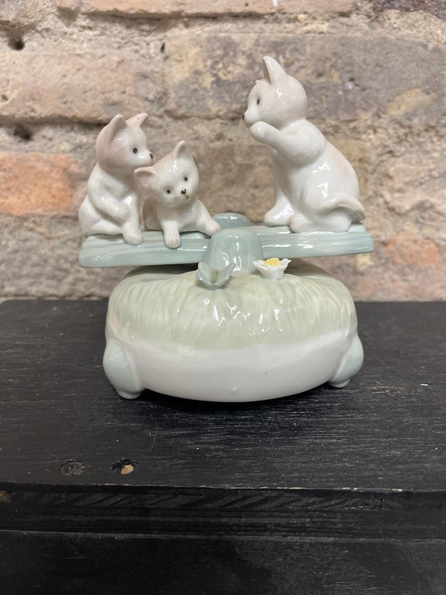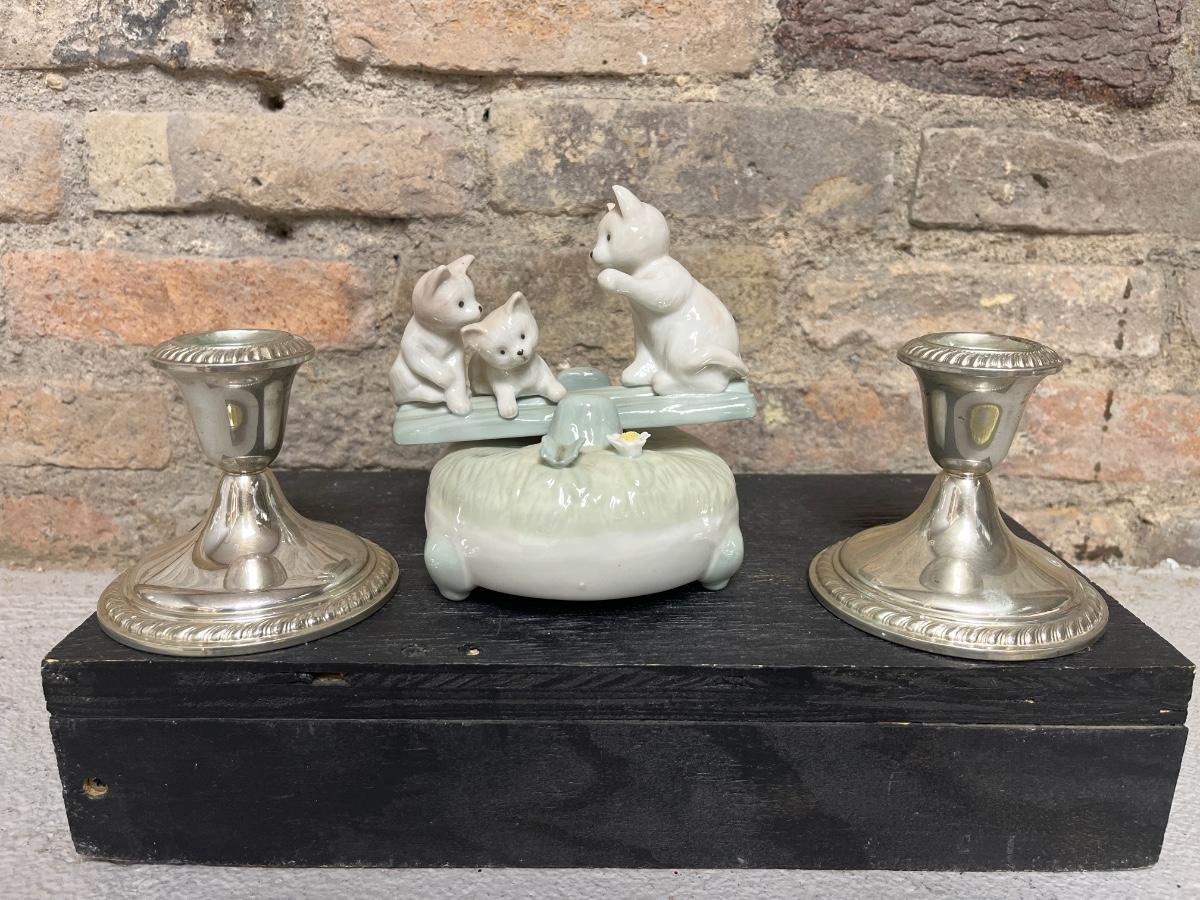 Beautiful Alvin sterling taper holders and charming kitty cat porcelain music box