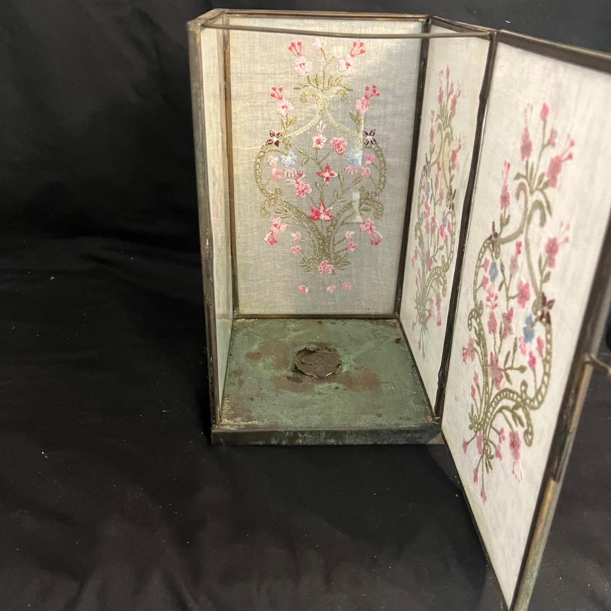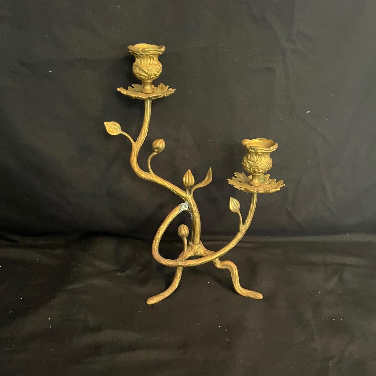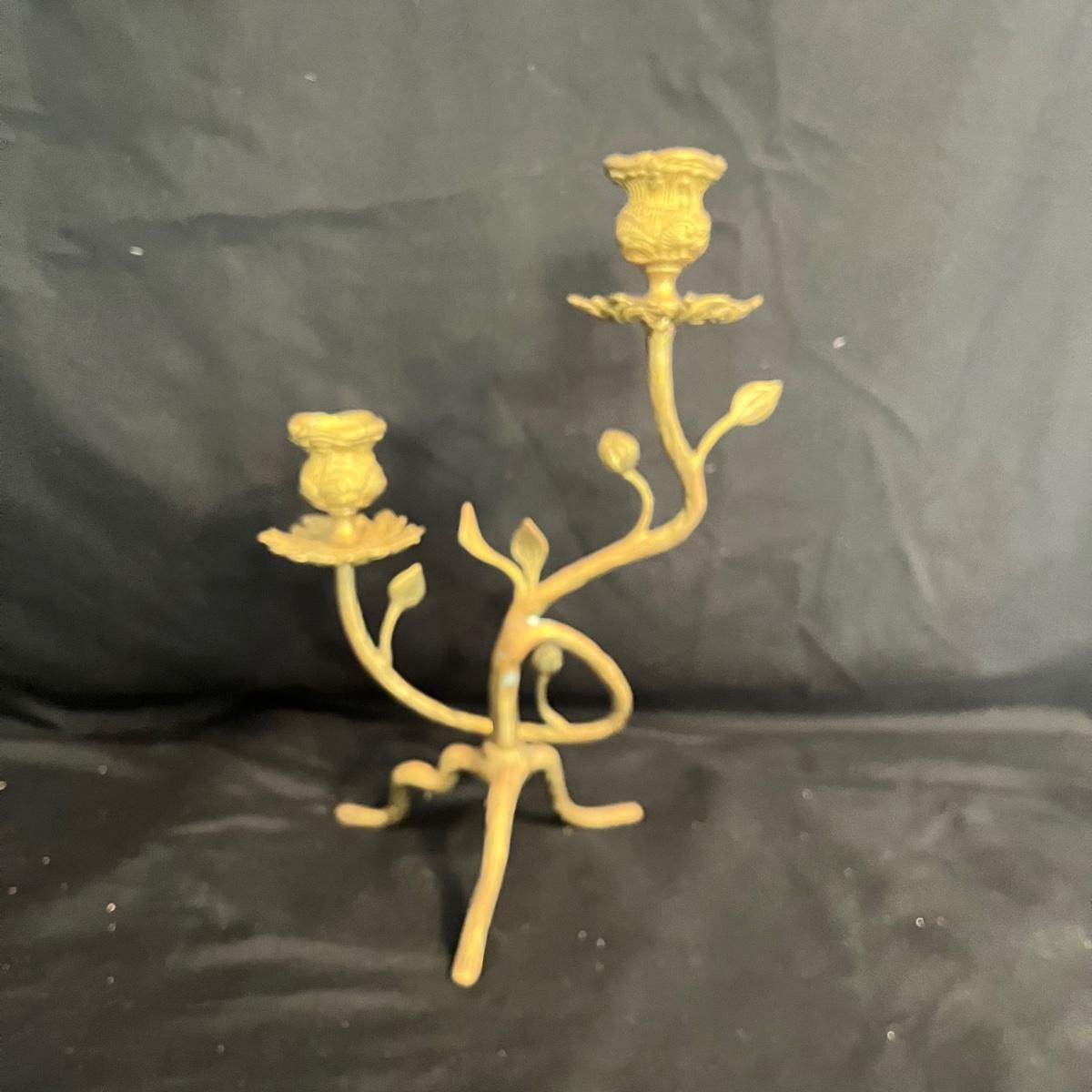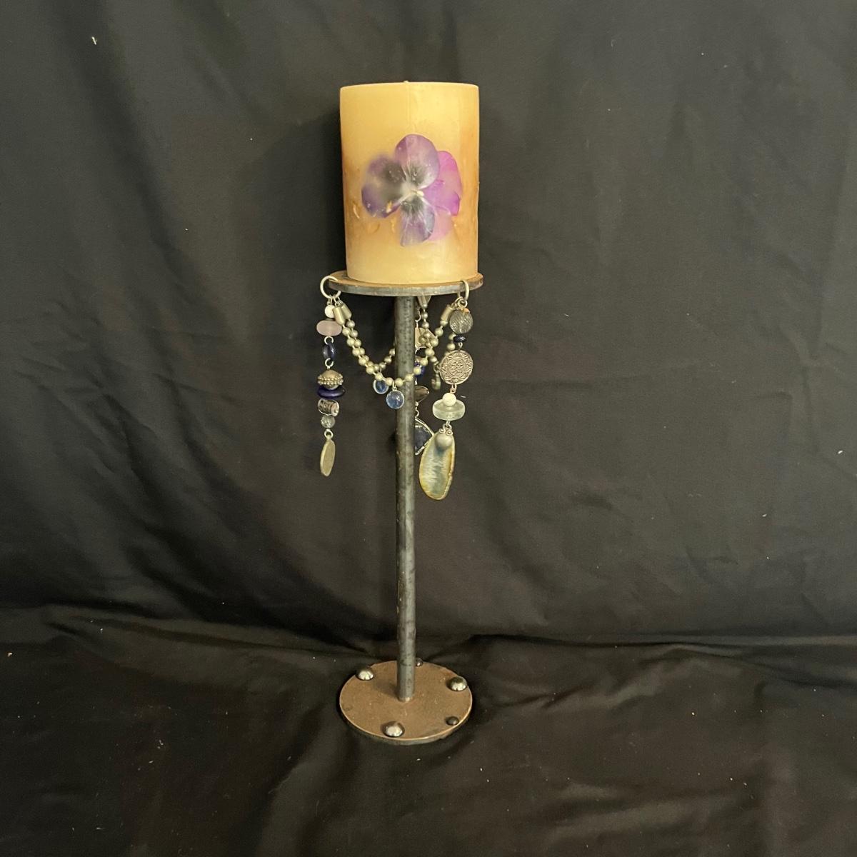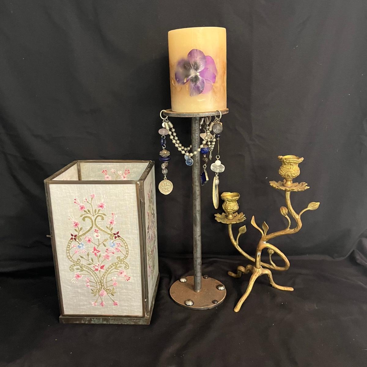 Lot includes a two candle brass candleholder, iron pedestal candle holder with adornments and candle and a glass and metal candle box with opening side. Pedestal with candle measures 4.5”D x 20”H.