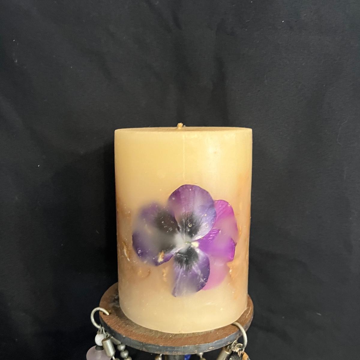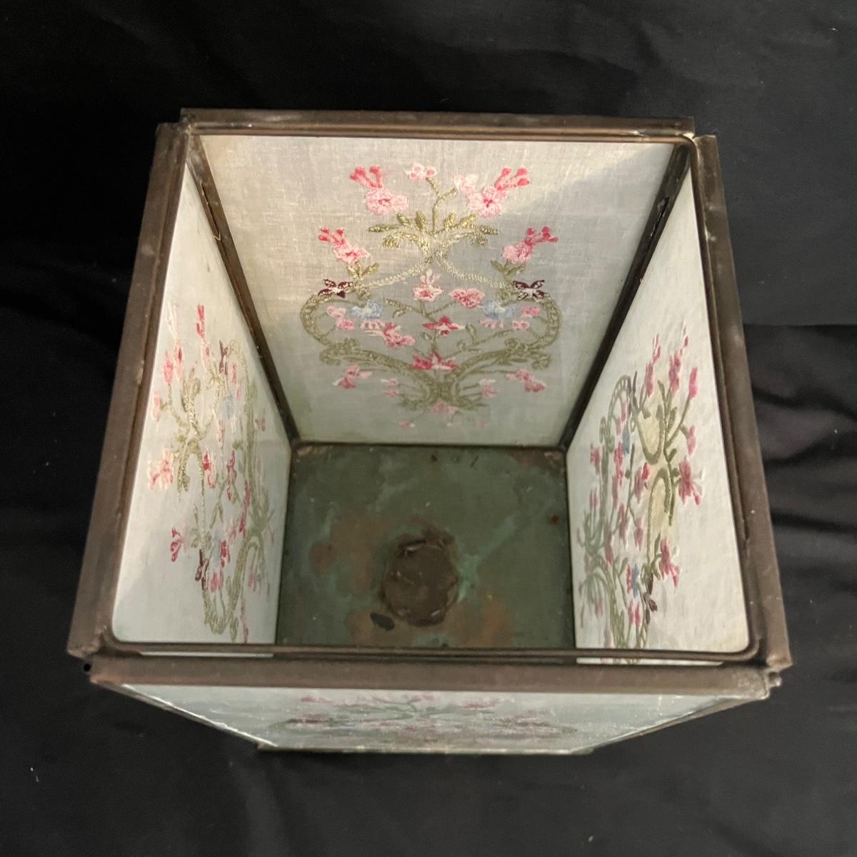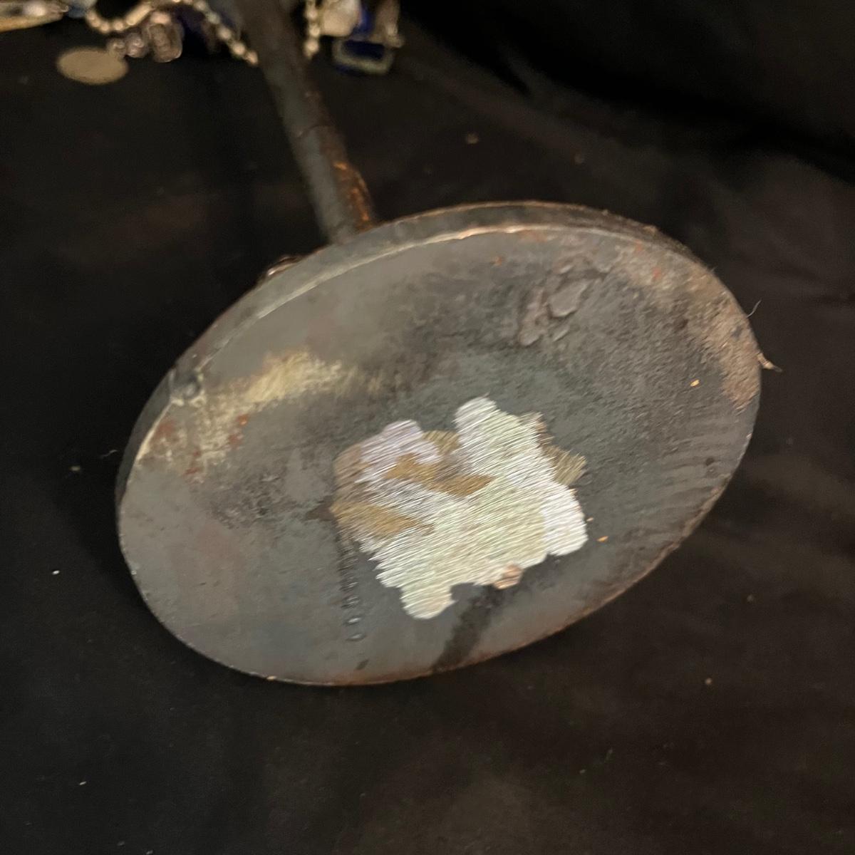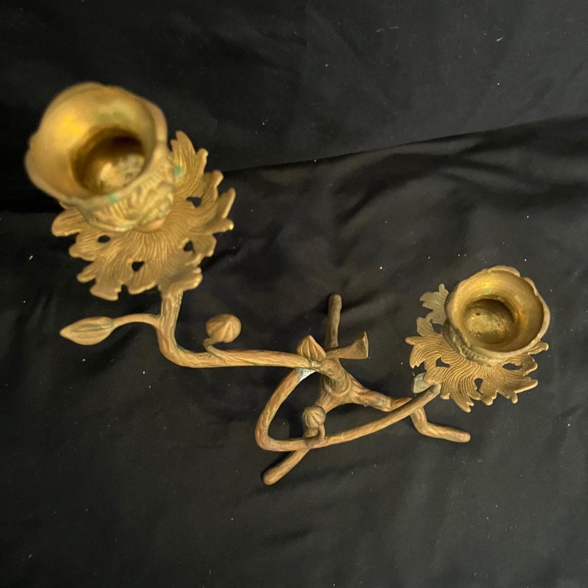 Lot includes a two candle brass candleholder, iron pedestal candle holder with adornments and candle and a glass and metal candle box with opening side. Pedestal with candle measures 4.5”D x 20”H.
