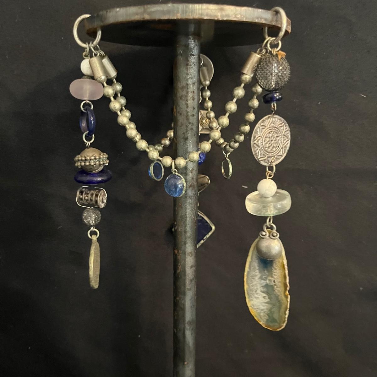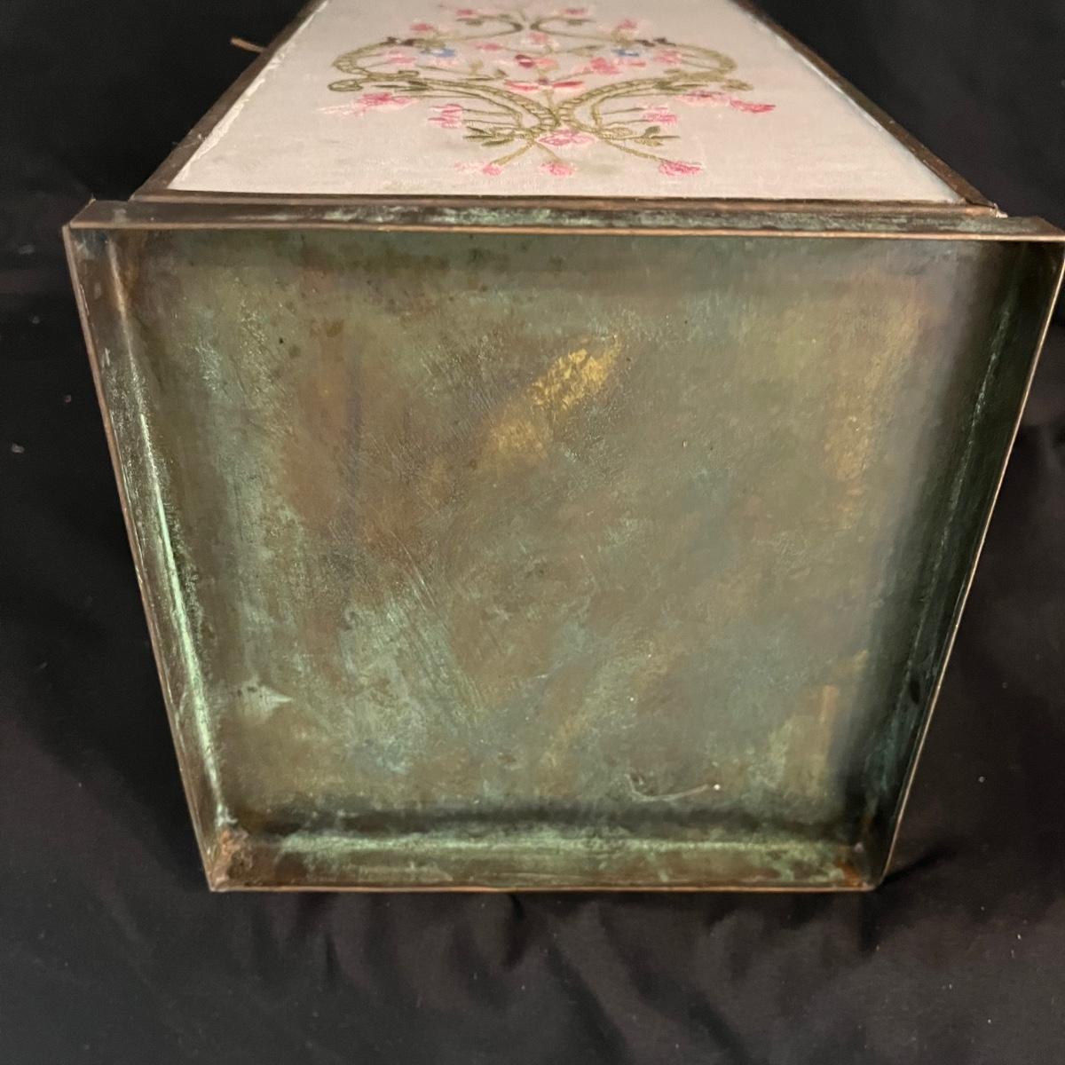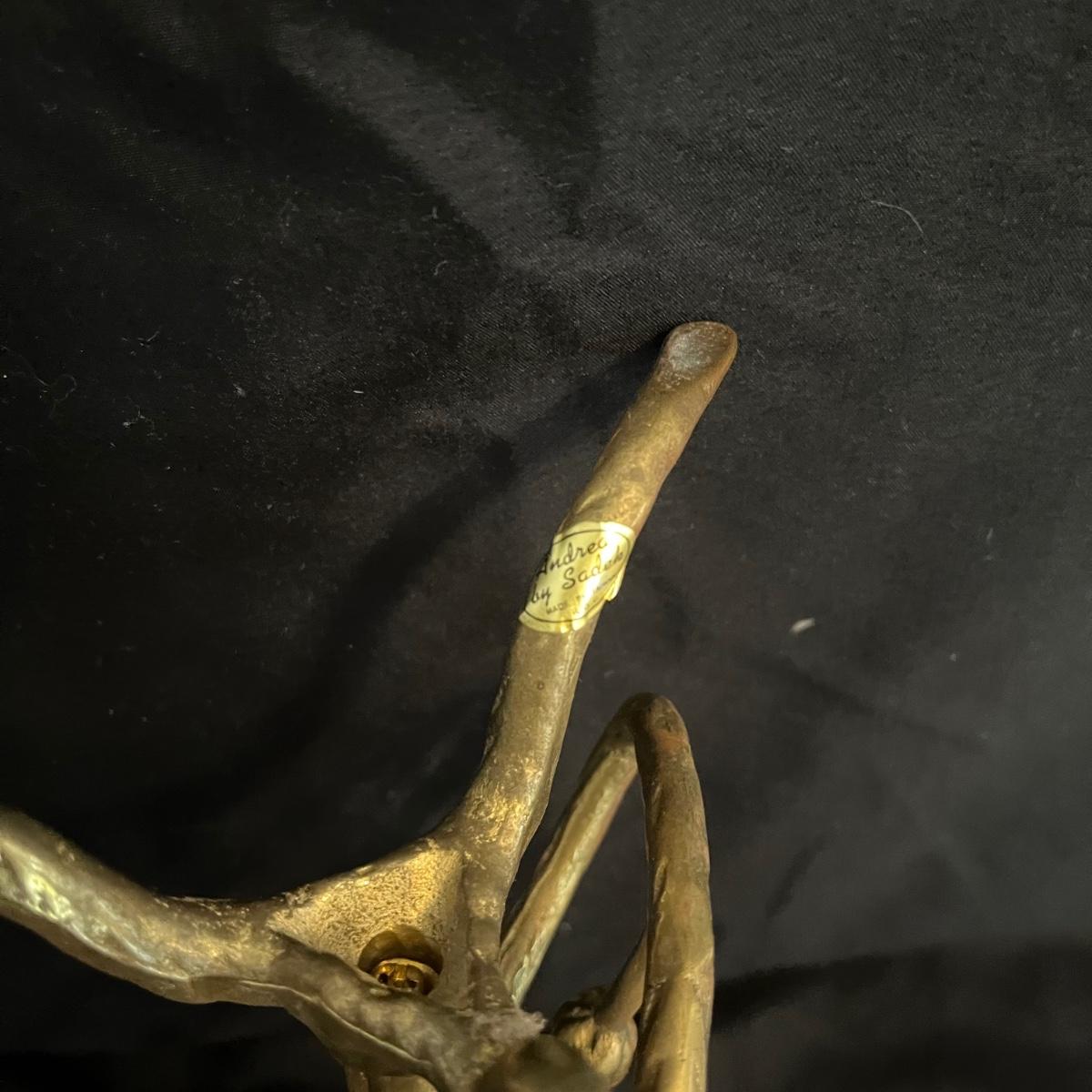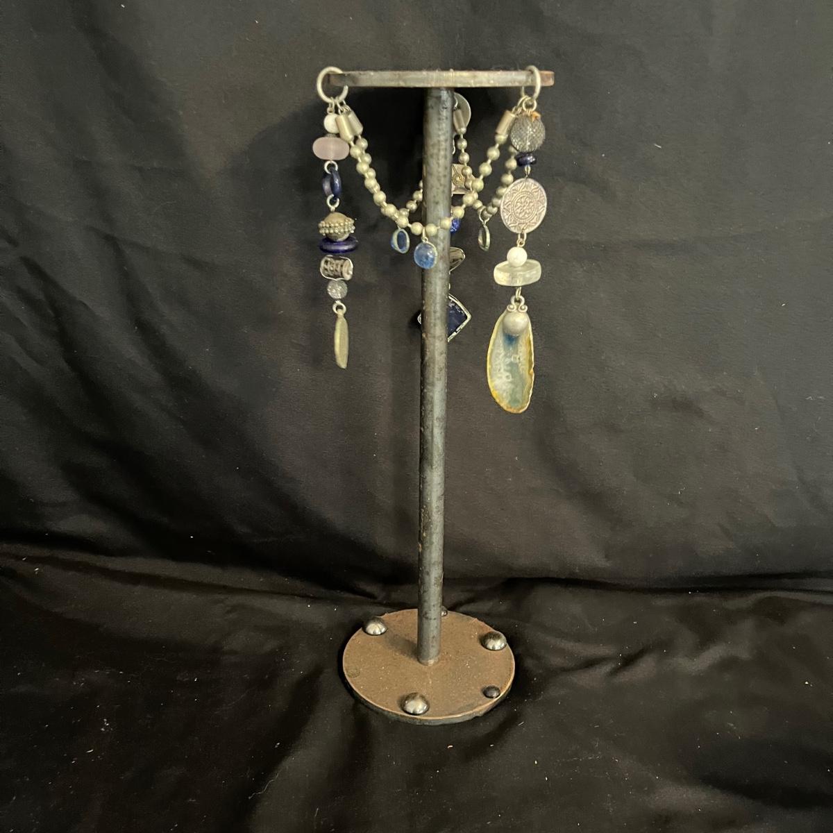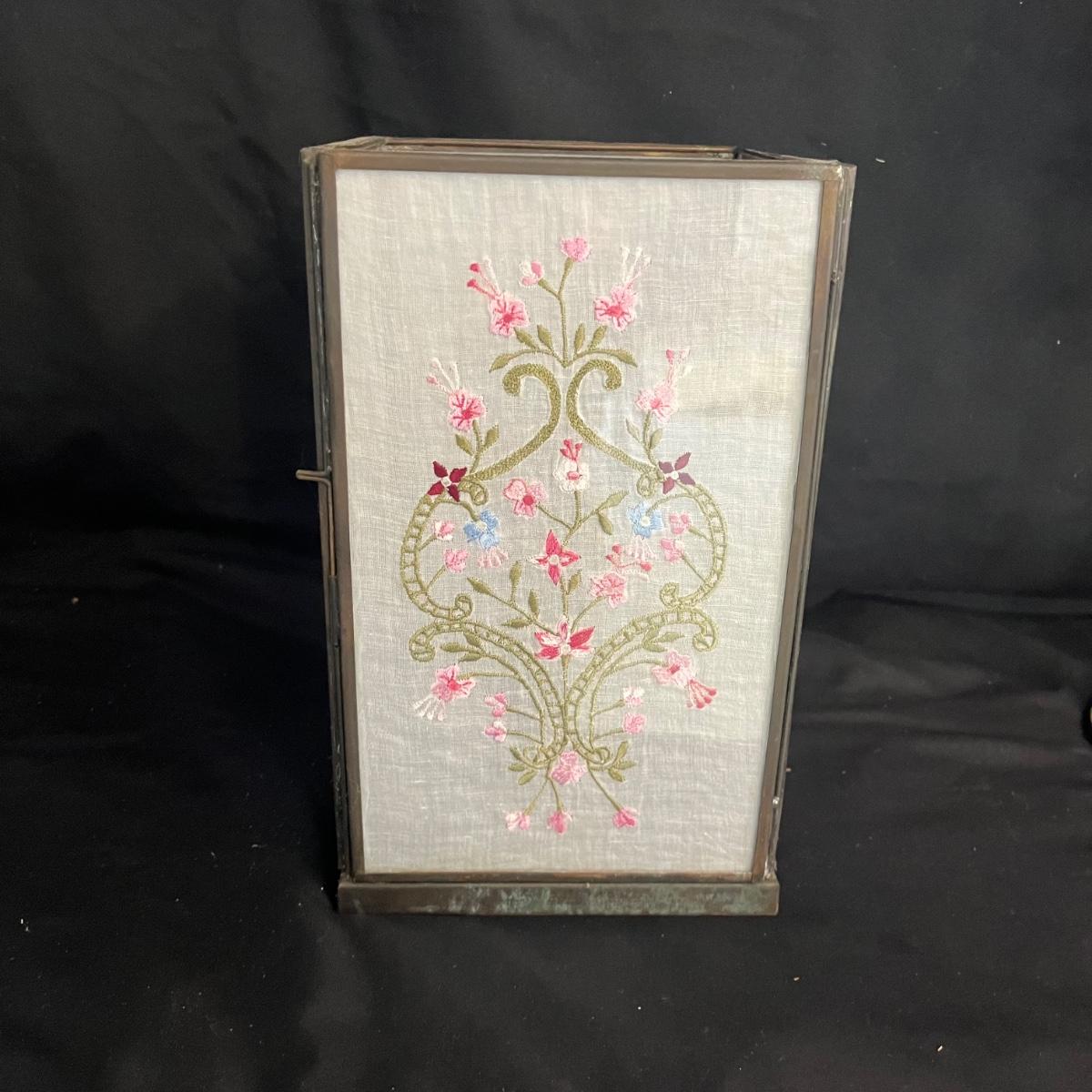 Lot includes a two candle brass candleholder, iron pedestal candle holder with adornments and candle and a glass and metal candle box with opening side. Pedestal with candle measures 4.5”D x 20”H.