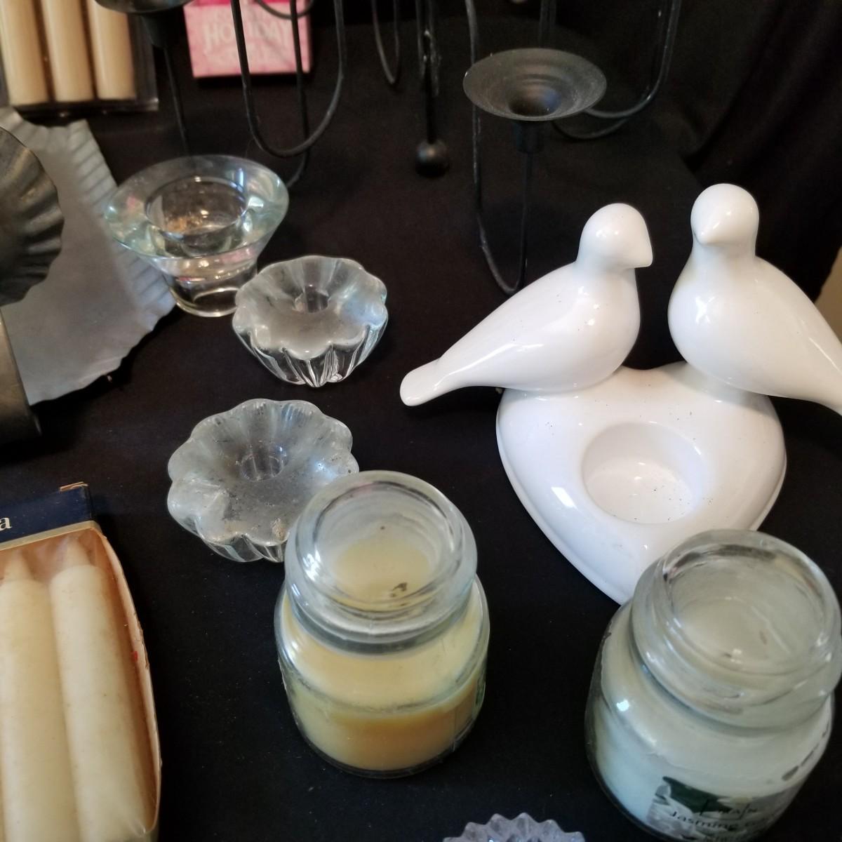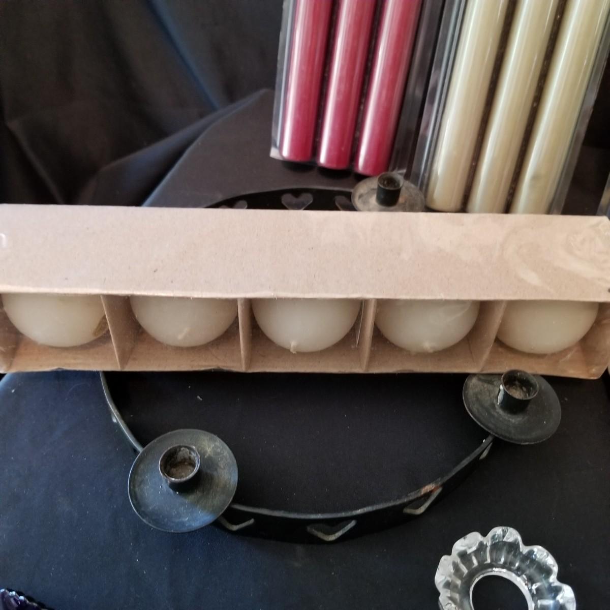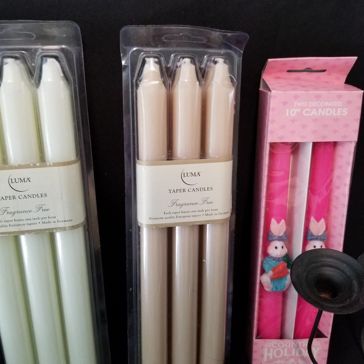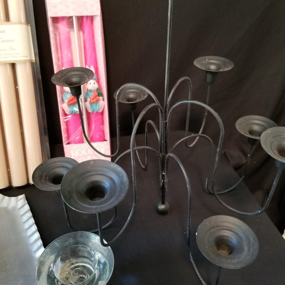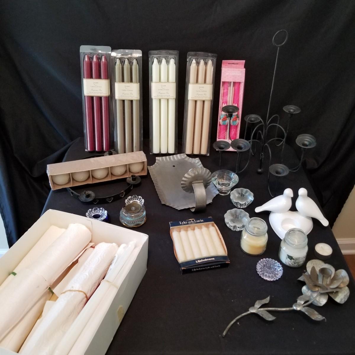 Taper candles, holders and more.  Glass, metal, ceramic holders including several different types of wax catchers. Most candles new in packages. One vintage tin flower shape candle holder. Also metal eight candle holder, can be tabletop or suspended. Shipping available.