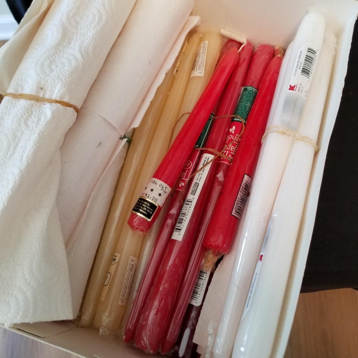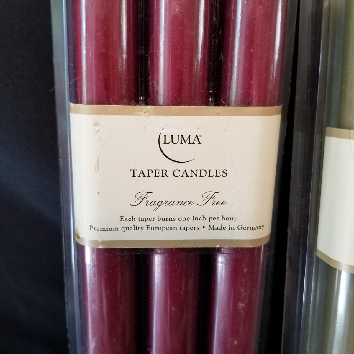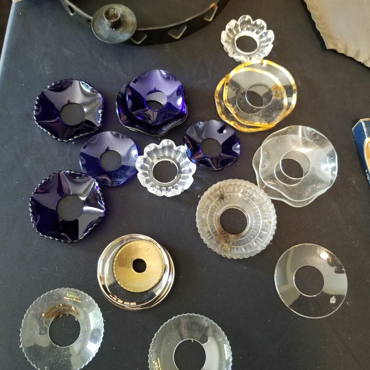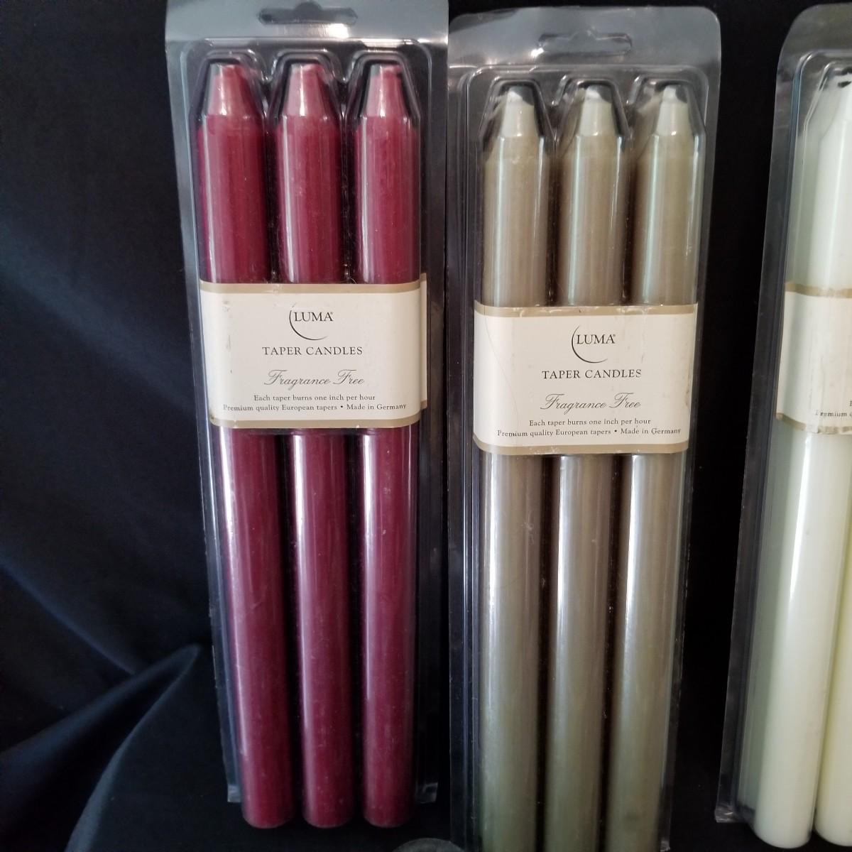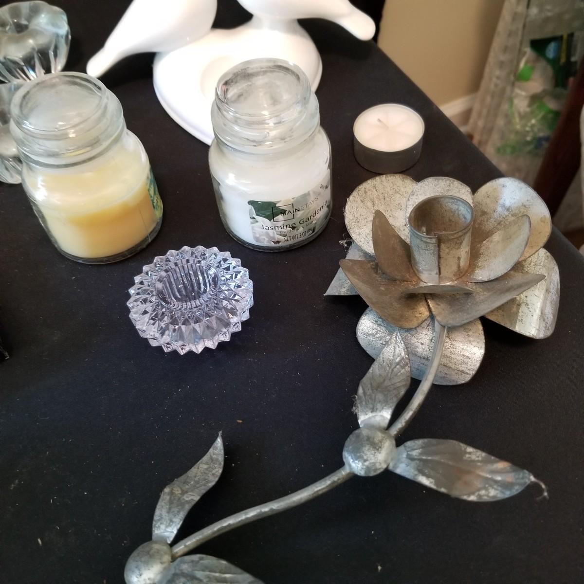 Taper candles, holders and more.  Glass, metal, ceramic holders including several different types of wax catchers. Most candles new in packages. One vintage tin flower shape candle holder. Also metal eight candle holder, can be tabletop or suspended. Shipping available.