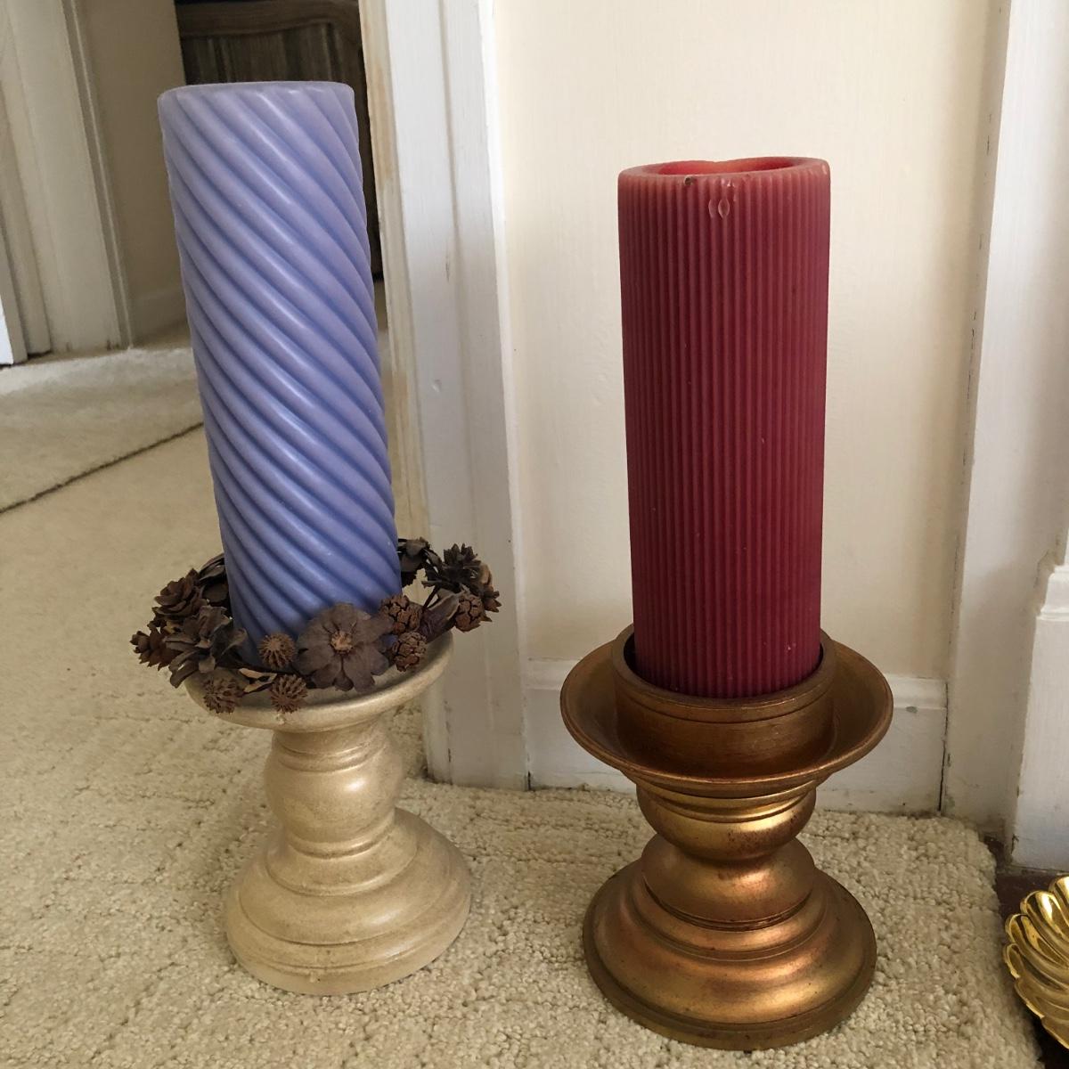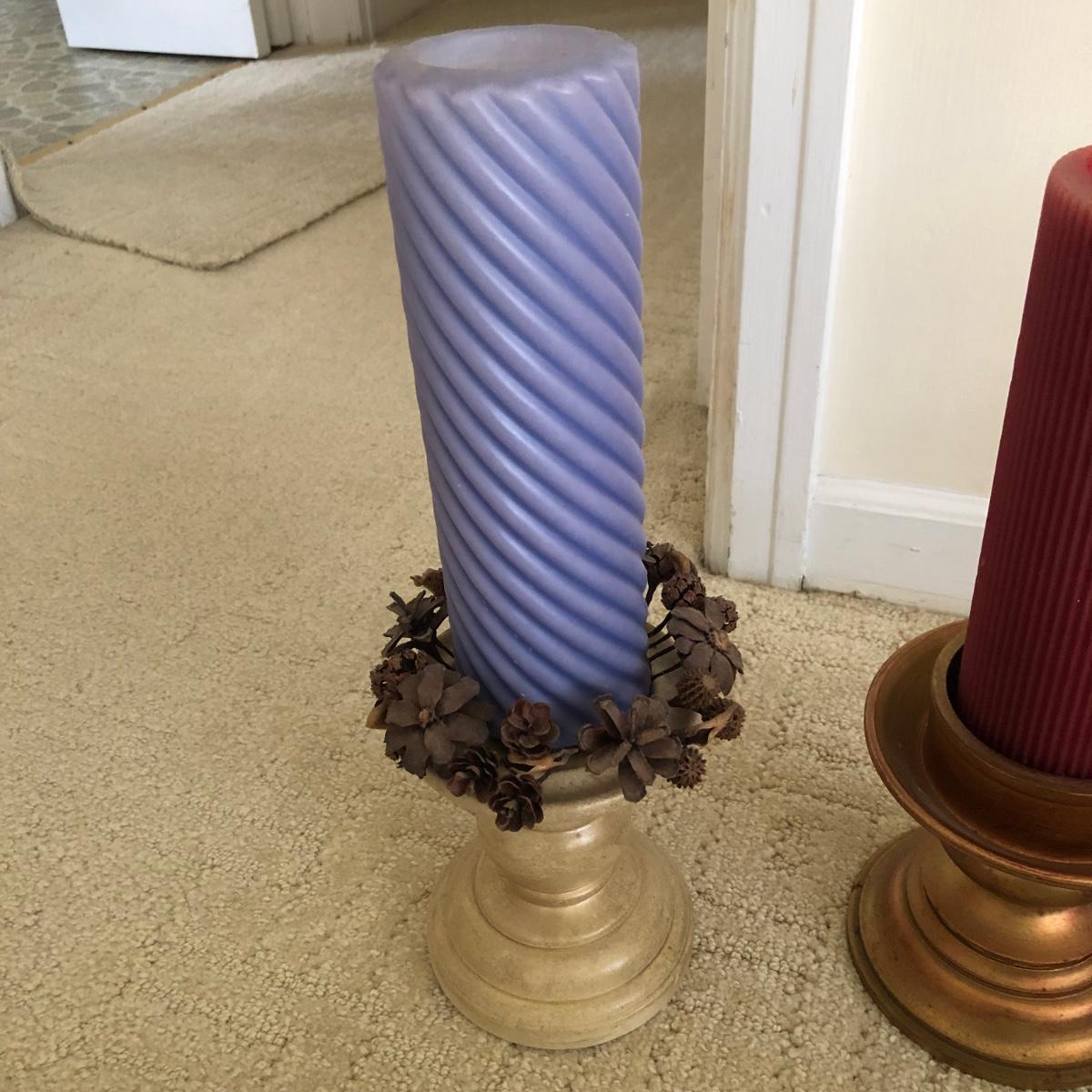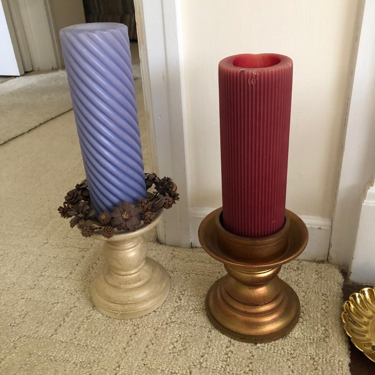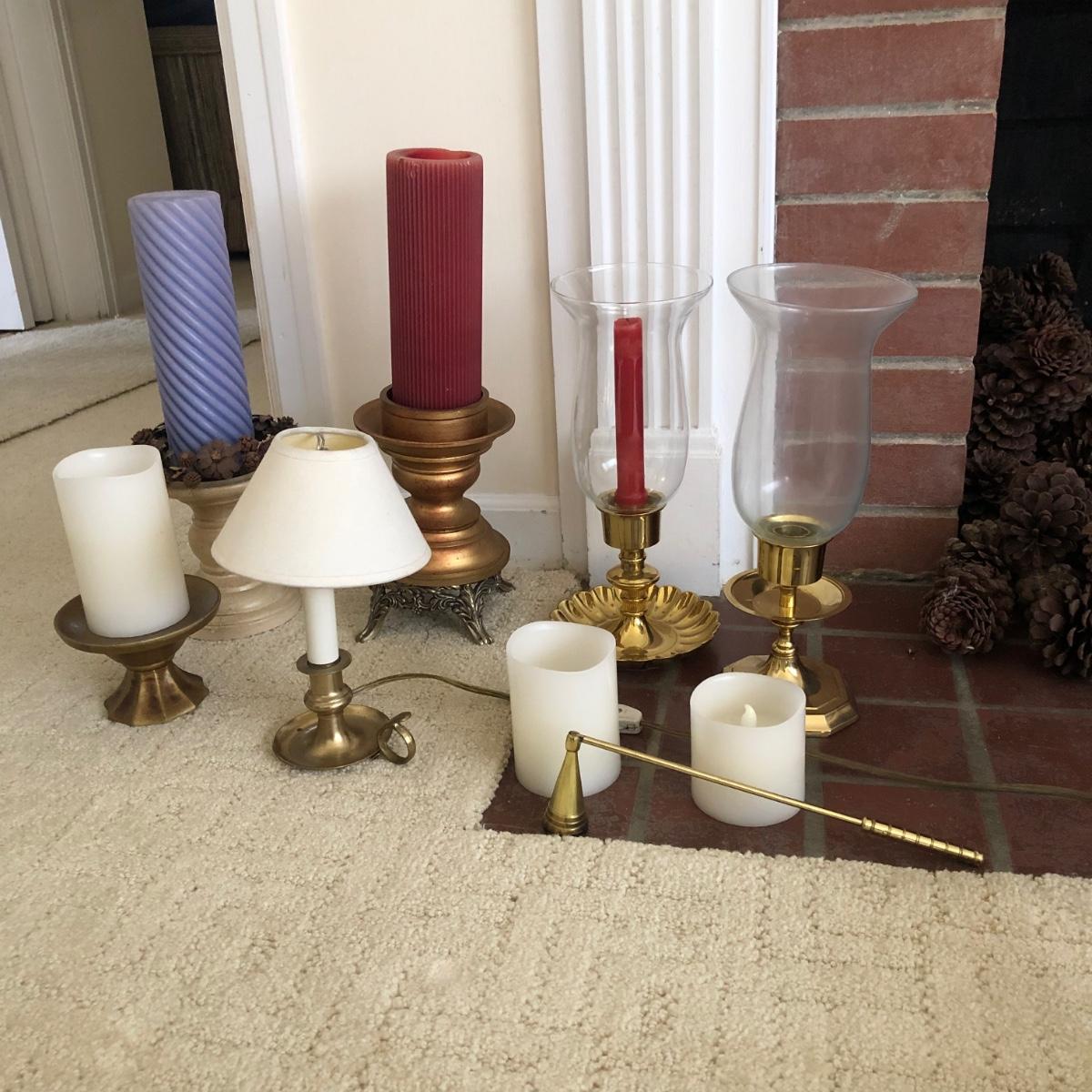 This lot has two large candles on pedestals-one made of ceramic and the other gold plastic. (15” and 13.5” tall). There are two brass candlestick holders with hurricane shades (13” tall). And finally, this lot includes three battery operated candles with two stands (one ceramic and one brass), one brass candle snuffer and a candle lamp (9” tall) which powered on when plugged in. Of the three battery operated candles, only one came on -the other two need new batteries. Local pick up only.