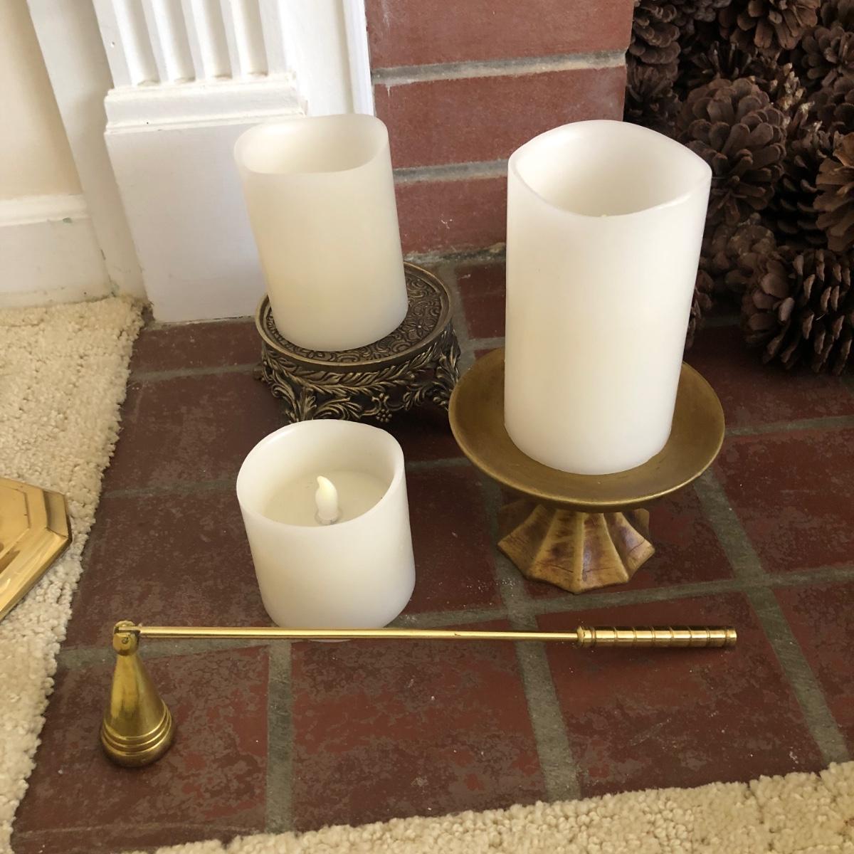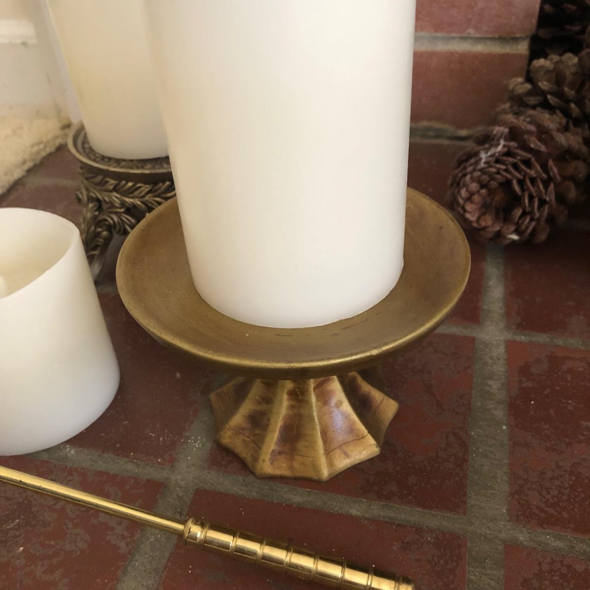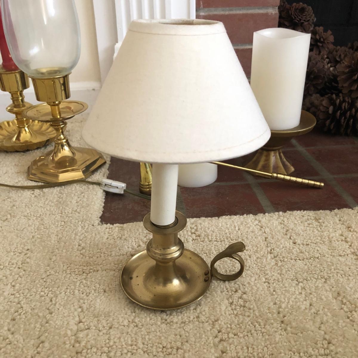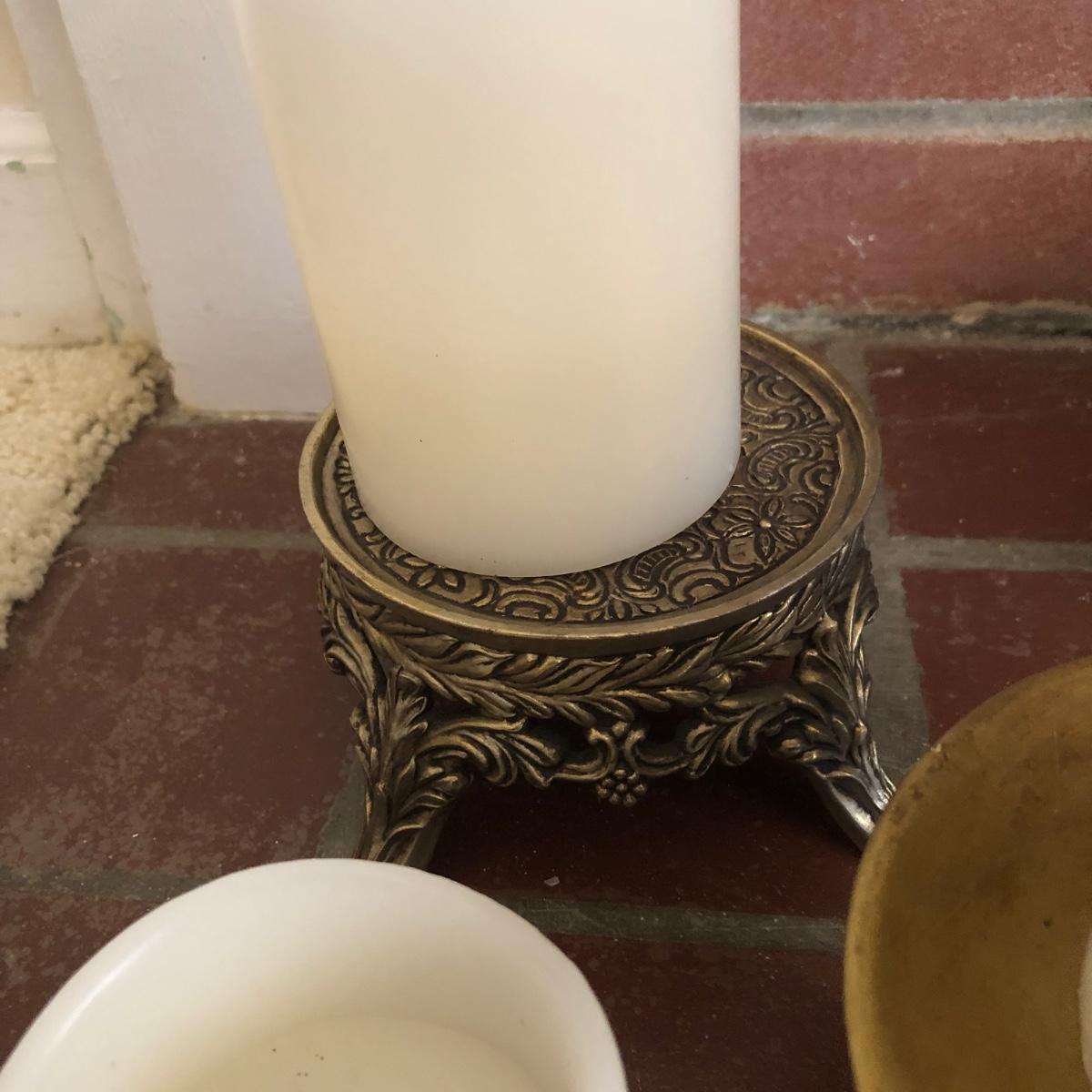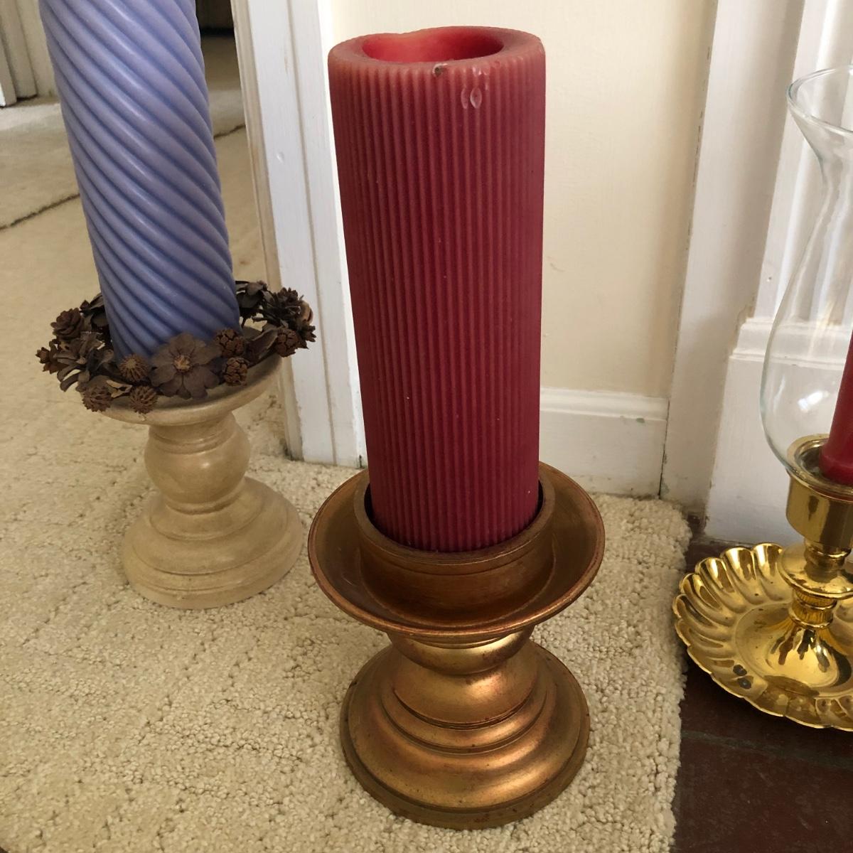 This lot has two large candles on pedestals-one made of ceramic and the other gold plastic. (15” and 13.5” tall). There are two brass candlestick holders with hurricane shades (13” tall). And finally, this lot includes three battery operated candles with two stands (one ceramic and one brass), one brass candle snuffer and a candle lamp (9” tall) which powered on when plugged in. Of the three battery operated candles, only one came on -the other two need new batteries. Local pick up only.