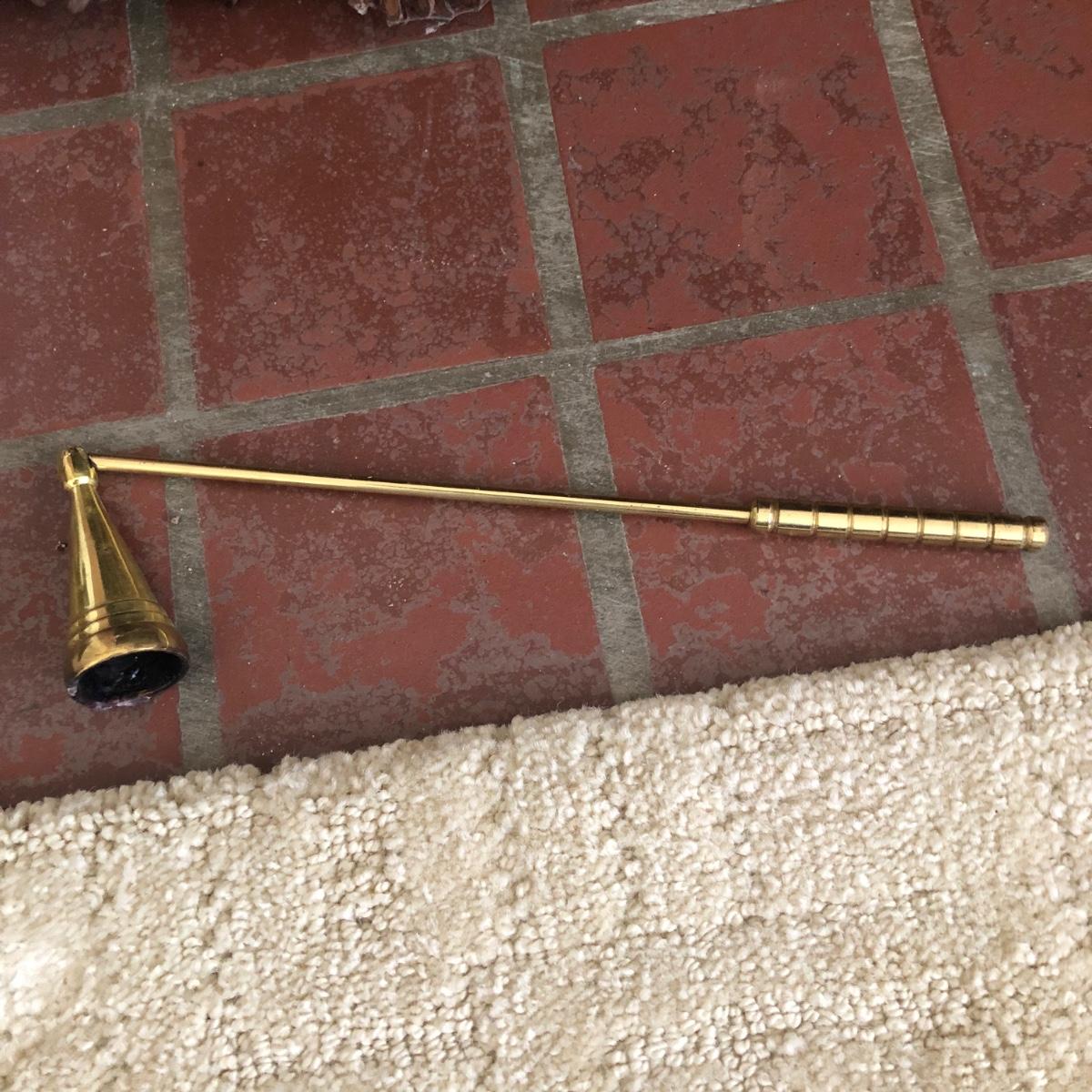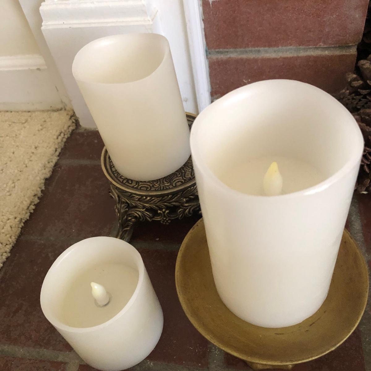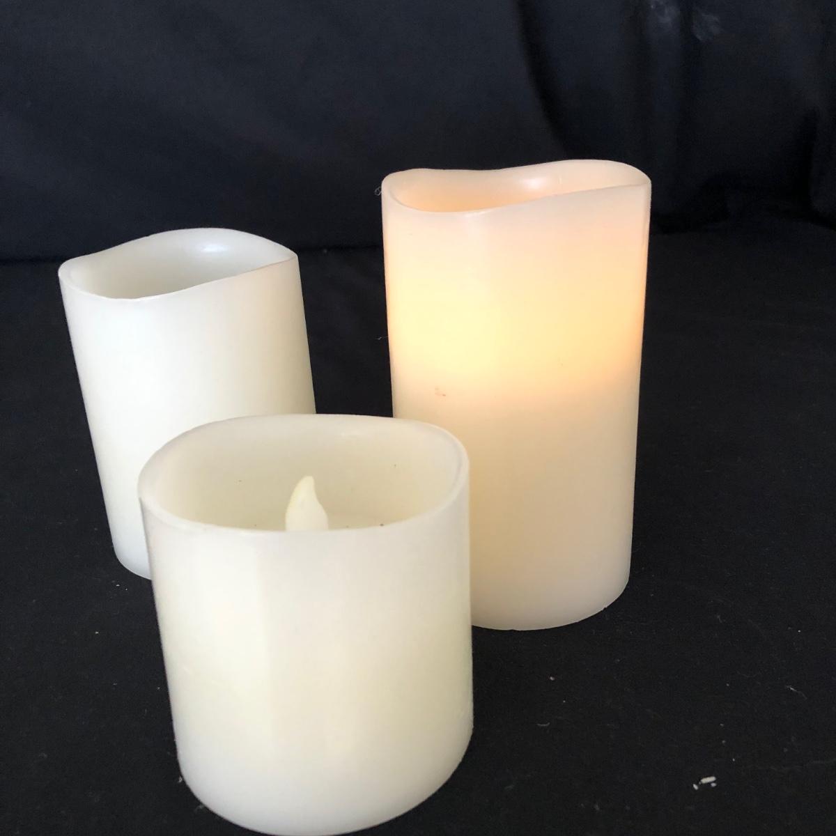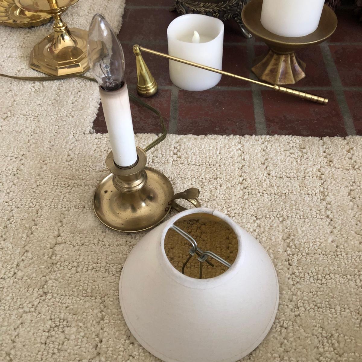 This lot has two large candles on pedestals-one made of ceramic and the other gold plastic. (15” and 13.5” tall). There are two brass candlestick holders with hurricane shades (13” tall). And finally, this lot includes three battery operated candles with two stands (one ceramic and one brass), one brass candle snuffer and a candle lamp (9” tall) which powered on when plugged in. Of the three battery operated candles, only one came on -the other two need new batteries. Local pick up only.