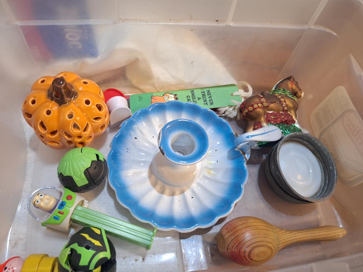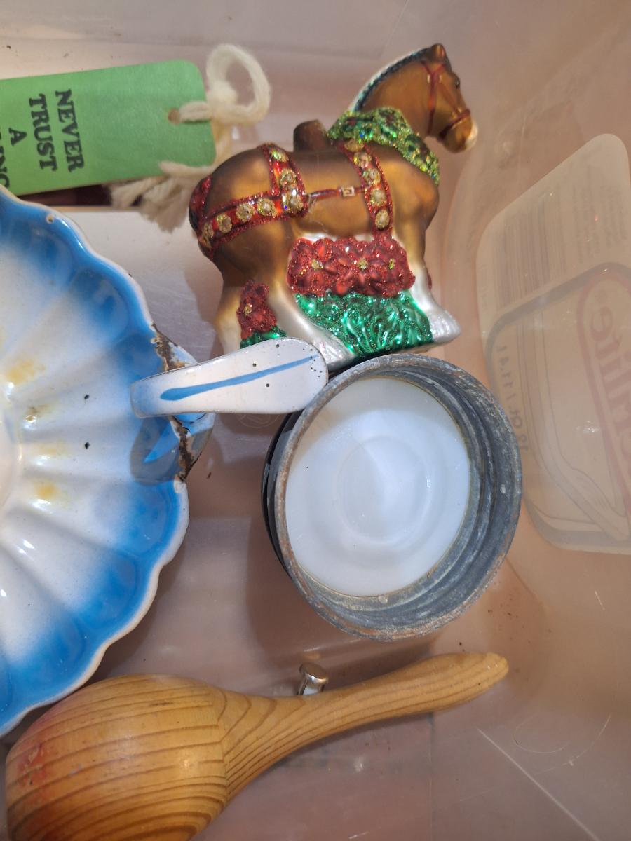 candlestick holder, pez dispenser, fisher price person and other misc small items- the glass horse ornament is missing the top part where you hang it on the tree.