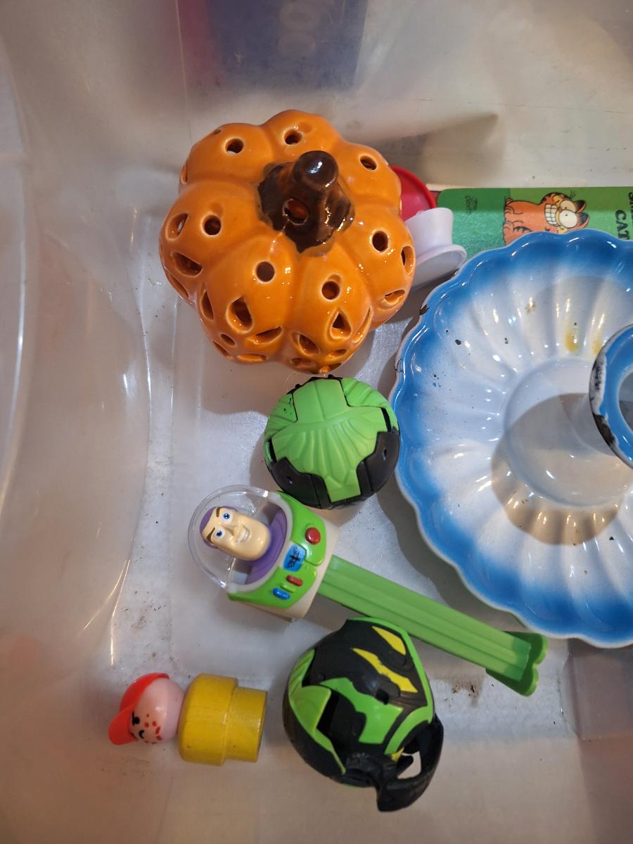 candlestick holder, pez dispenser, fisher price person and other misc small items