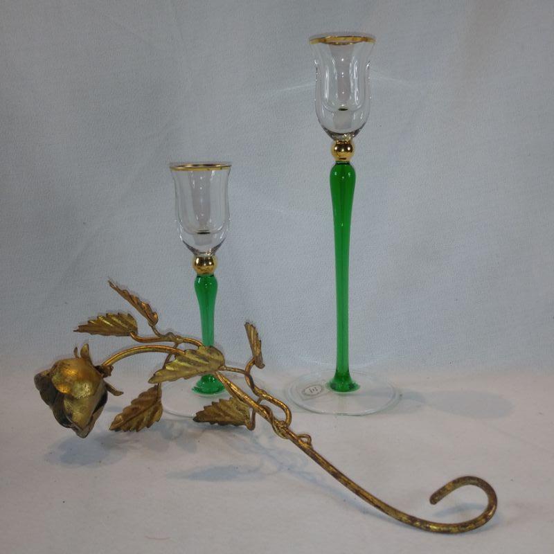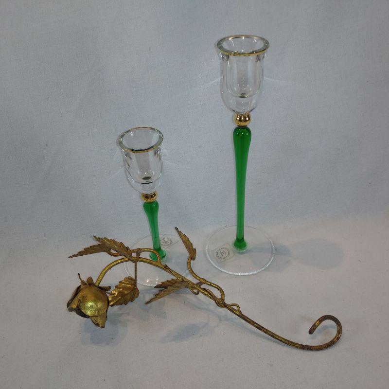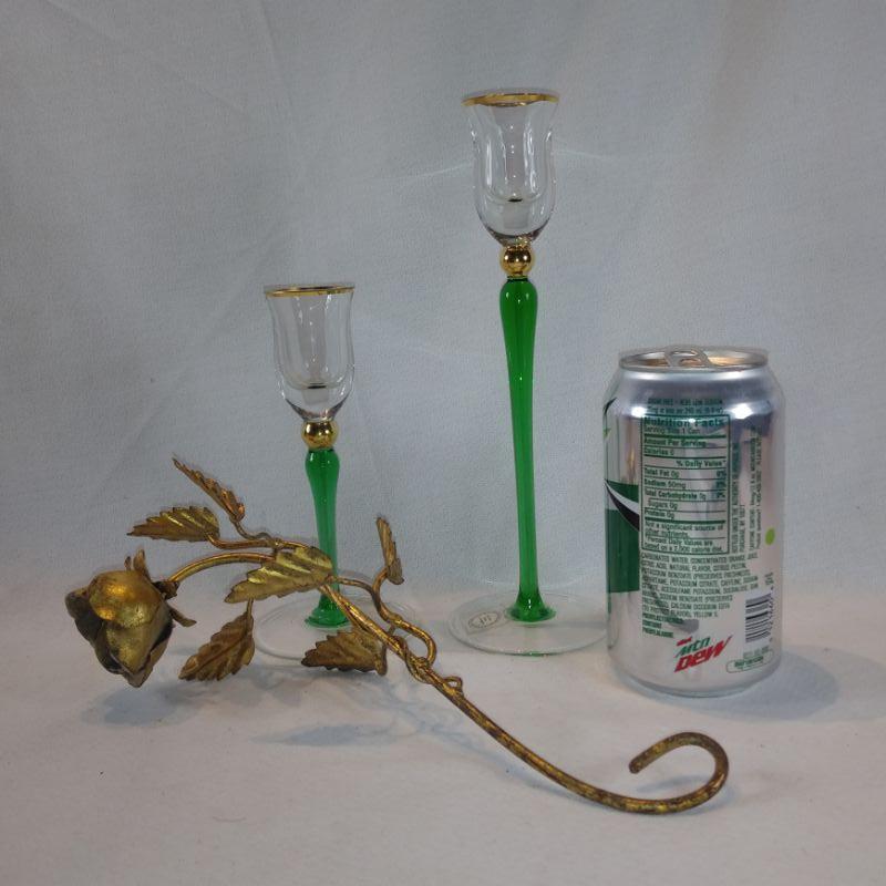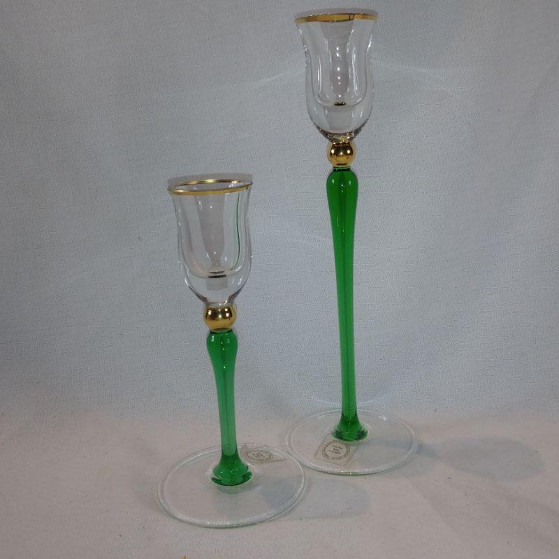 Two various height green stem candle stick holders with gold accents - new, unused - sticker still attached and says made in Hungary, hand made. They are 9-inches and 6-inches tall X 3-inches in diameter at the base.