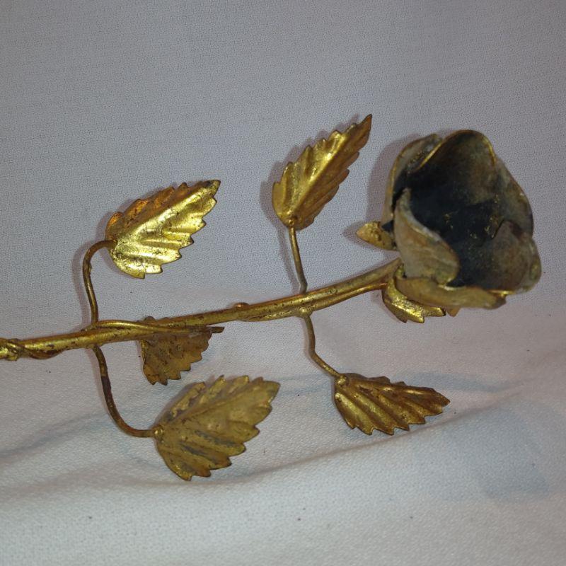 The gold "Rose" candle snuffer appears to be Italian. Has been used, still smoke residue inside of rose, other than that in very good condition. It is 10-inches long X 3-inches wide