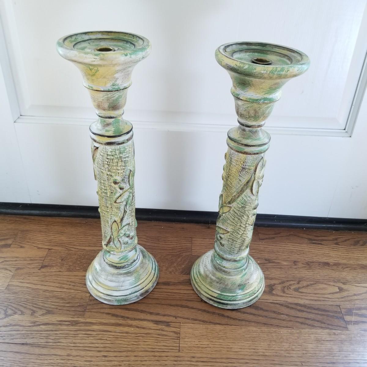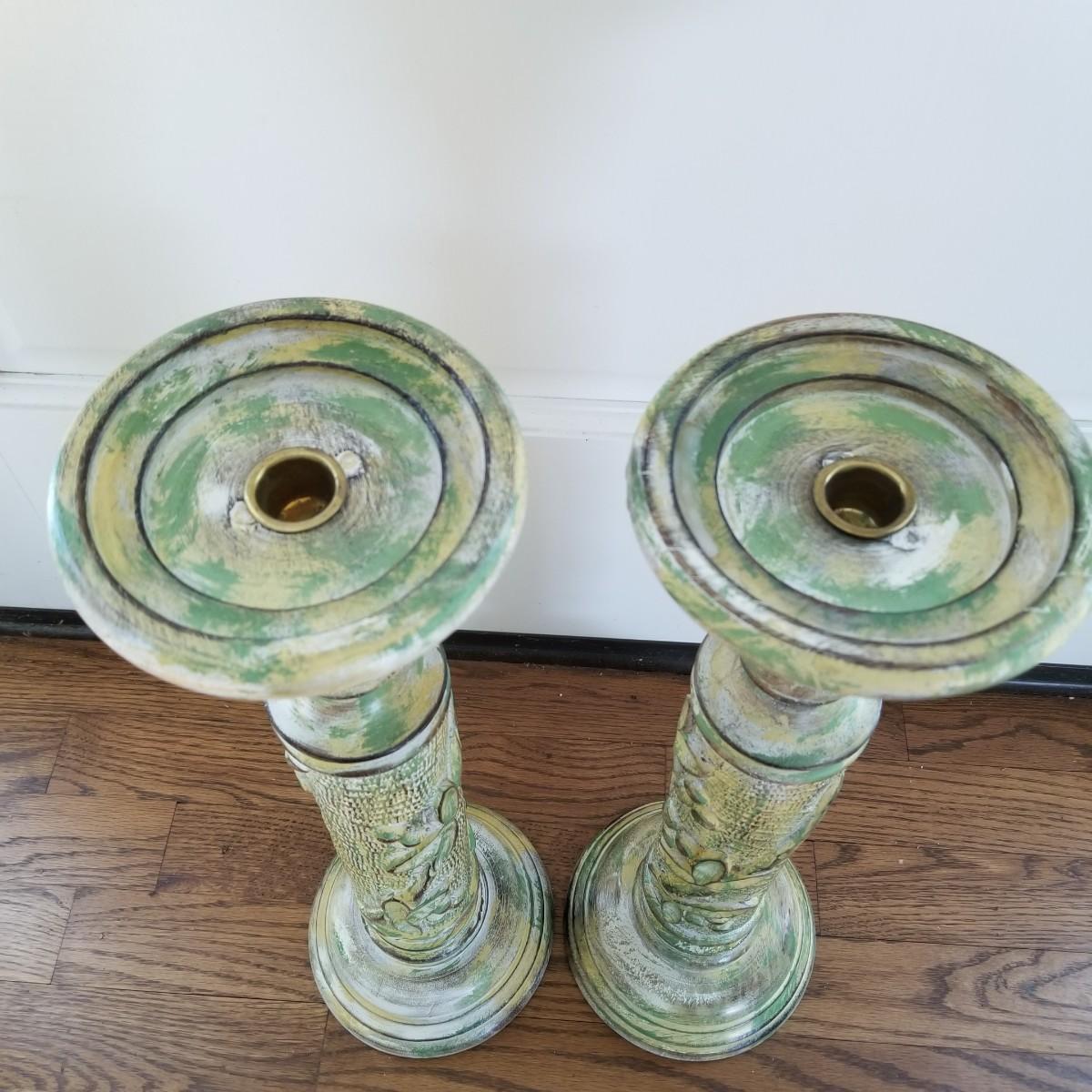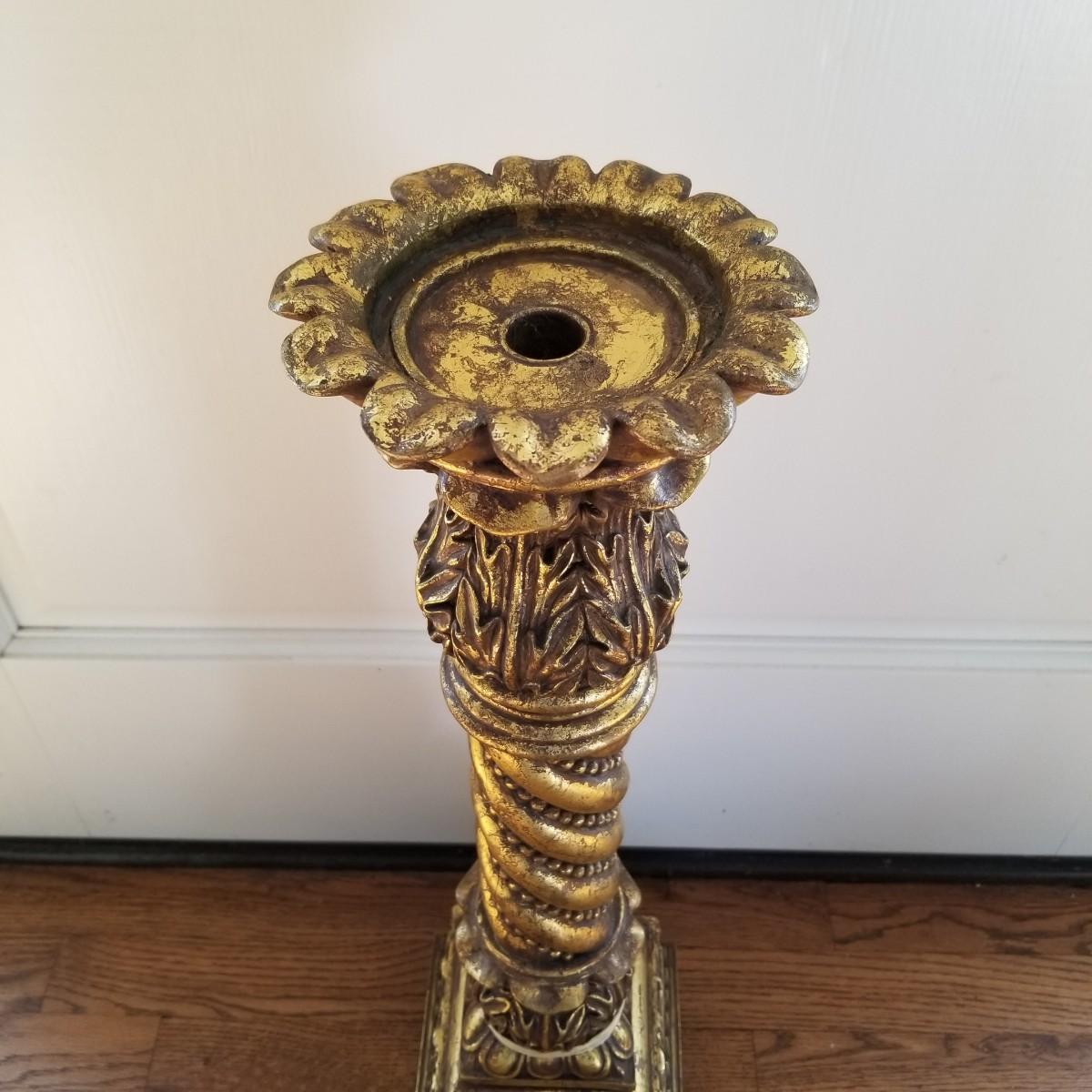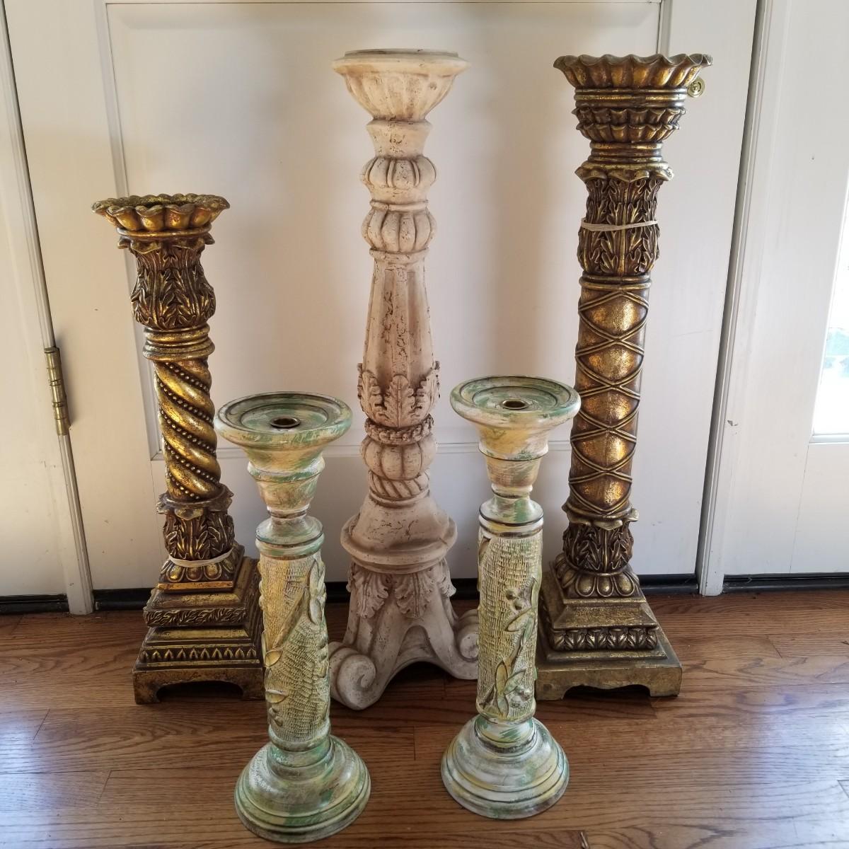 Five floor standing candlestick holders. One matching pair, white/green ceramic with flower motif, made in India, 18"h. One tall gold with fluted top, appears to be resin with criss-cross design, 30"h, Raz imports. One white with tri-foot pedestal base, appears to be resin, 31"h. One shorter gold with twist and bead design, Raz Imports, appears to be resin, 24 1/2"h. Will take various size candles from standard tapers and several sized column candles, 3"-4". All items show signs of normal use. Local pickup only.