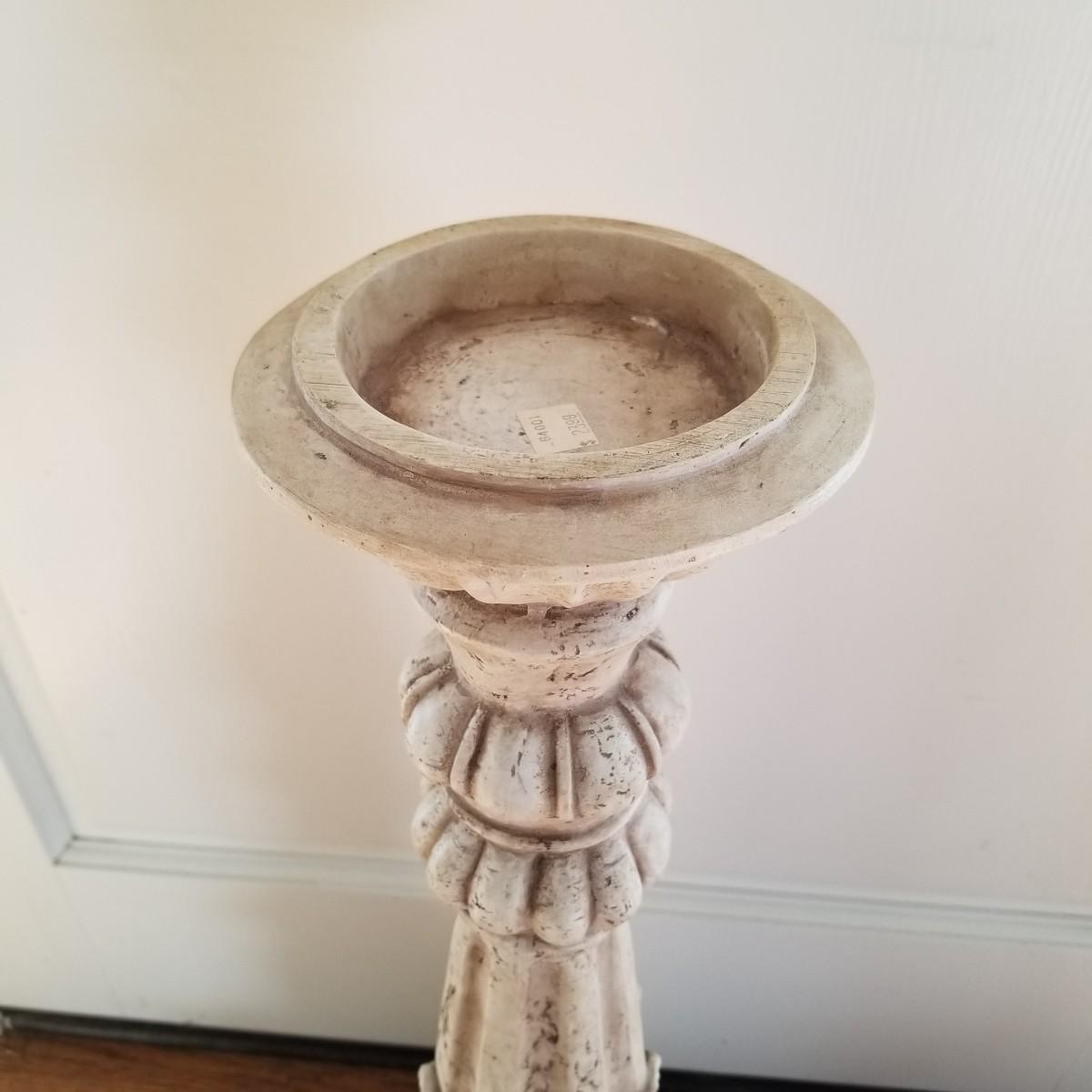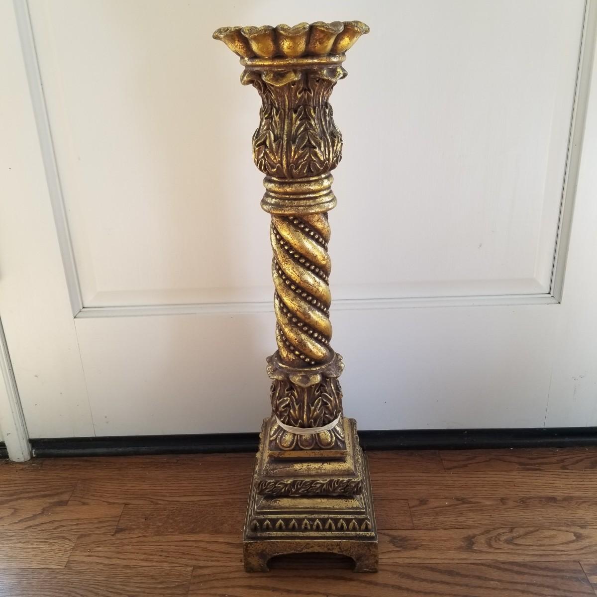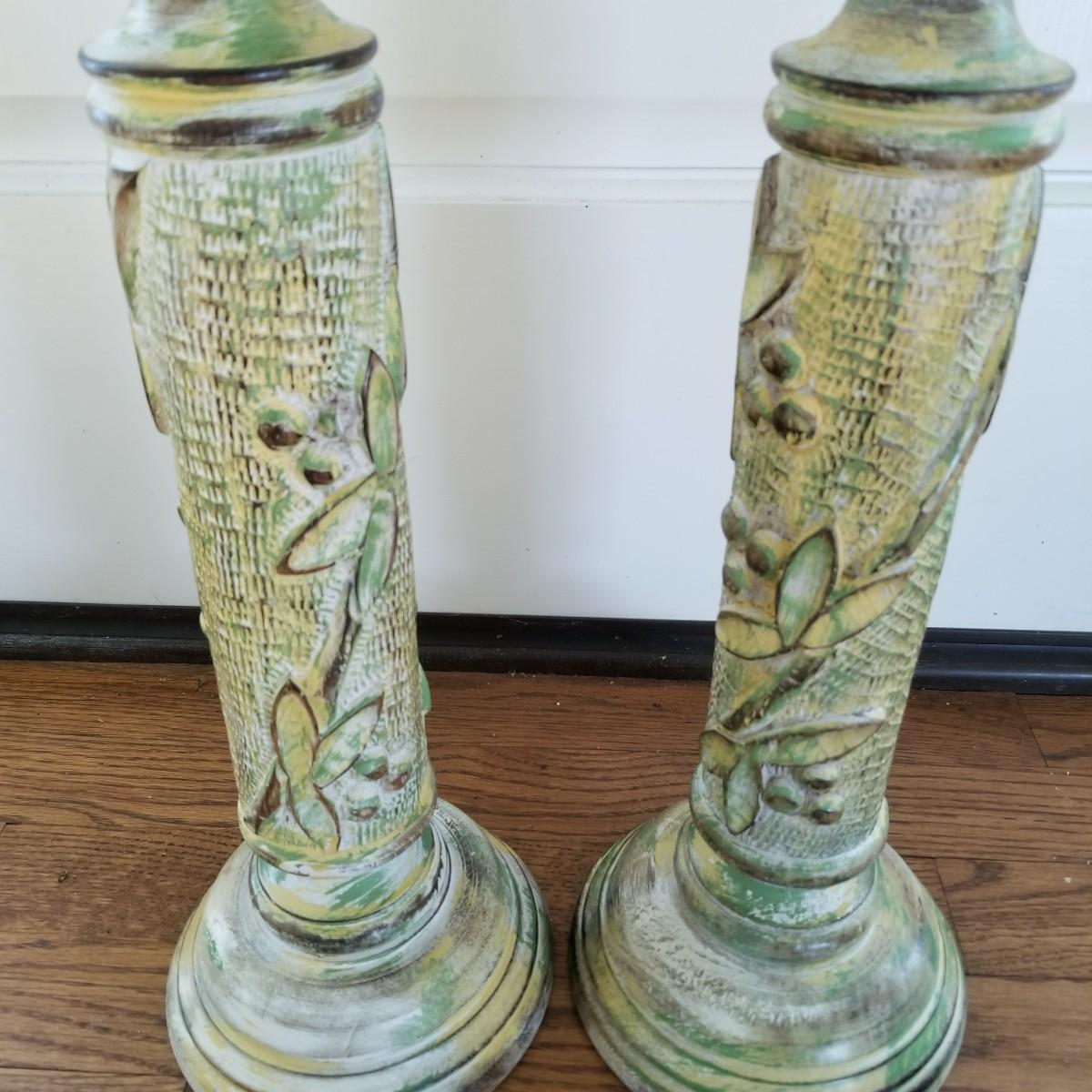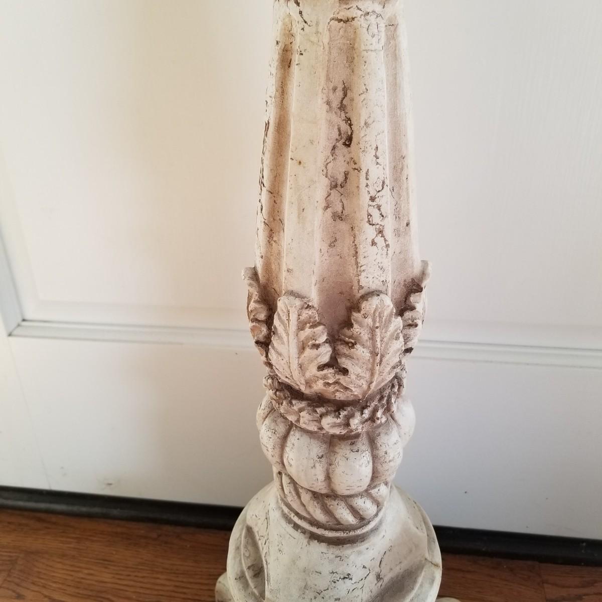 Five floor standing candlestick holders. One matching pair, white/green ceramic with flower motif, made in India, 18"h. One tall gold with fluted top, appears to be resin with criss-cross design, 30"h, Raz imports. One white with tri-foot pedestal base, appears to be resin, 31"h. One shorter gold with twist and bead design, Raz Imports, appears to be resin, 24 1/2"h. Will take various size candles from standard tapers and several sized column candles, 3"-4". All items show signs of normal use. Local pickup only.