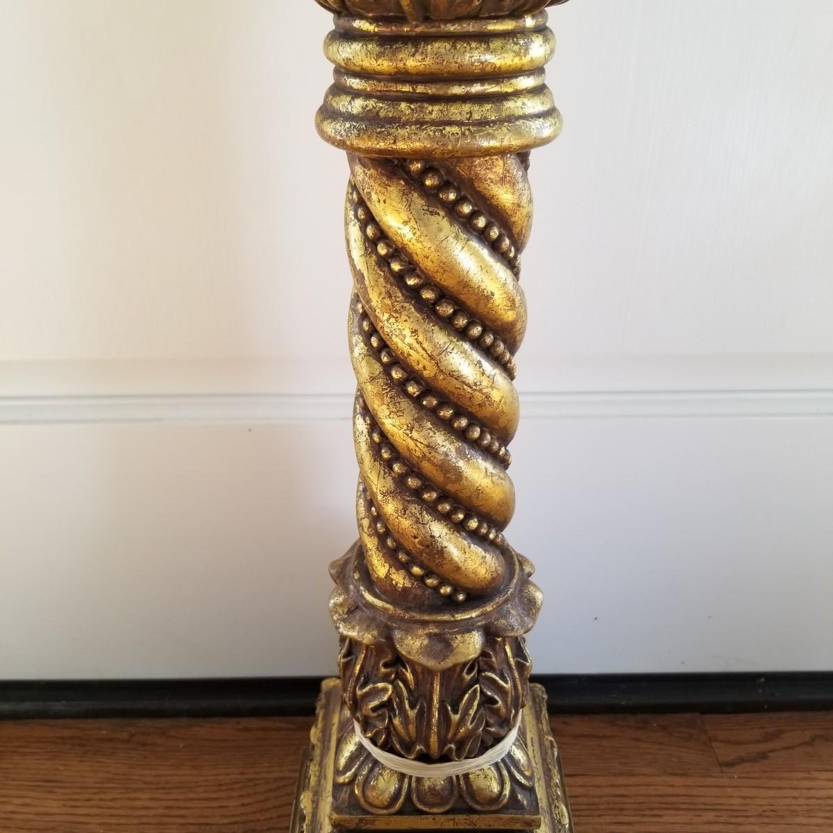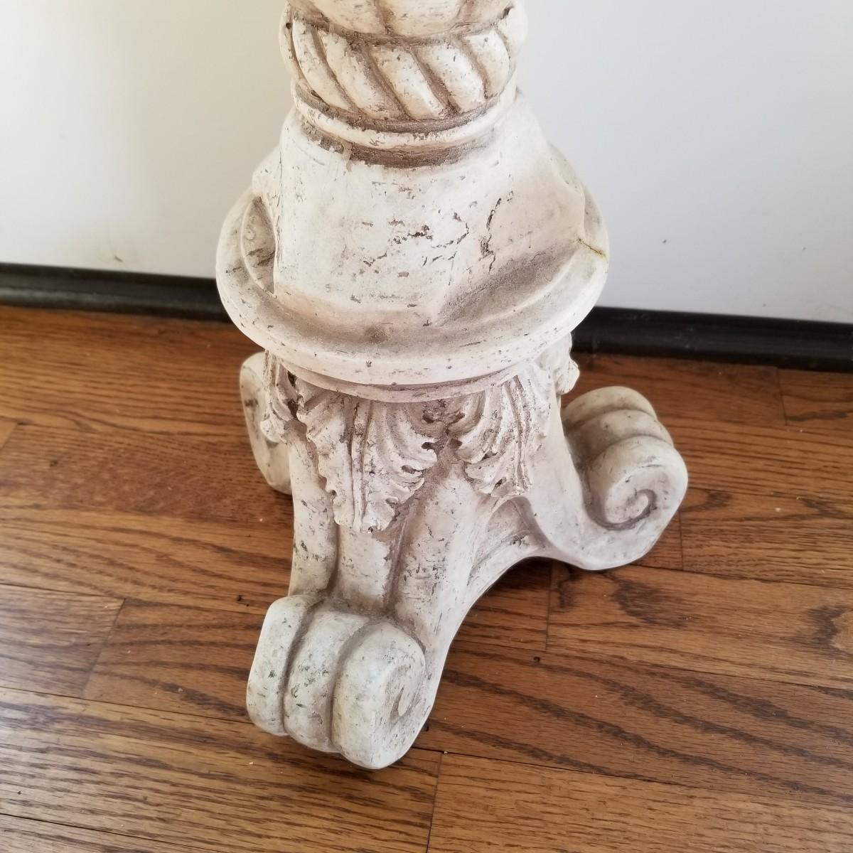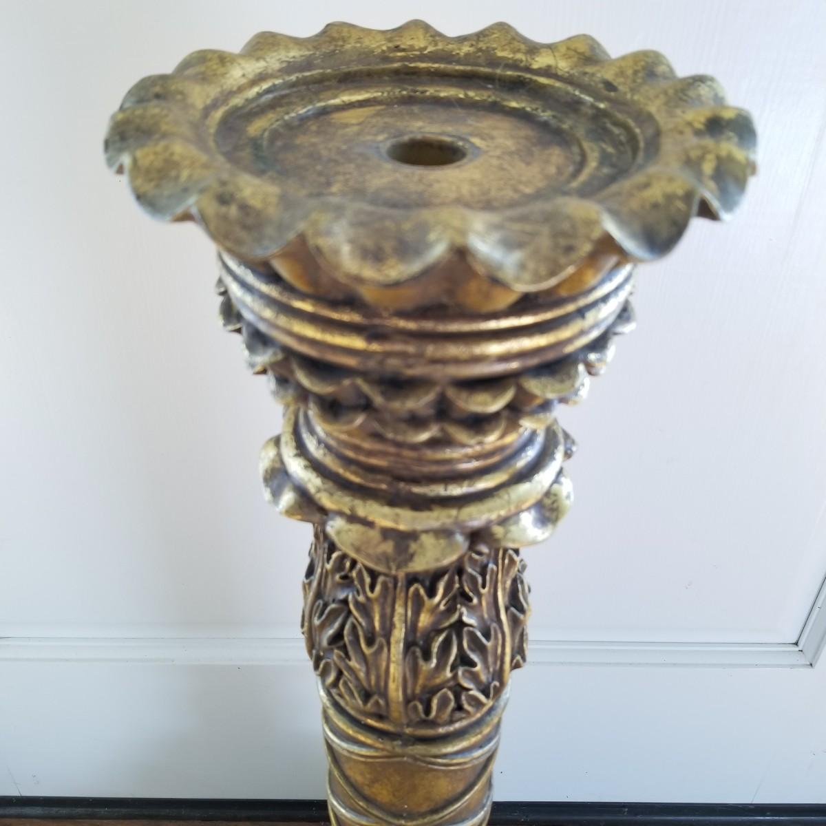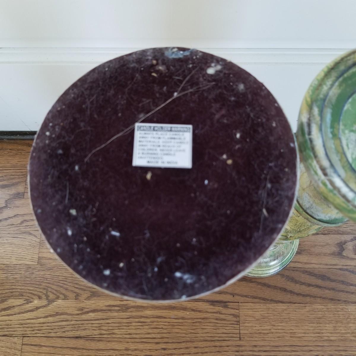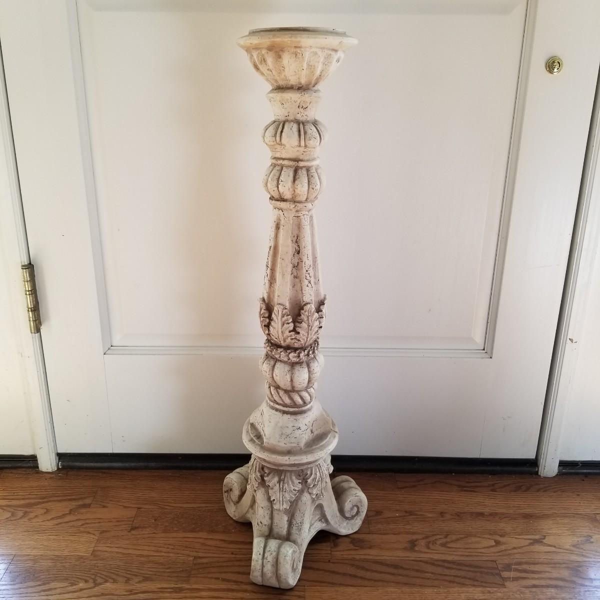 Five floor standing candlestick holders. One matching pair, white/green ceramic with flower motif, made in India, 18"h. One tall gold with fluted top, appears to be resin with criss-cross design, 30"h, Raz imports. One white with tri-foot pedestal base, appears to be resin, 31"h. One shorter gold with twist and bead design, Raz Imports, appears to be resin, 24 1/2"h. Will take various size candles from standard tapers and several sized column candles, 3"-4". All items show signs of normal use. Local pickup only.