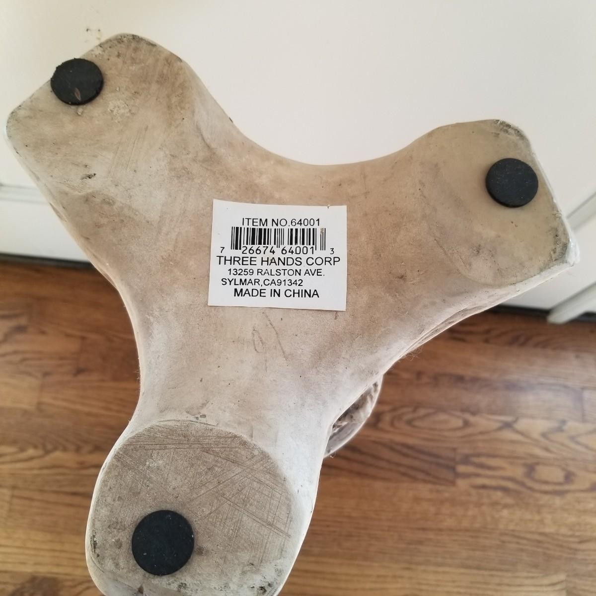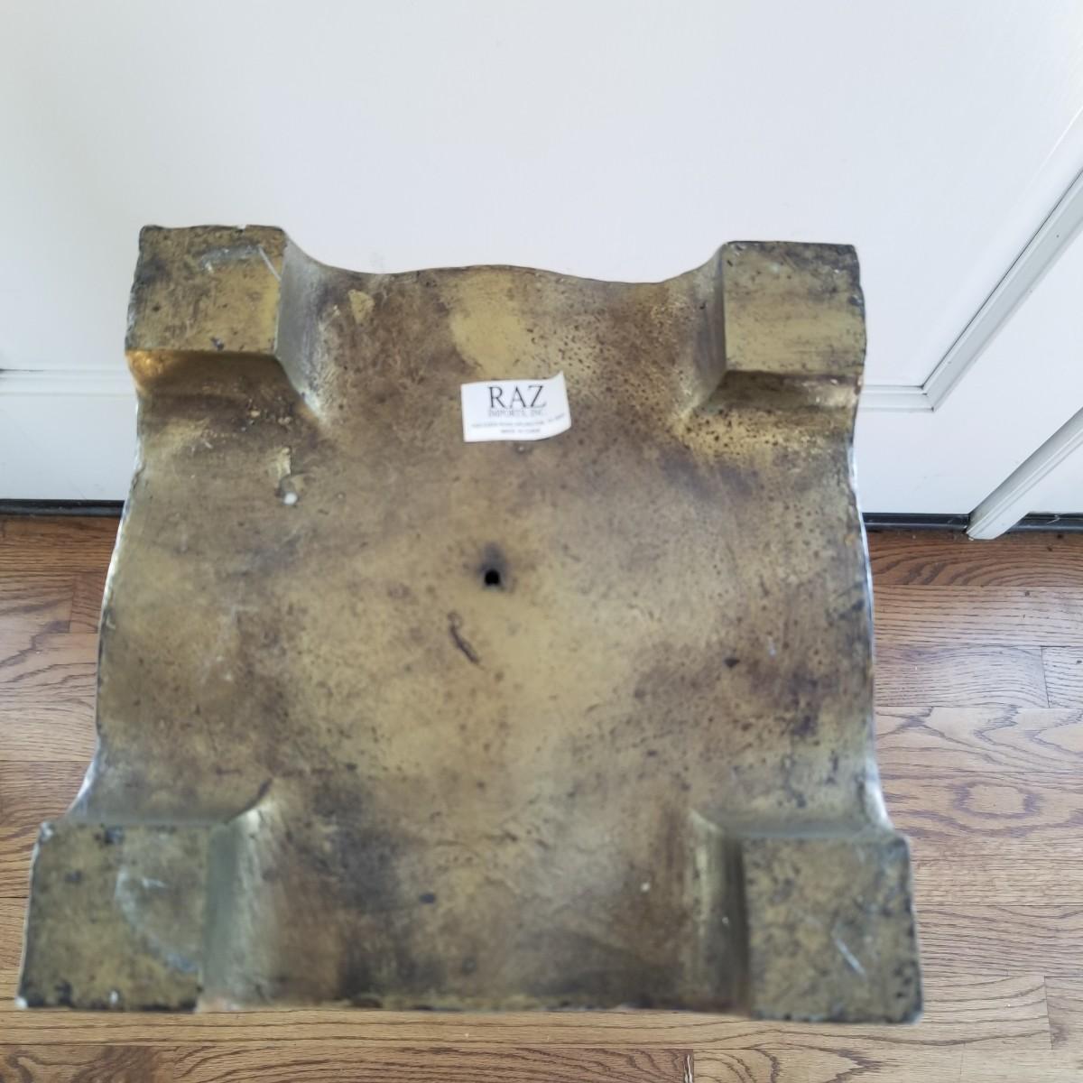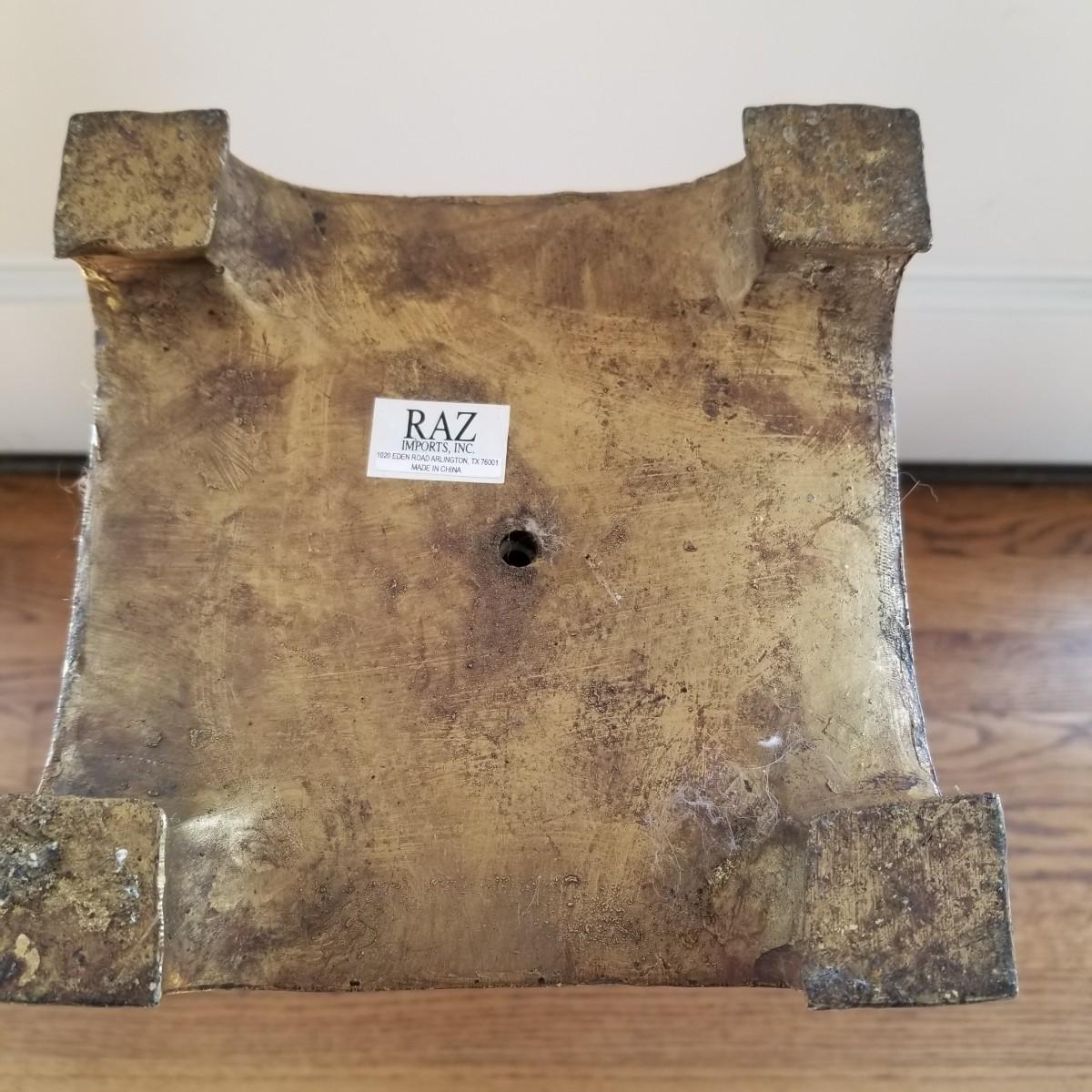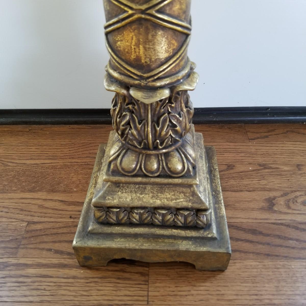 Five floor standing candlestick holders. One matching pair, white/green ceramic with flower motif, made in India, 18"h. One tall gold with fluted top, appears to be resin with criss-cross design, 30"h, Raz imports. One white with tri-foot pedestal base, appears to be resin, 31"h. One shorter gold with twist and bead design, Raz Imports, appears to be resin, 24 1/2"h. Will take various size candles from standard tapers and several sized column candles, 3"-4". All items show signs of normal use. Local pickup only.