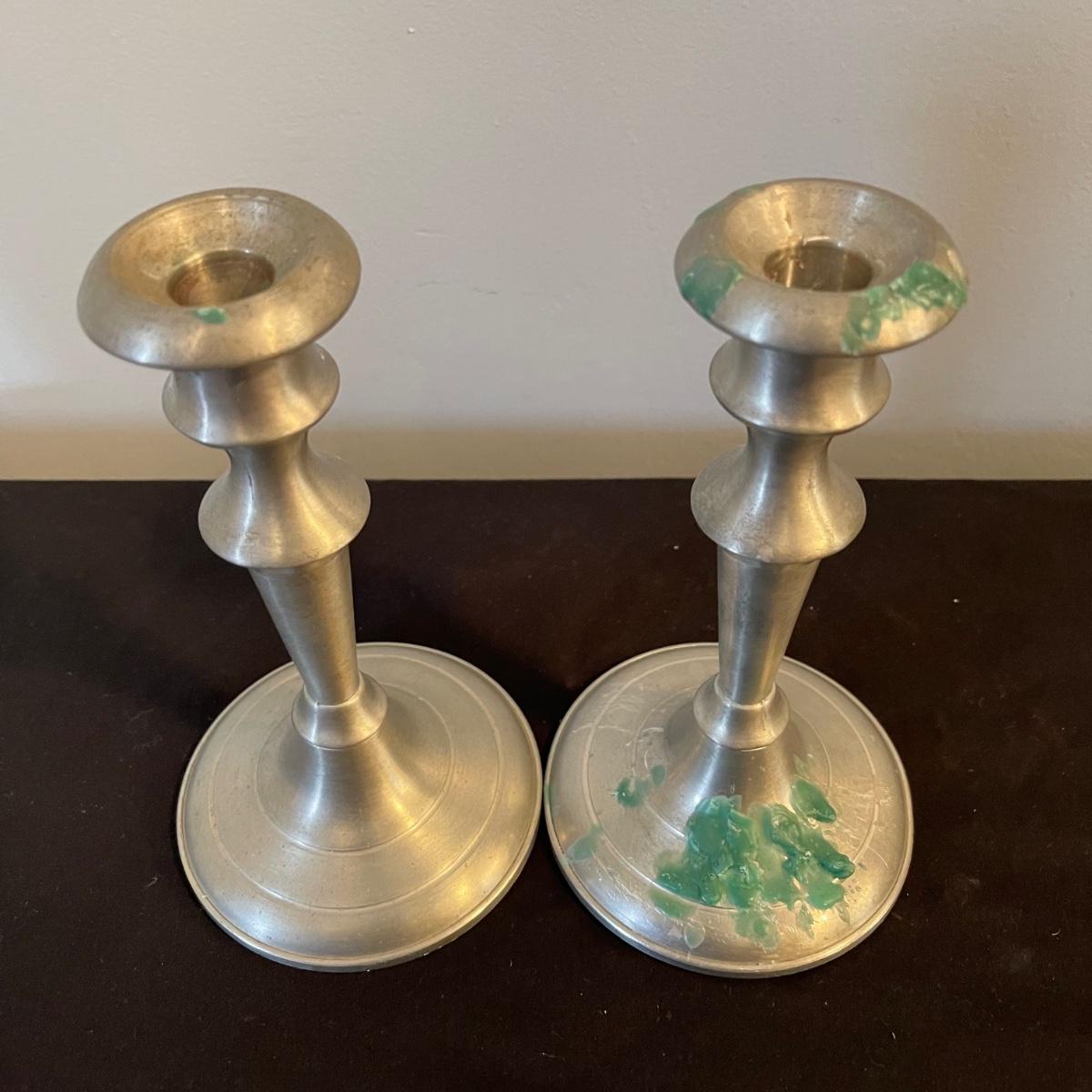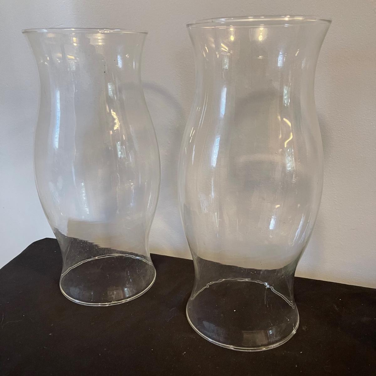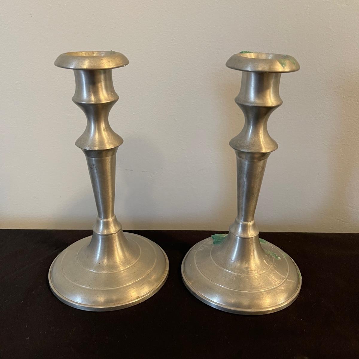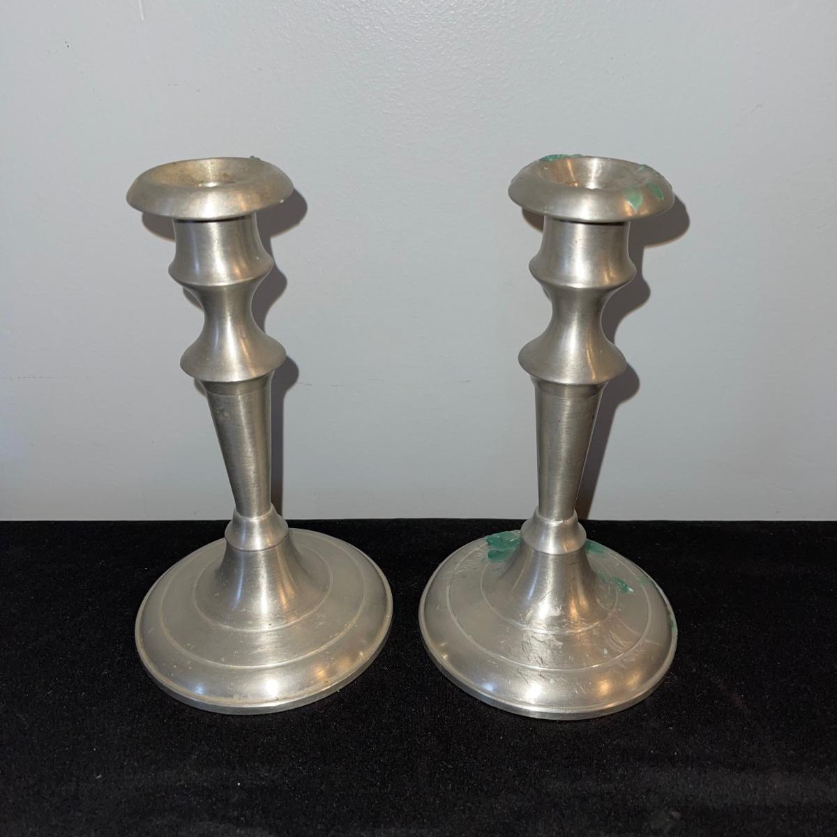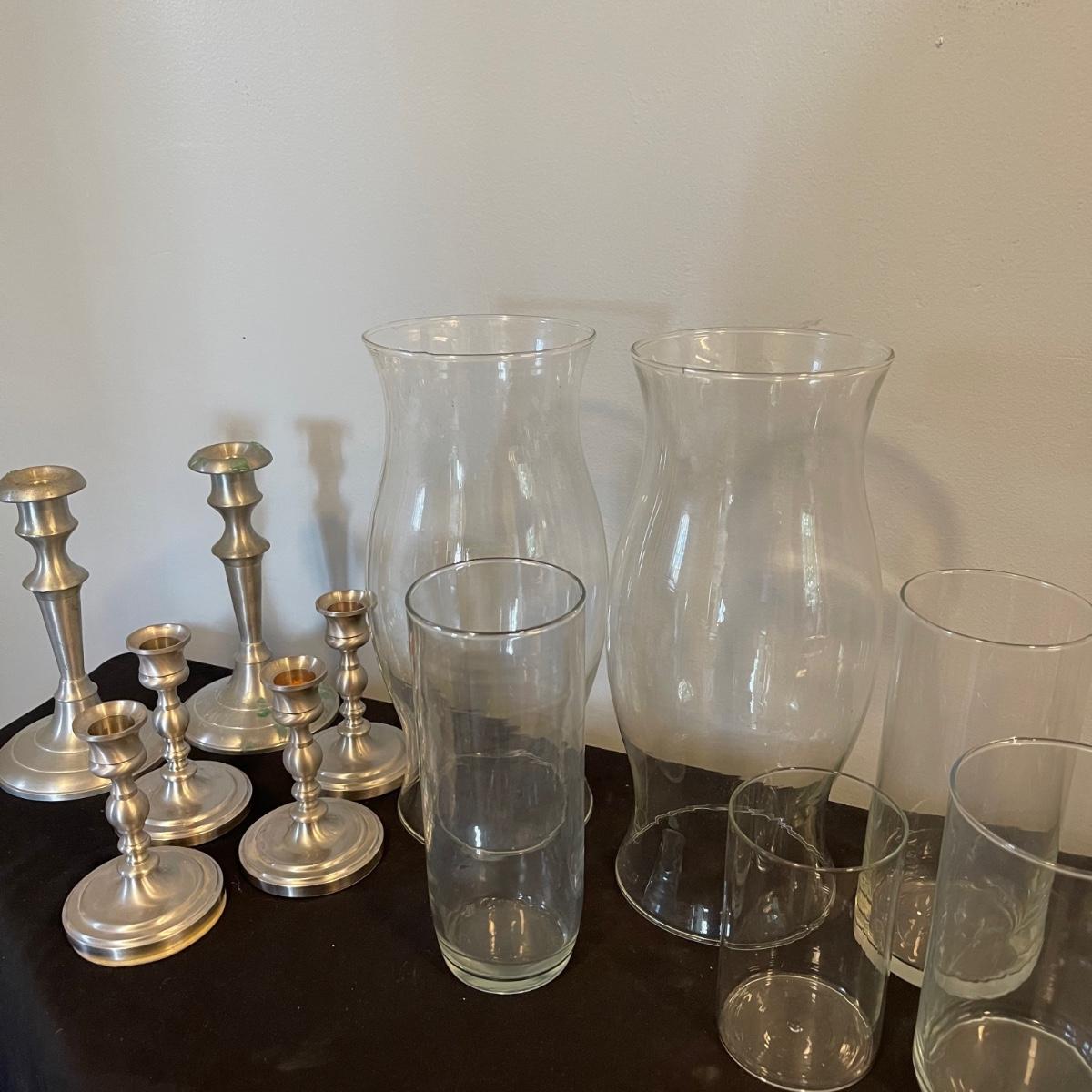 This candlestick and glass cylinder lot includes two Henry Ford museum candle sticks, four 4.75” Baldwin candle sticks, two open ended glass candle shields measuring just under 1ft, and four size varying glass cylinder vases. One of the two silver colored candlesticks has wax stuck to it but just needs to be cleaned.