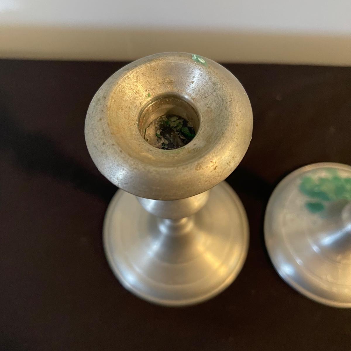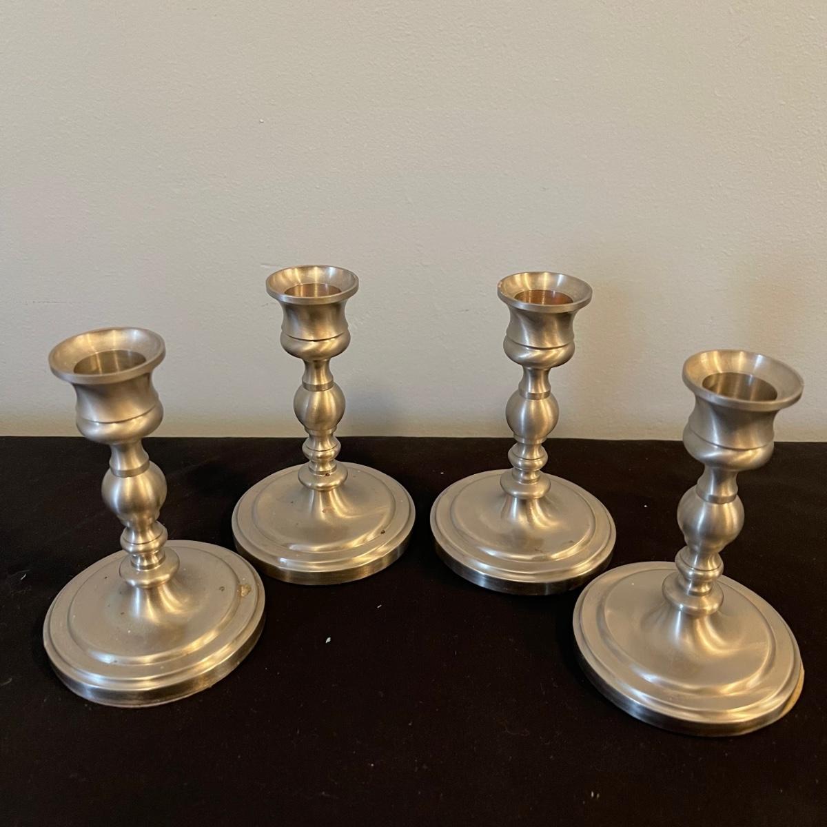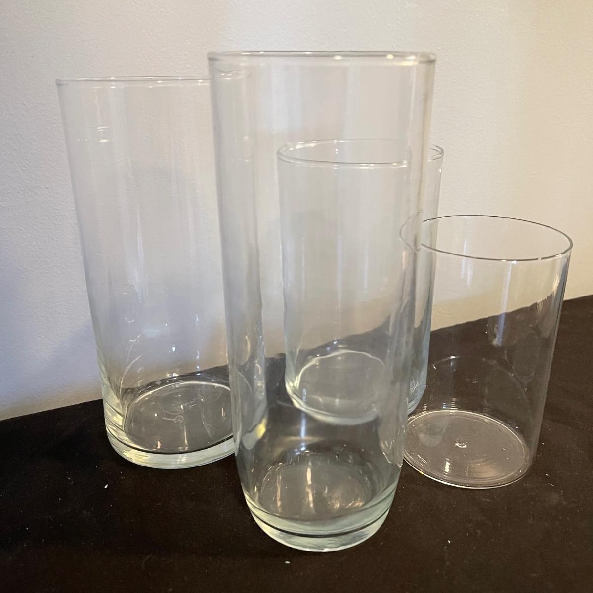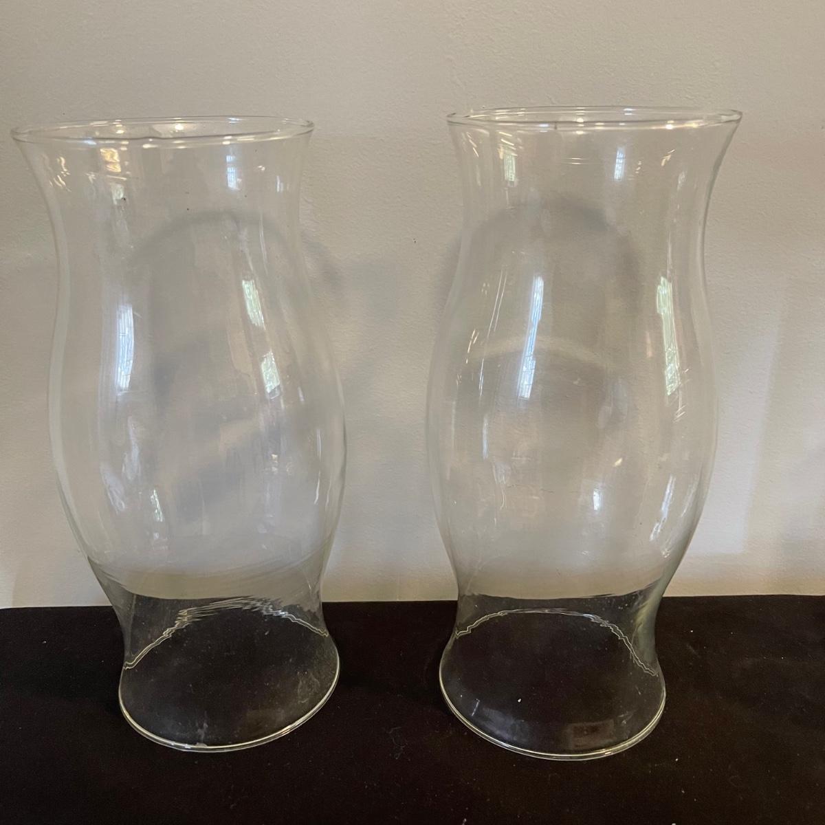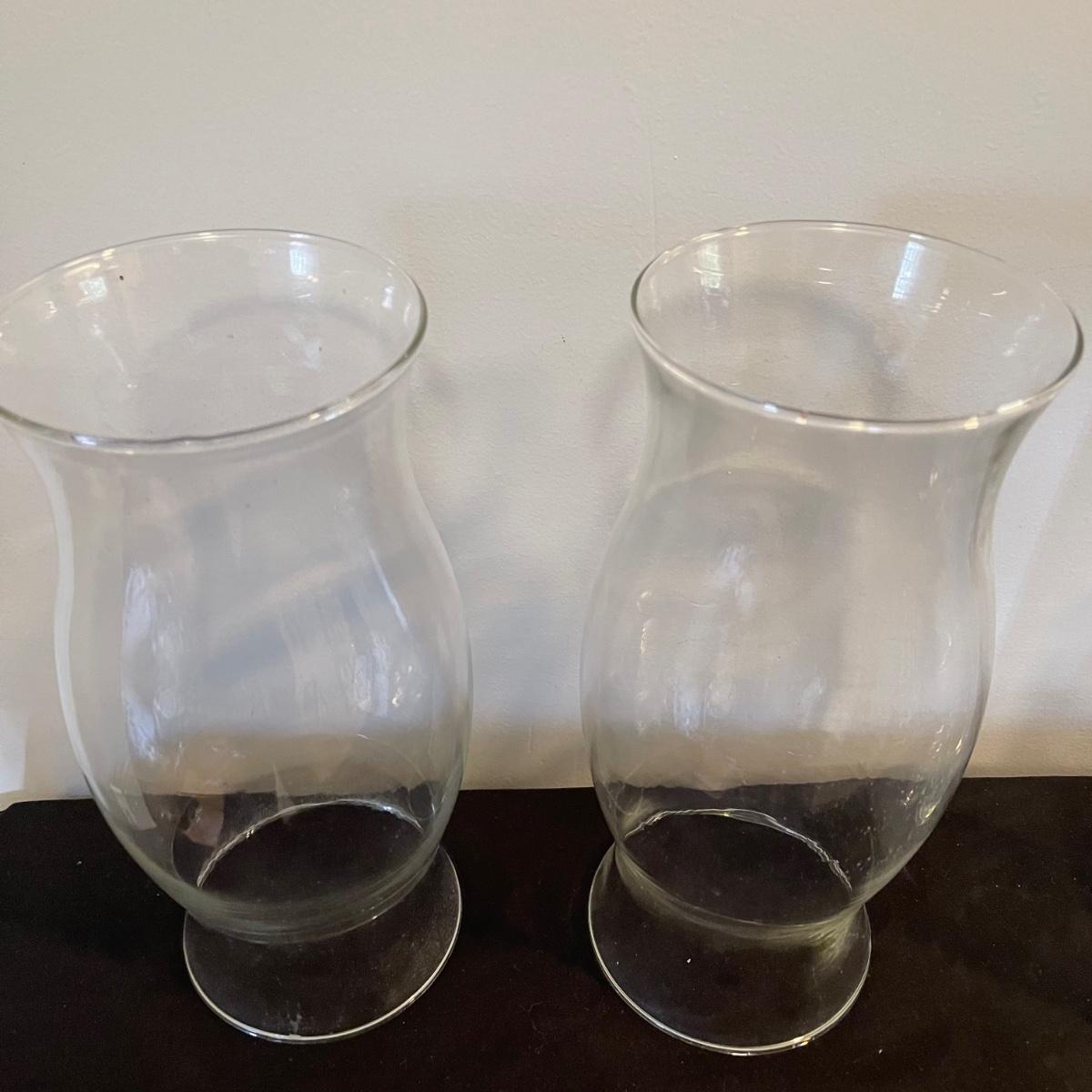 This candlestick and glass cylinder lot includes two Henry Ford museum candle sticks, four 4.75” Baldwin candle sticks, two open ended glass candle shields measuring just under 1ft, and four size varying glass cylinder vases. One of the two silver colored candlesticks has wax stuck to it but just needs to be cleaned.
