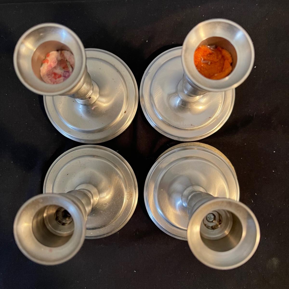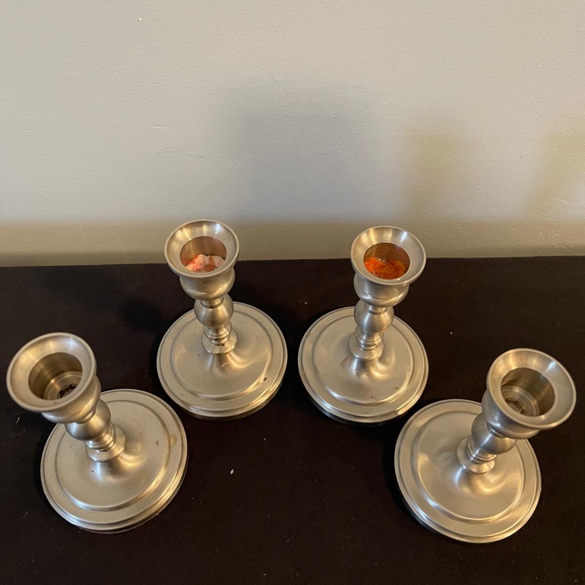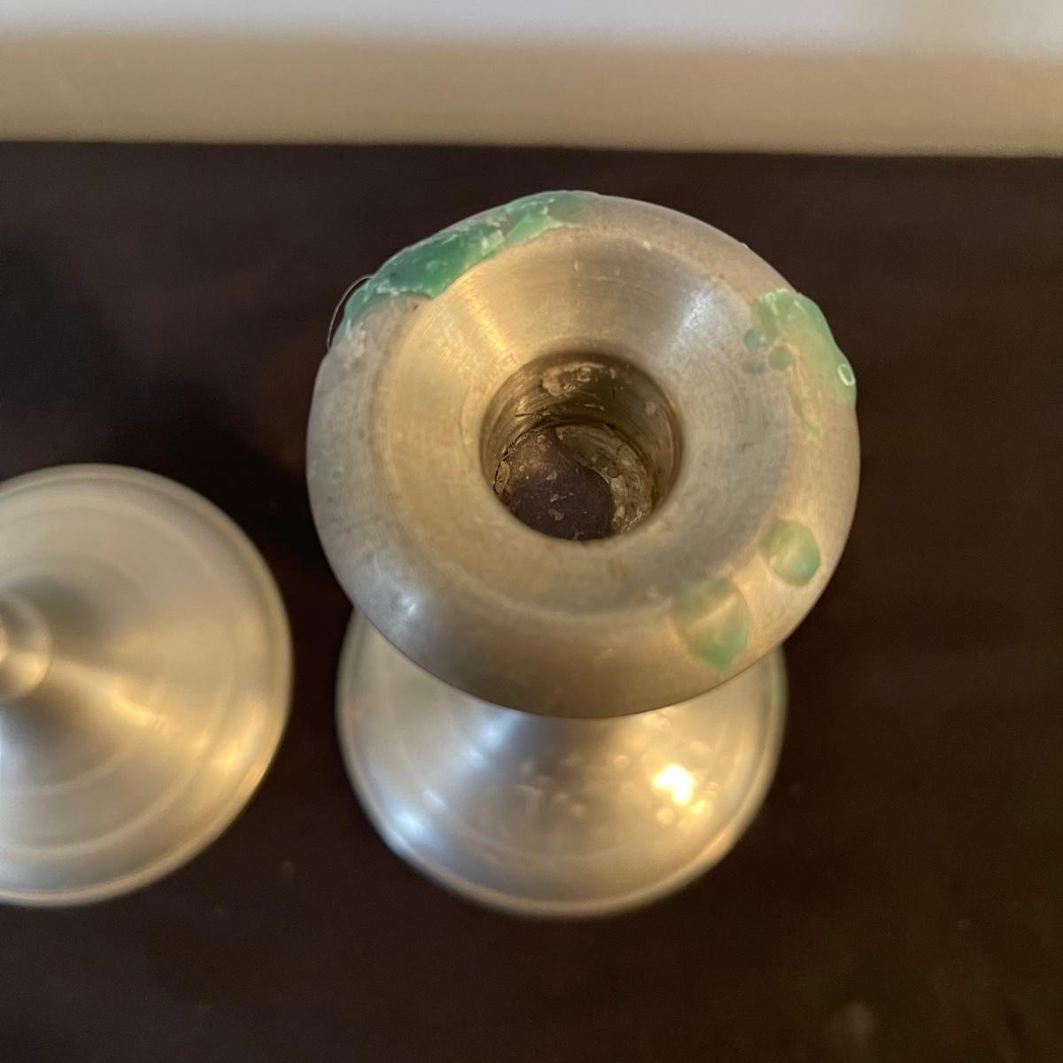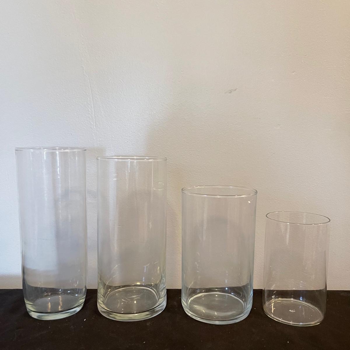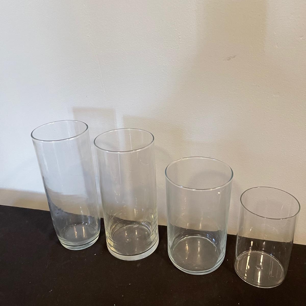 This candlestick and glass cylinder lot includes two Henry Ford museum candle sticks, four 4.75” Baldwin candle sticks, two open ended glass candle shields measuring just under 1ft, and four size varying glass cylinder vases. One of the two silver colored candlesticks has wax stuck to it but just needs to be cleaned.