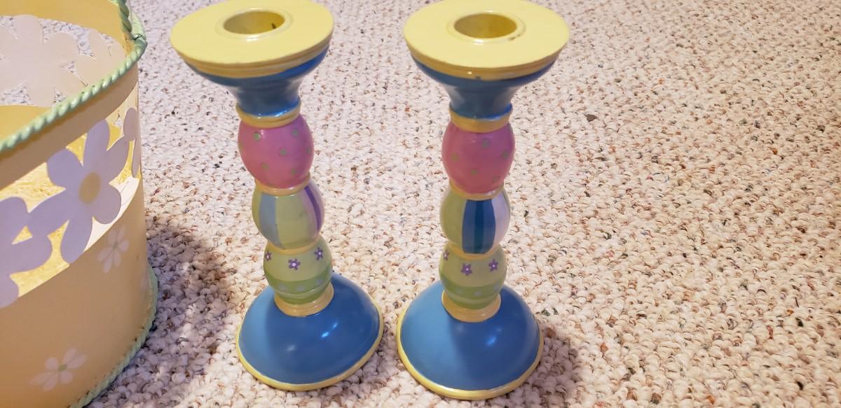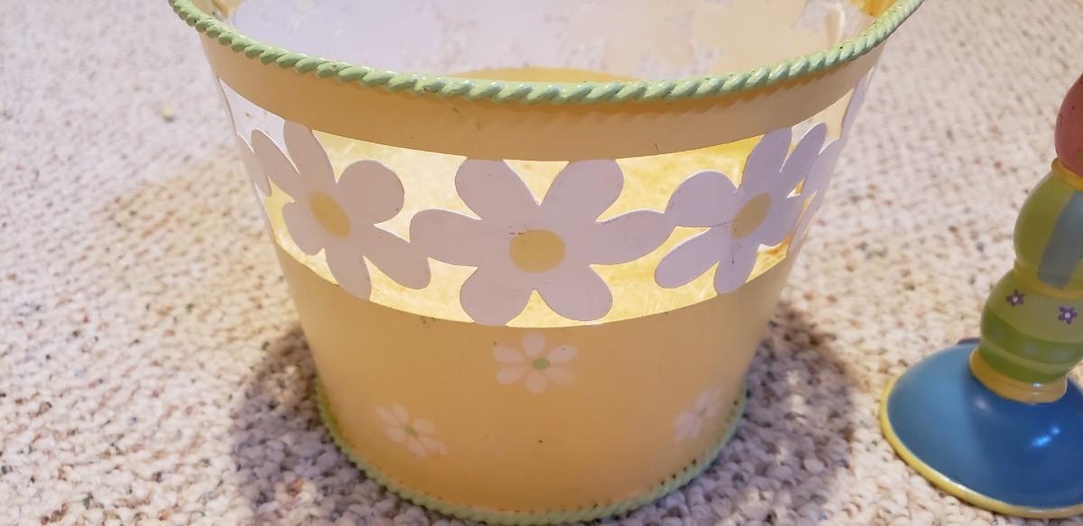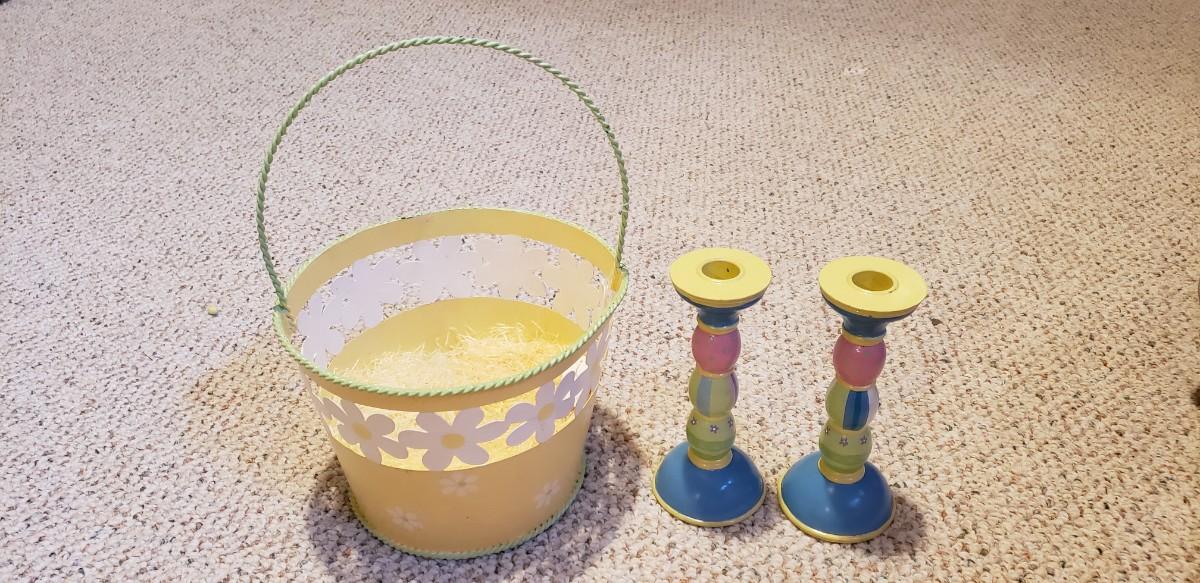 Set of 2 decorative candlestick holders 3"x7"with metal yellow daisy handled basket : 8" diameter 6 "tall 12" with handle
