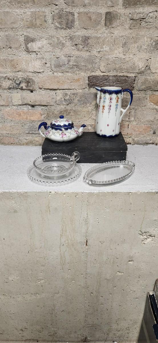 Three pieces of Candlewick and two really great old pots