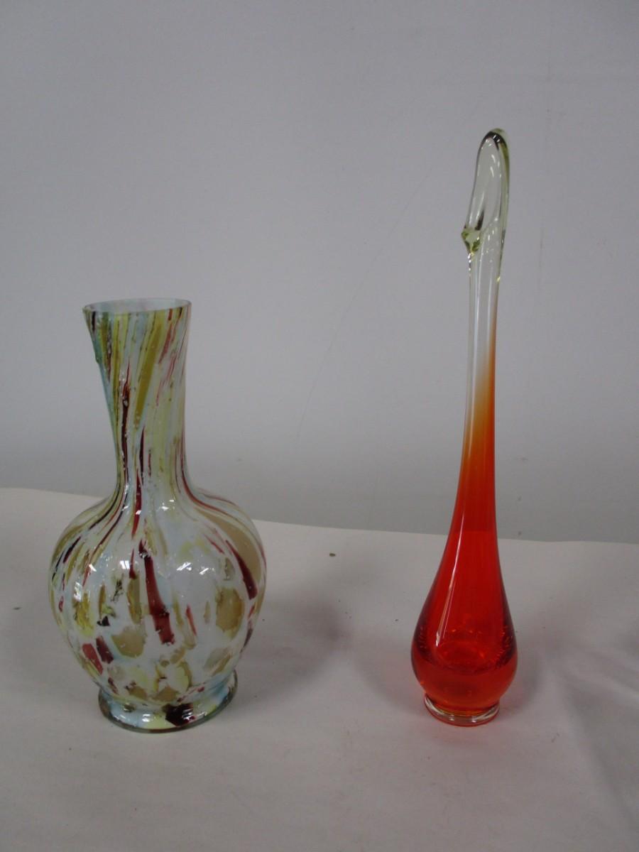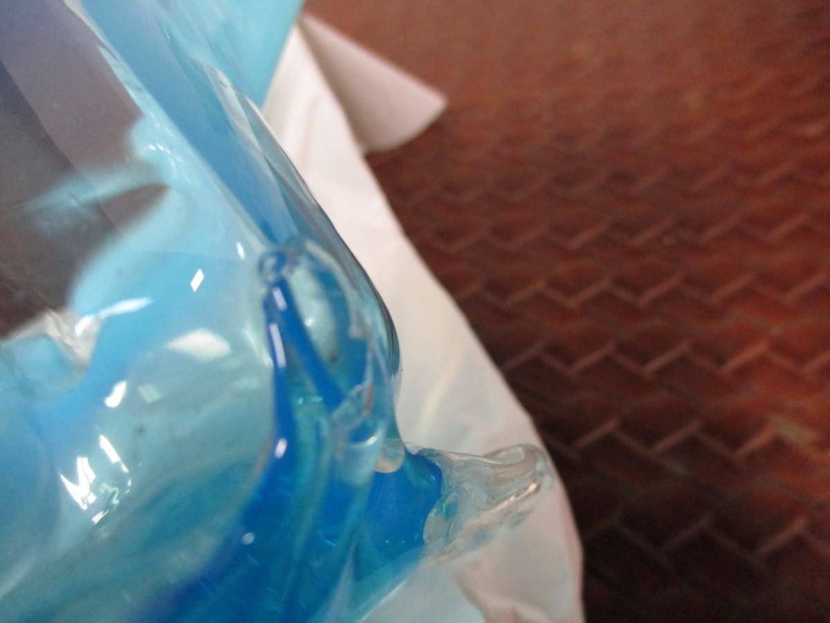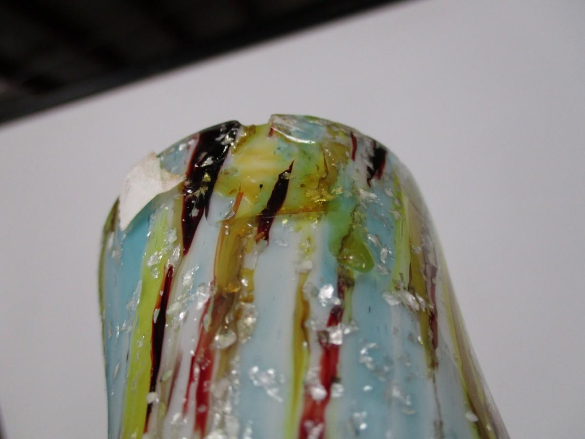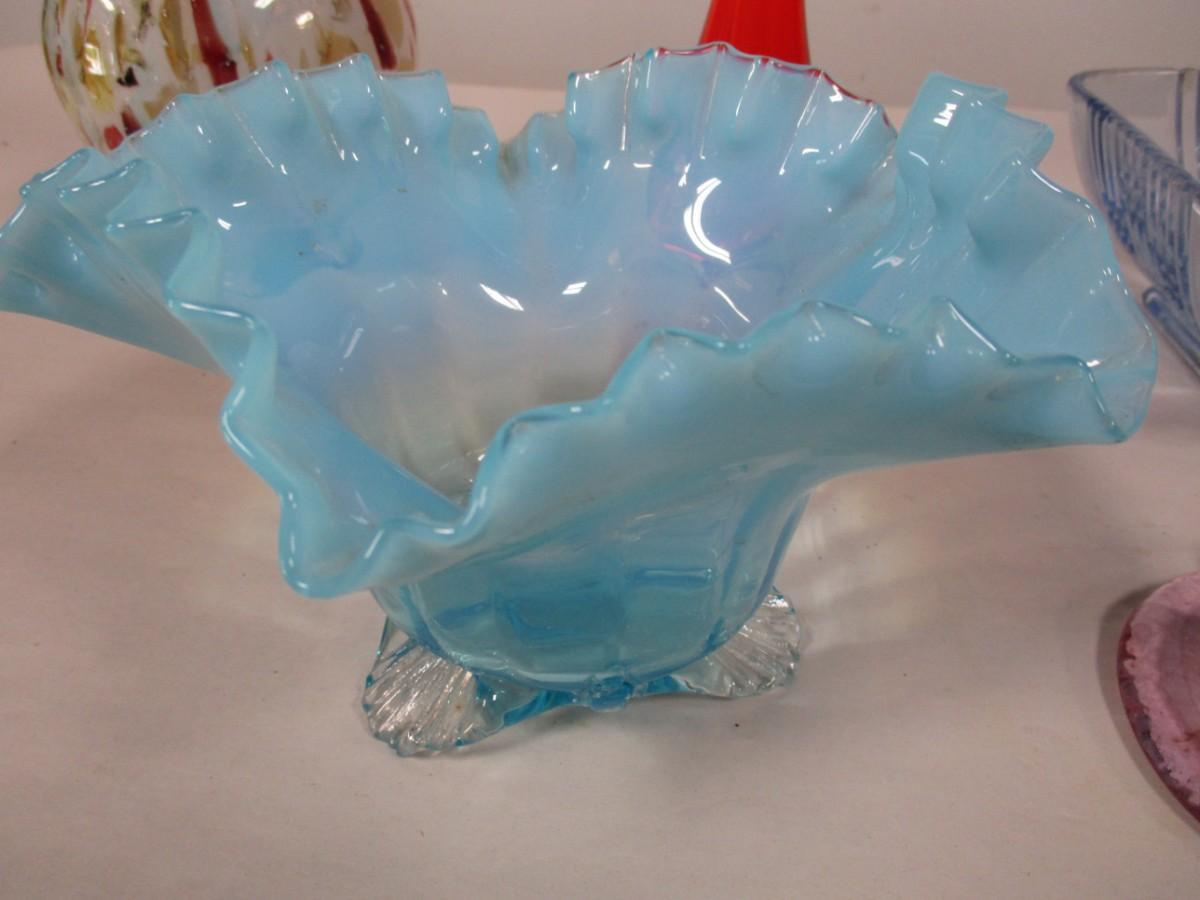 The multi colored vase has a chip as well as the blue footed ruffled dish