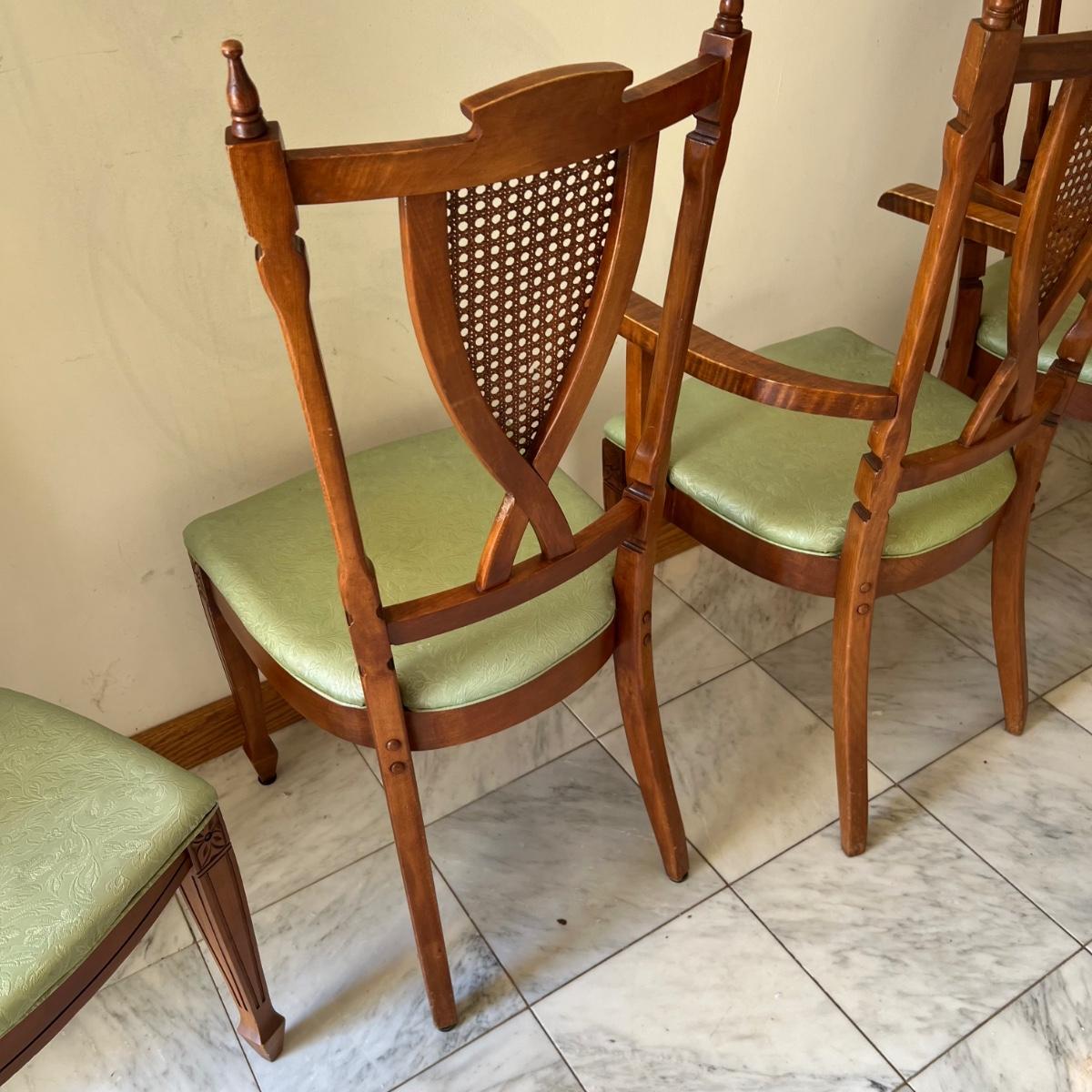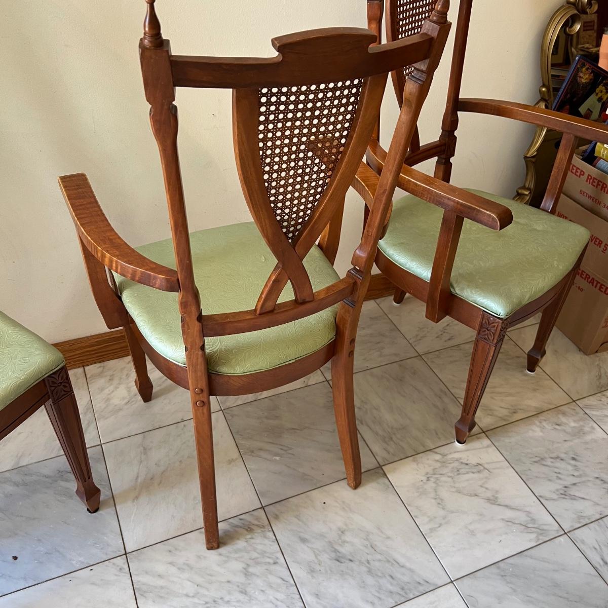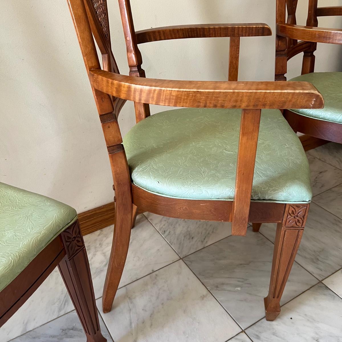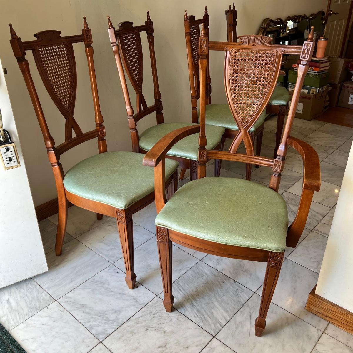 Five dining chairs are a beautiful honey colored solid wood with intricate carved detailing. The seats are a vinyl material with a jacquard embossed texture and are mint green color. Two of the five chairs have arms and measure 23” x 17” x 41”H with 18” seat height. One of these chairs has a small crack in the upholstery, see image.