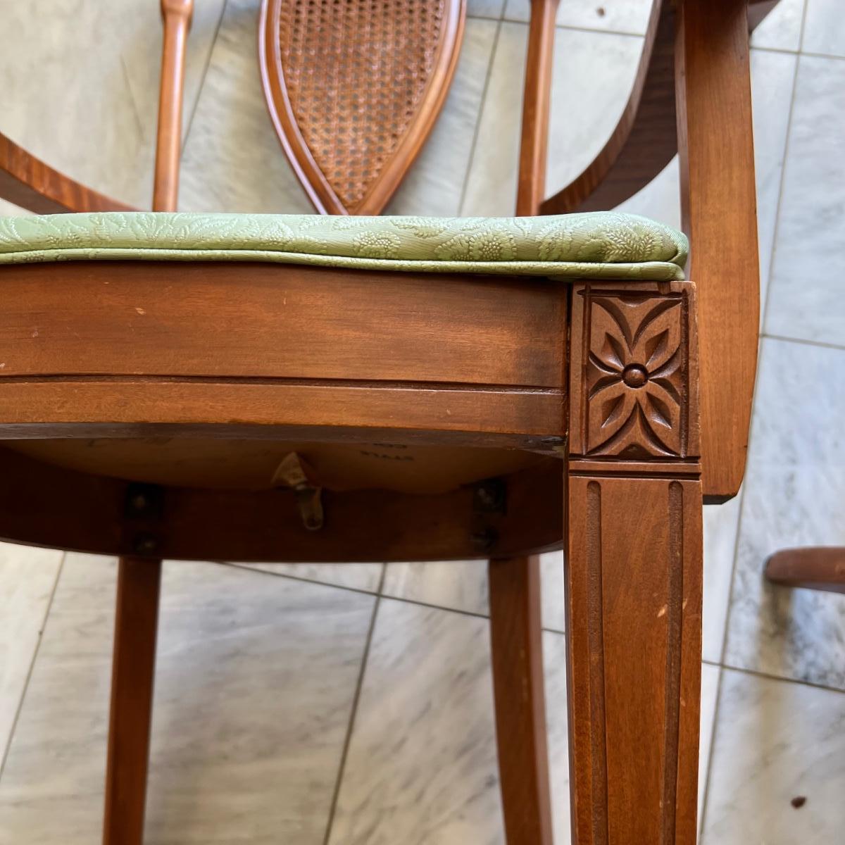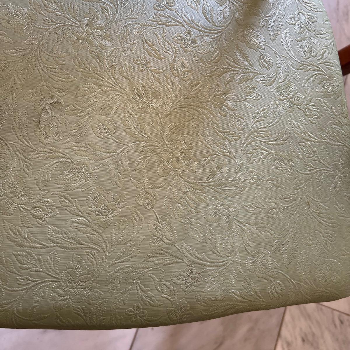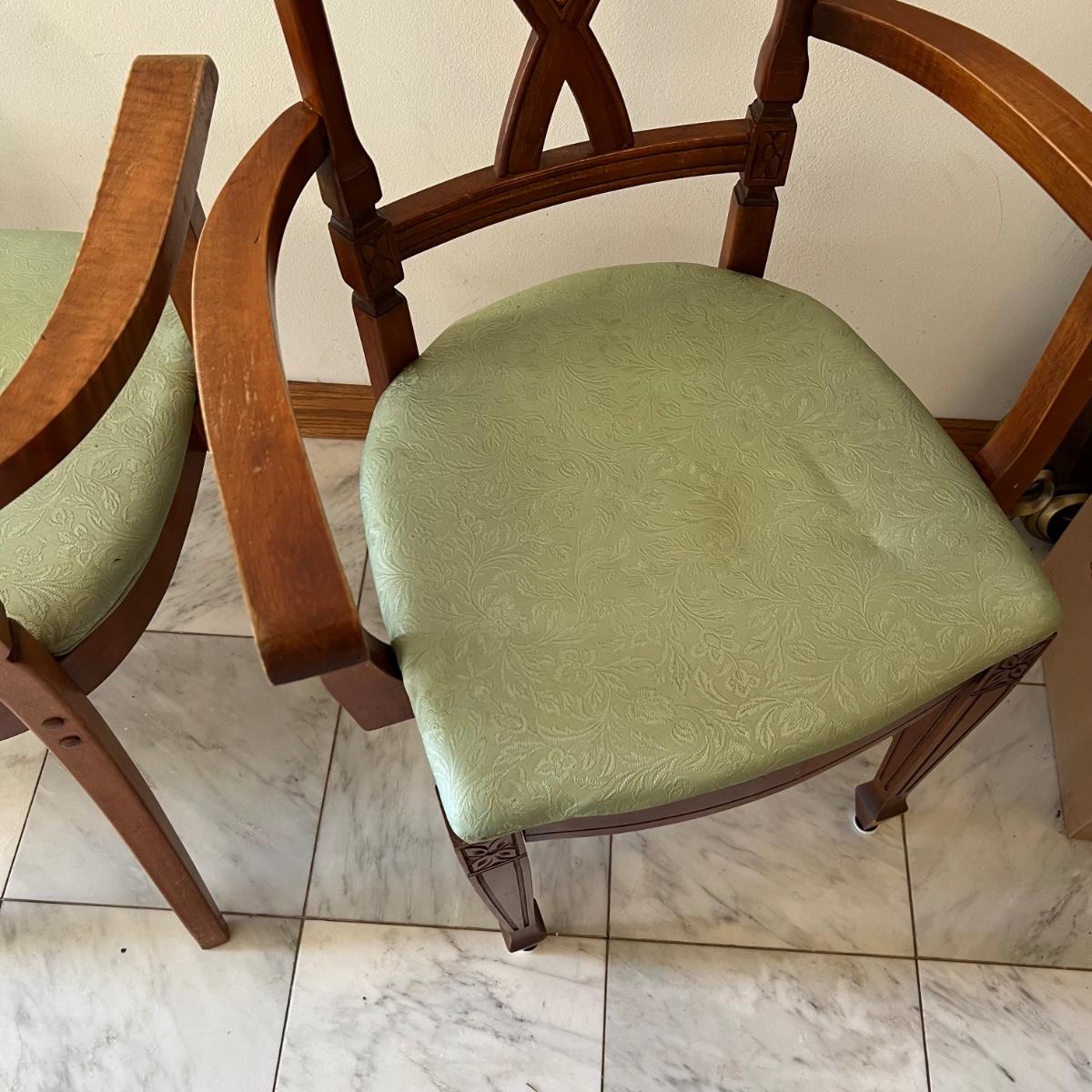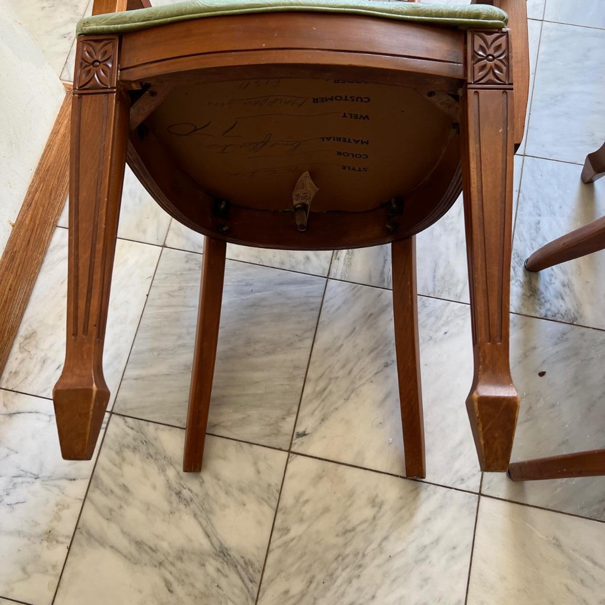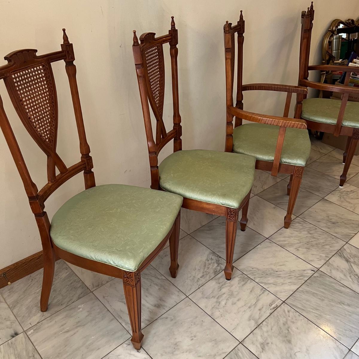 Five dining chairs are a beautiful honey colored solid wood with intricate carved detailing. The seats are a vinyl material with a jacquard embossed texture and are mint green color. Two of the five chairs have arms and measure 23” x 17” x 41”H with 18” seat height. One of these chairs has a small crack in the upholstery, see image.