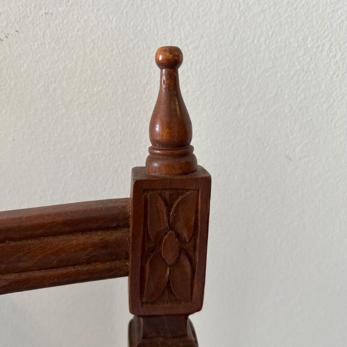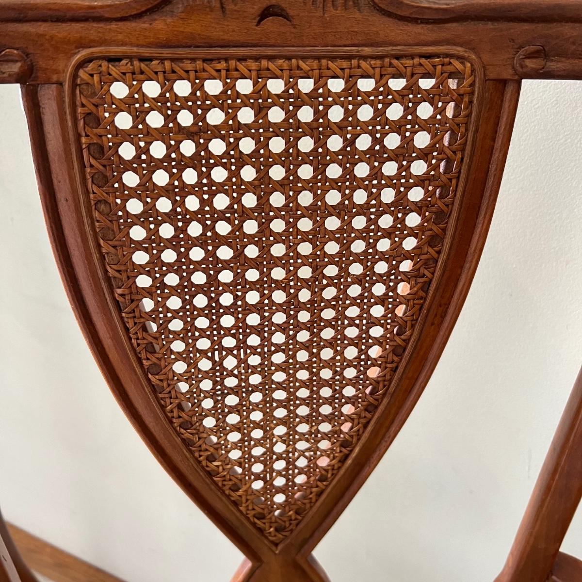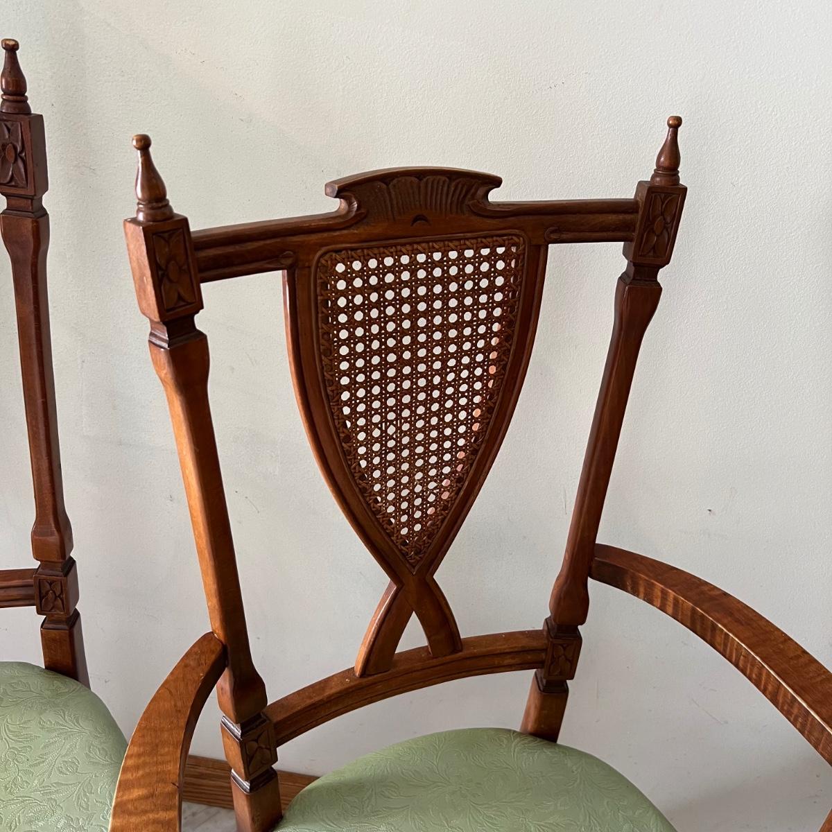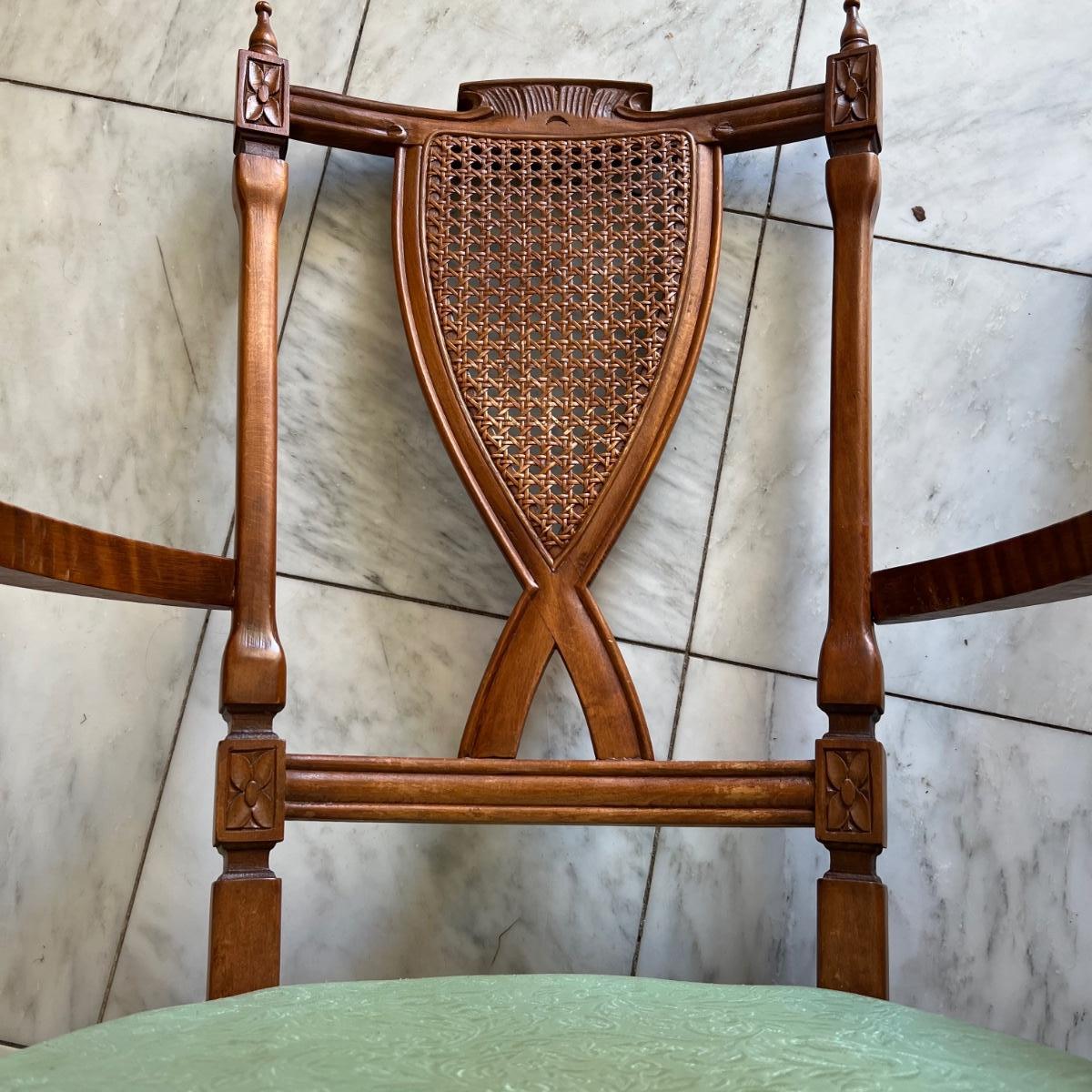 Five dining chairs are a beautiful honey colored solid wood with intricate carved detailing. The seats are a vinyl material with a jacquard embossed texture and are mint green color. Two of the five chairs have arms and measure 23” x 17” x 41”H with 18” seat height. One of these chairs has a small crack in the upholstery, see image.