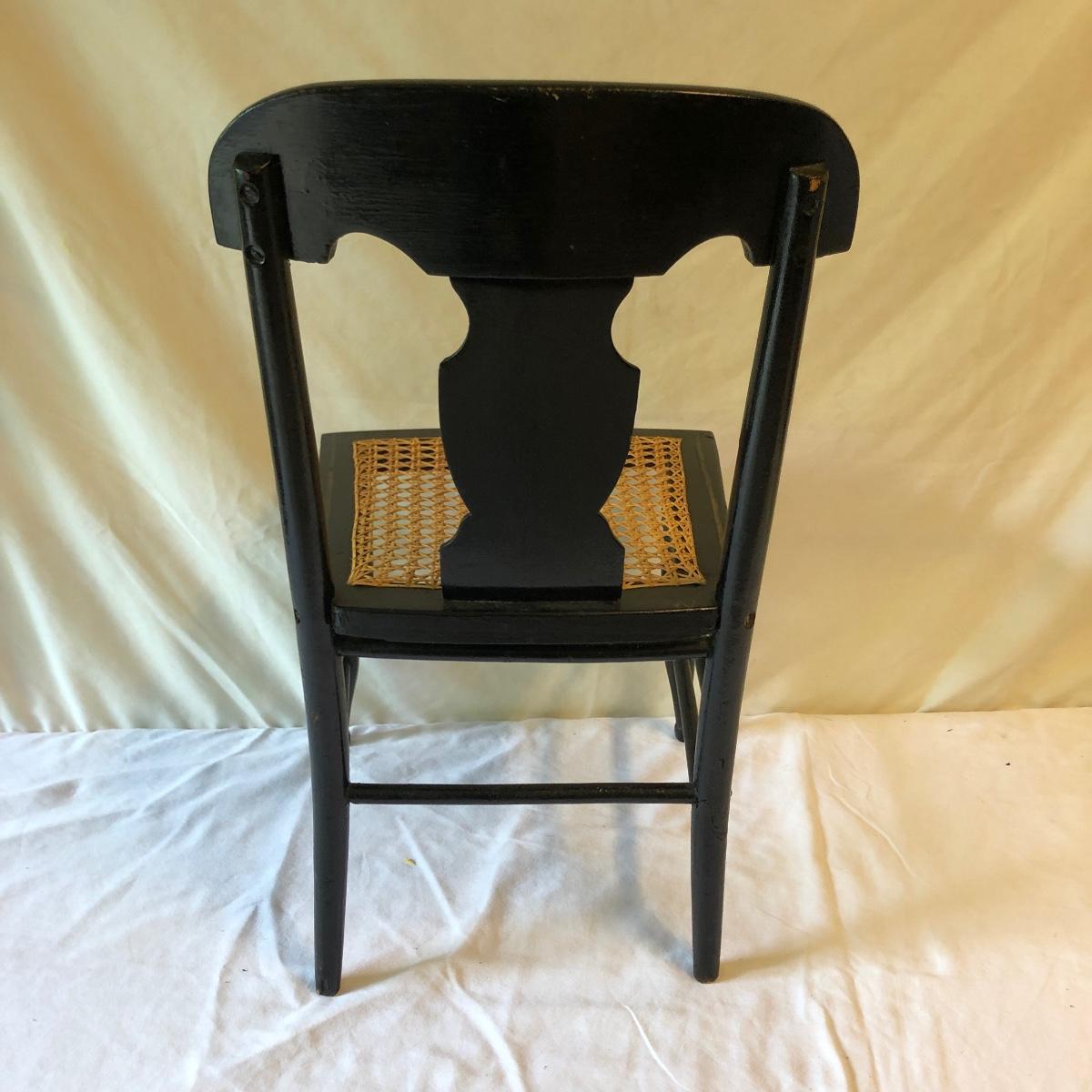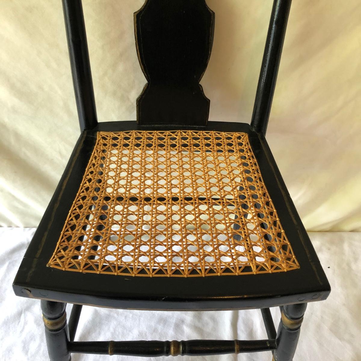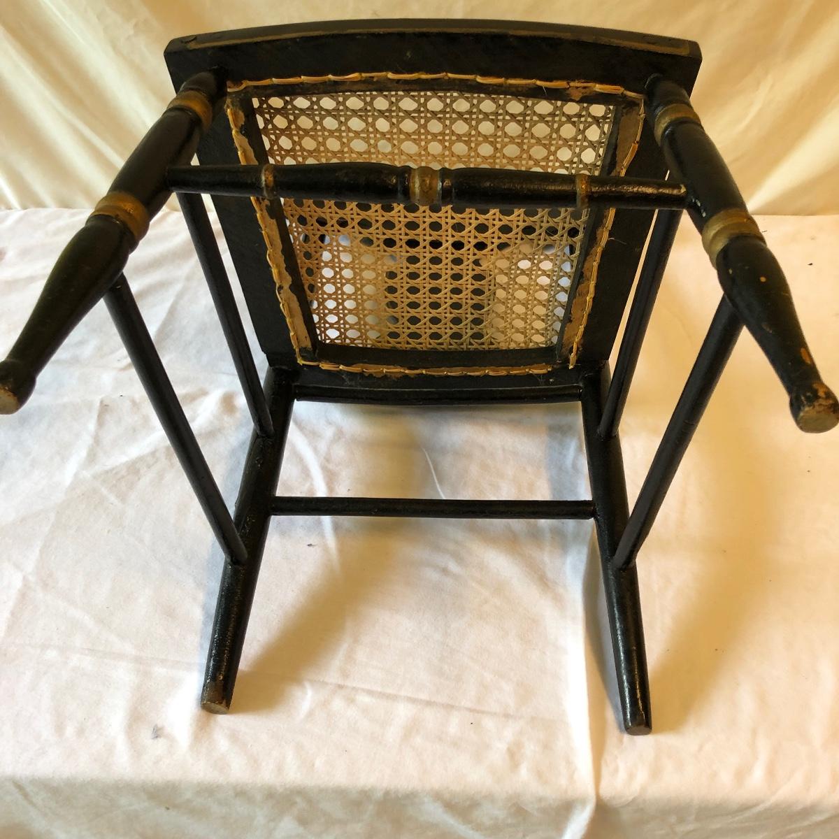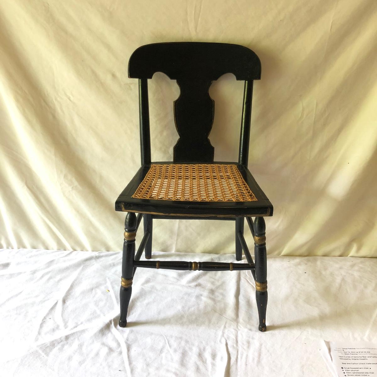 Lot includes a black wooden cane bottom chair with gold colored accent paint. Chair has been repaired on one leg, but is still sturdy, see pictures. Chair measures 15.5” x 16” x 28” with a seat height of 14.5”.